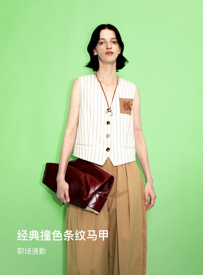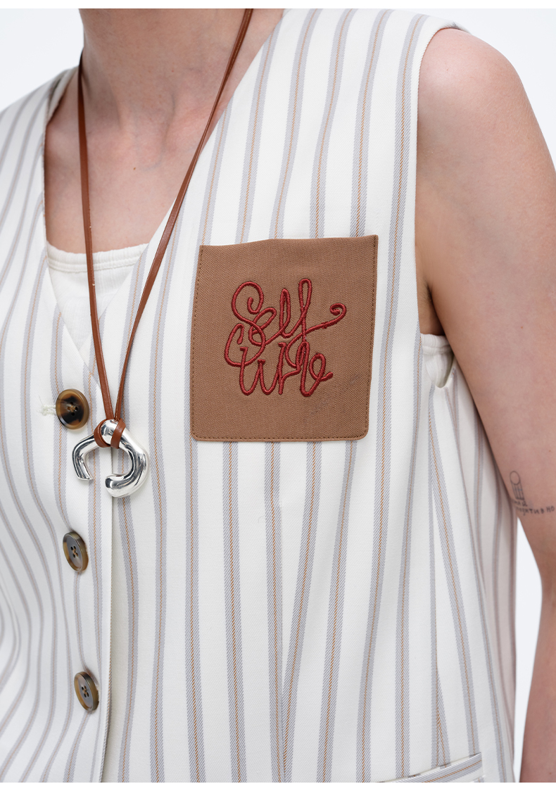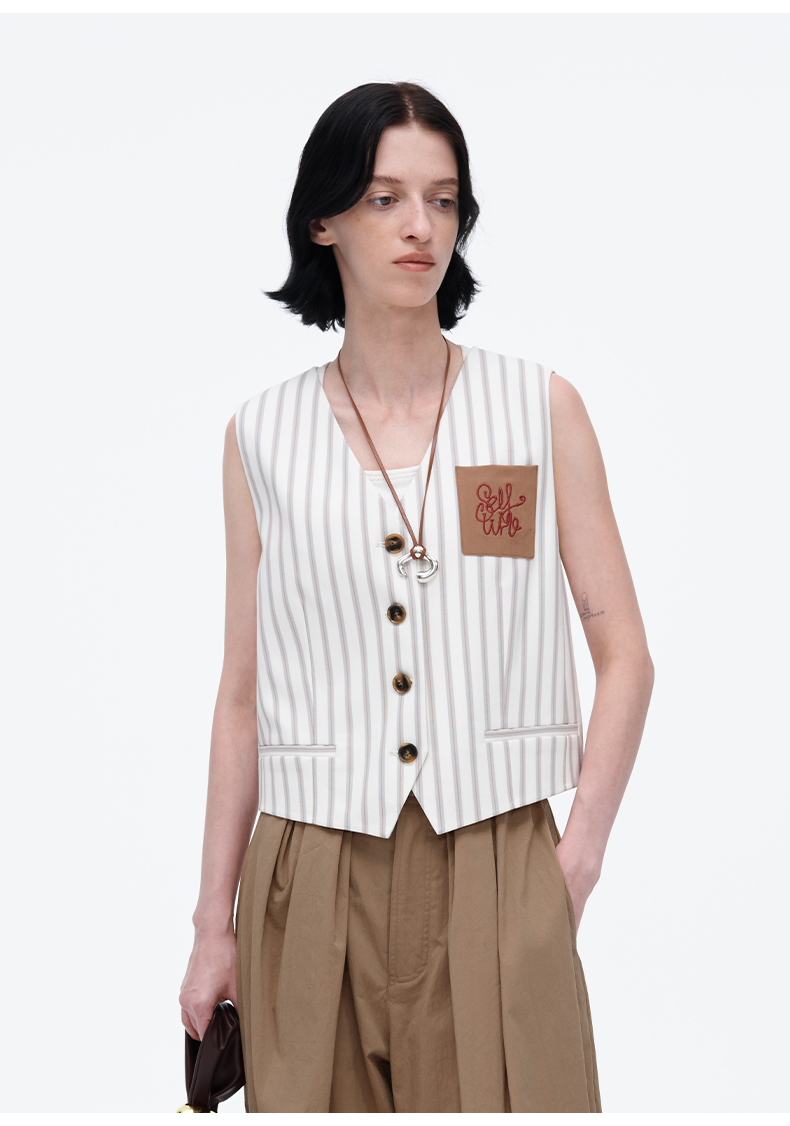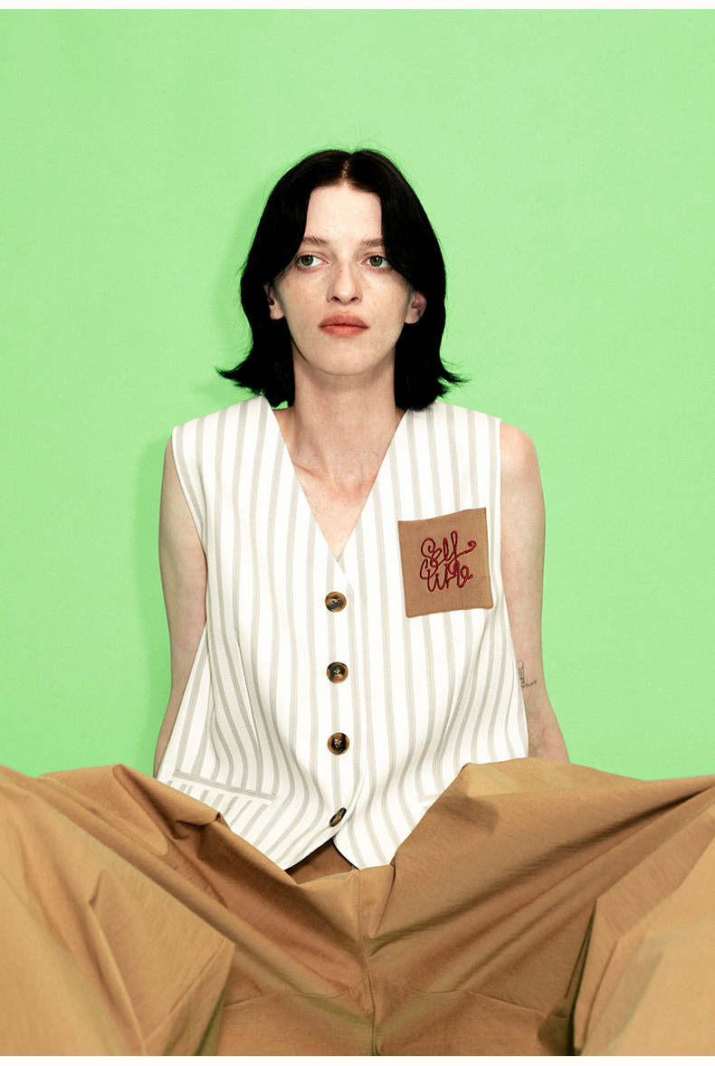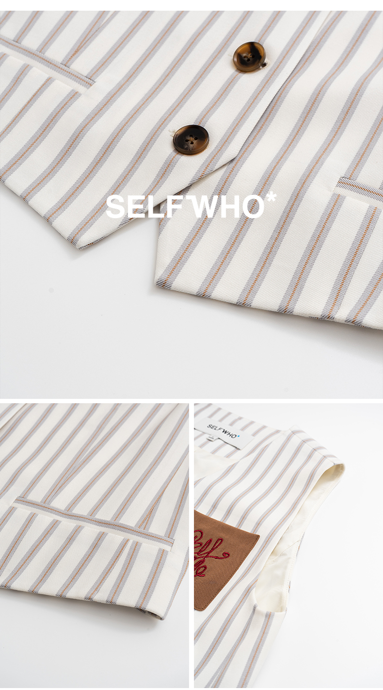 SELFWHO米白条纹背心马甲女2025春季新款V领气质宽松百搭减龄马夹