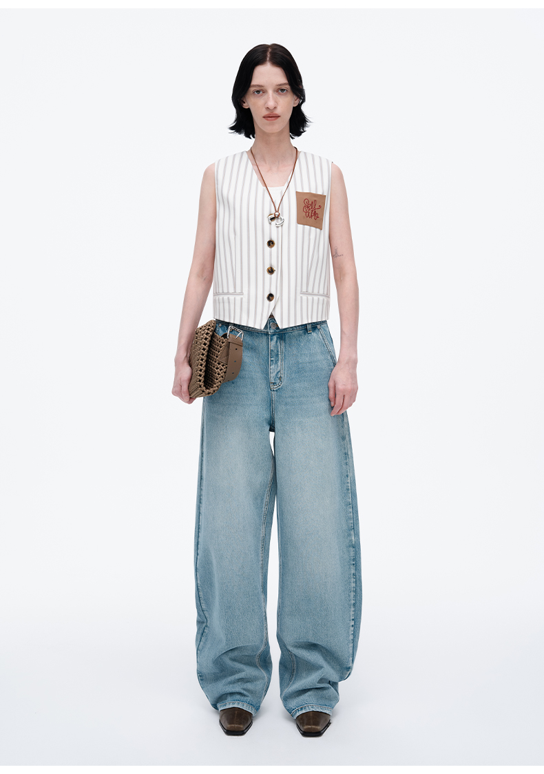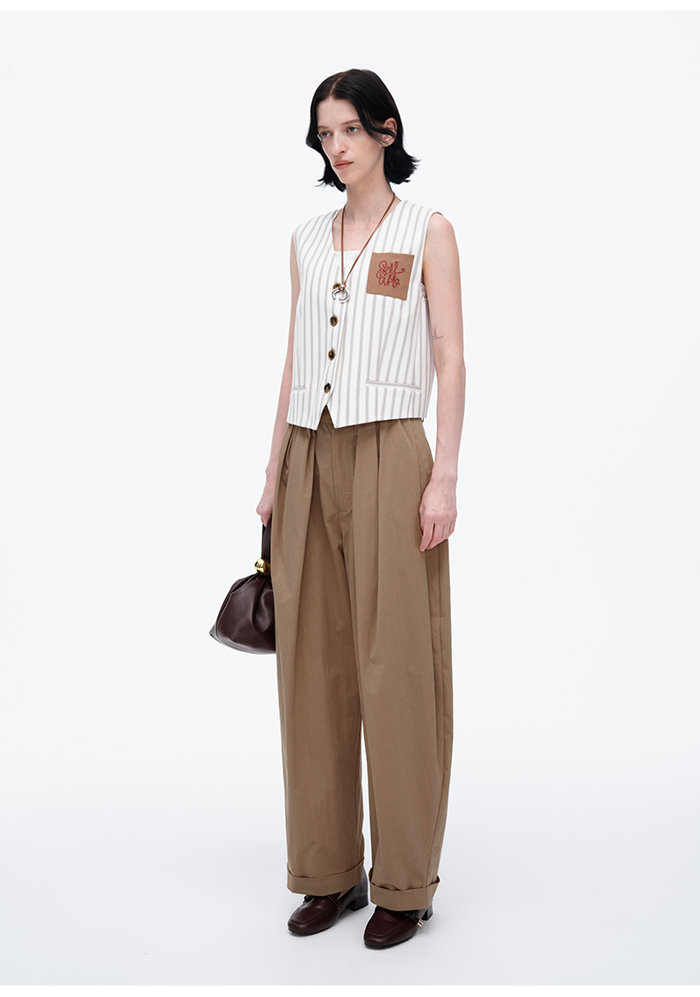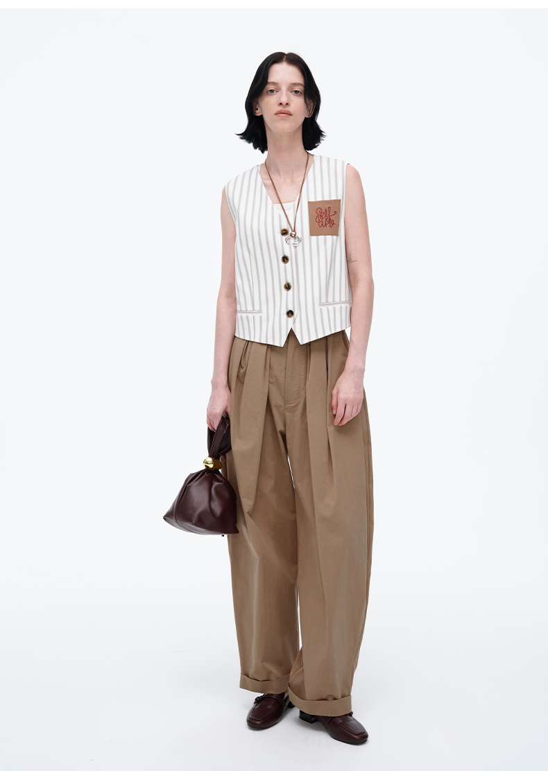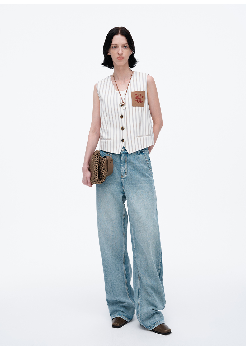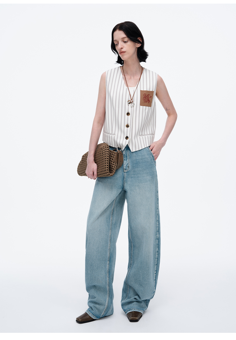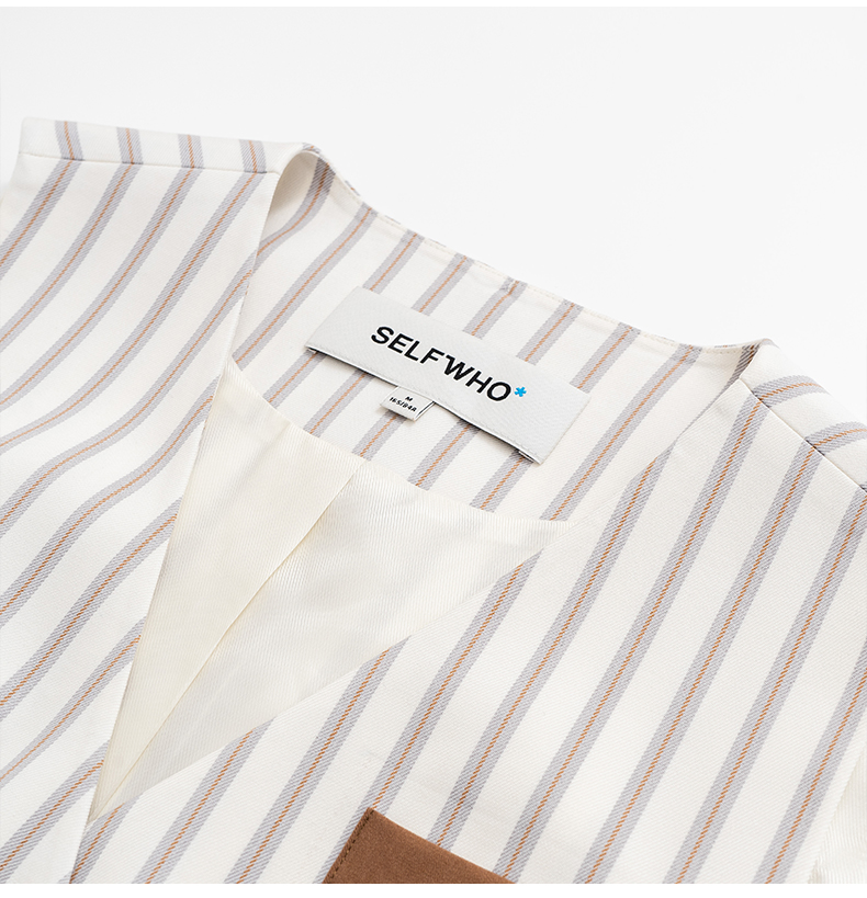 SELFWHO米白条纹背心马甲女2025春季新款V领气质宽松百搭减龄马夹