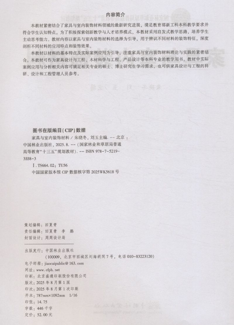 E家具与室内装饰材料 &3338 国家林业和草原局十三五规划教材 家具与室内装饰材料 朱晓冬主编 家具设计/产品设计专业教材 理论实践结合 含案例分析 高校教学科研参考用书