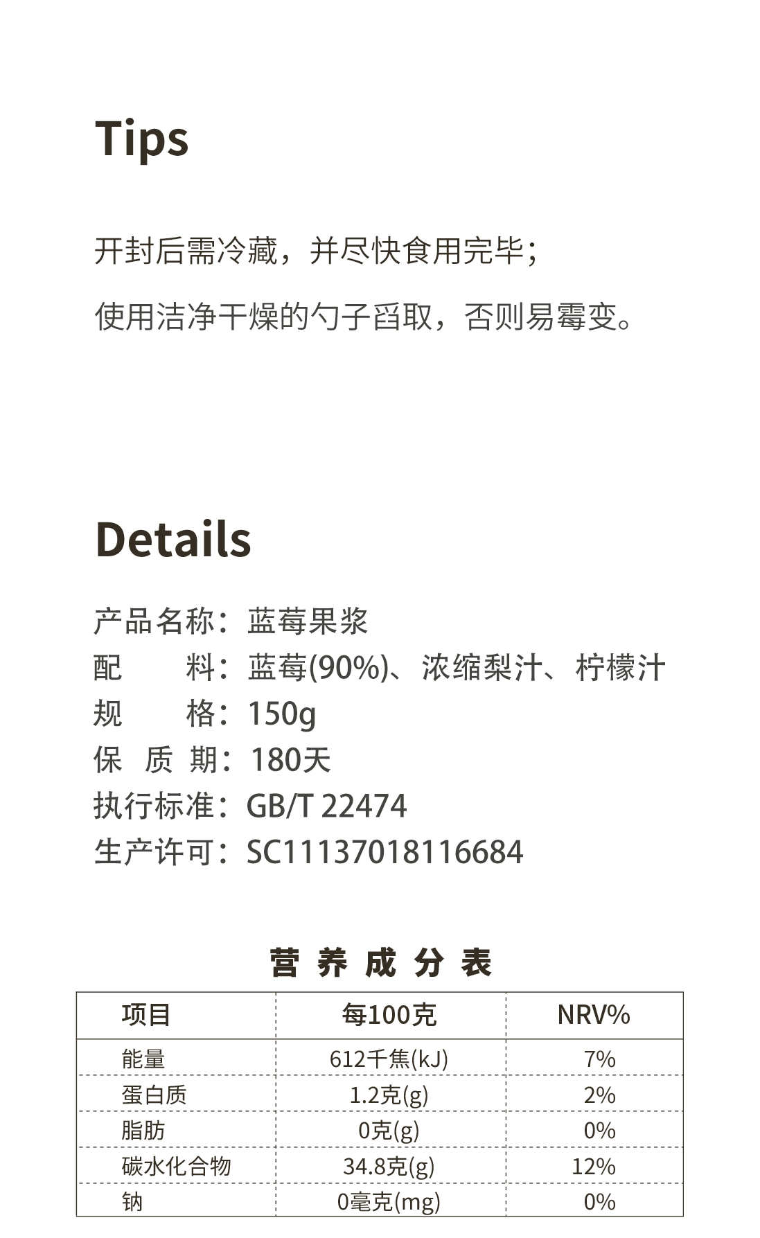 严选 | 蓝莓果酱 果肉含量≥90% 150g/瓶 不添加白砂糖或代糖 不添加一滴水