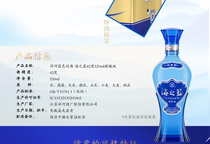 【推荐】洋河蓝色经典 海之蓝 52度 整箱装高度白酒 480ml*6瓶(内含3个礼袋) 口感绵柔浓香型(新老包装随机发货)