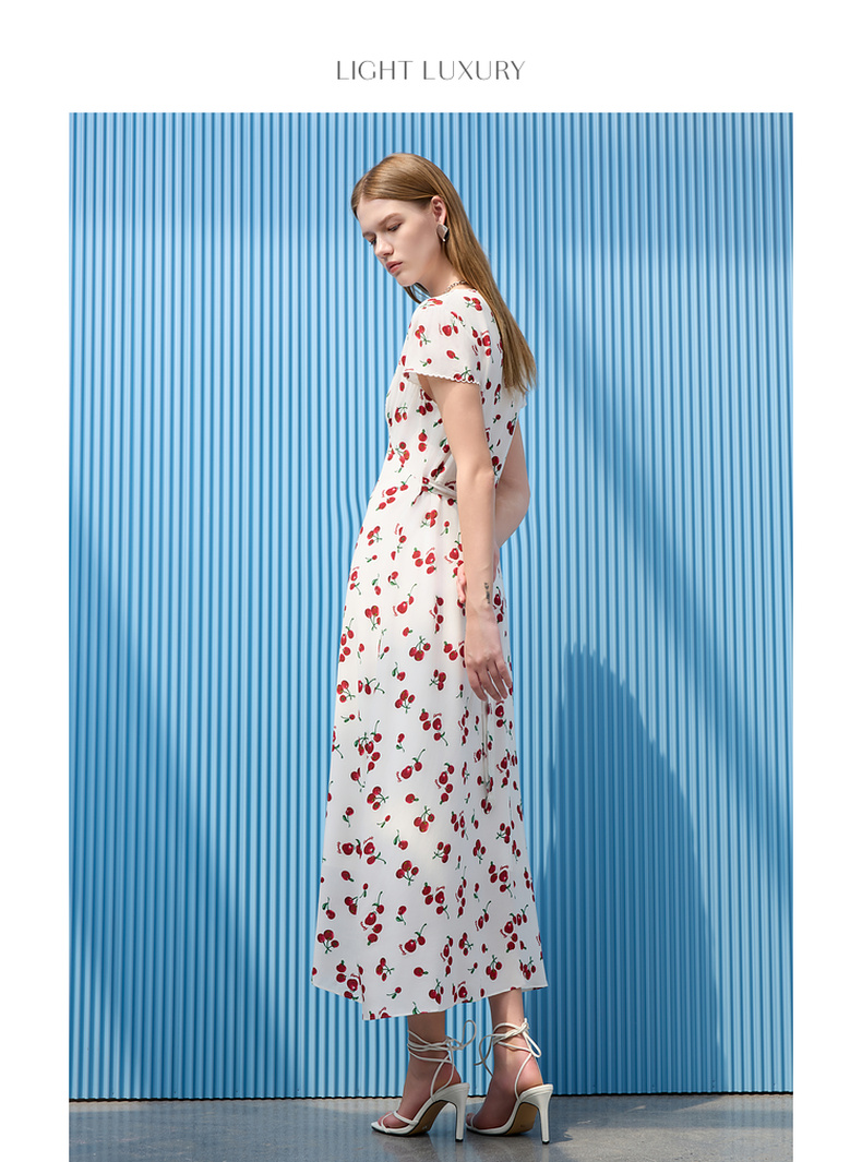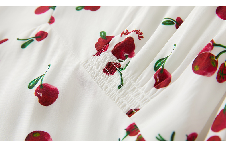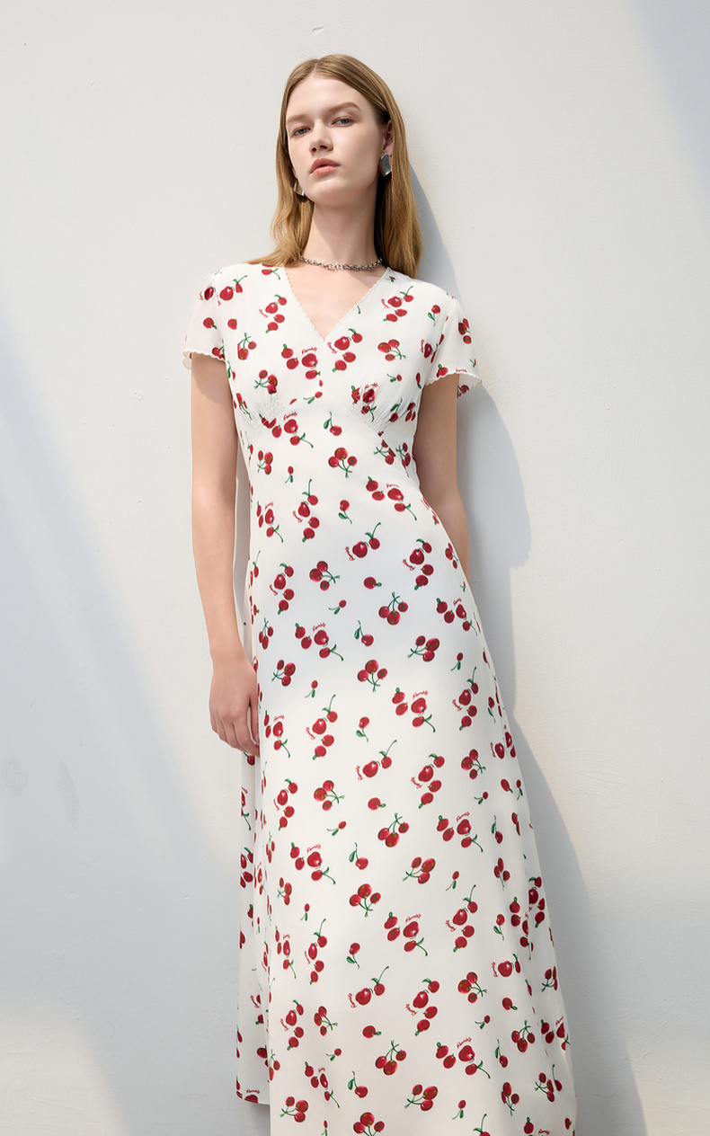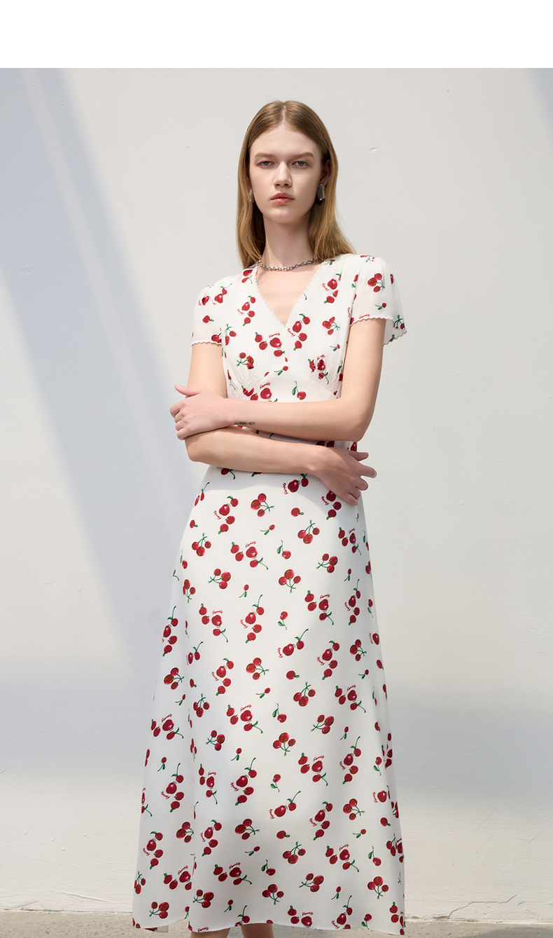 三彩2025夏季新款樱桃连衣裙V领收腰A字裙短袖长裙复古优雅S