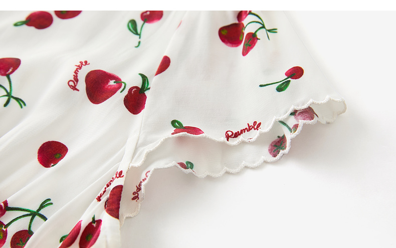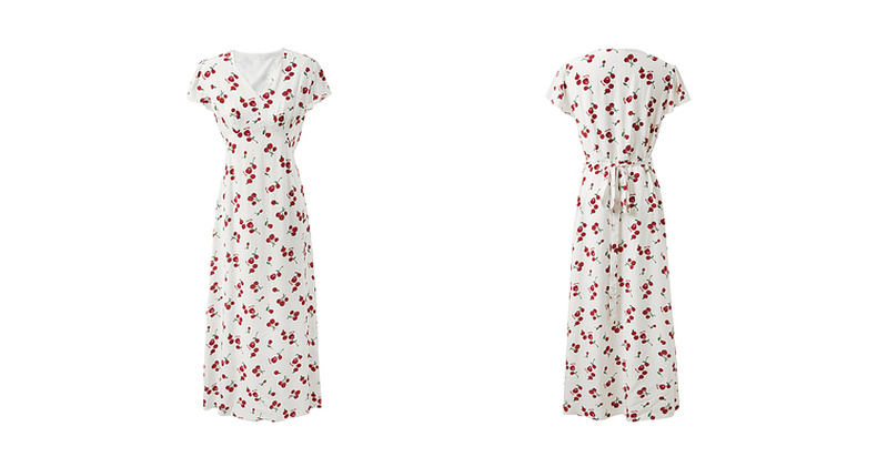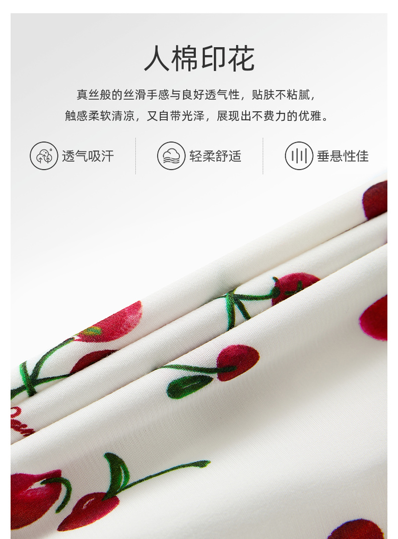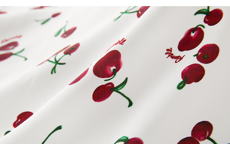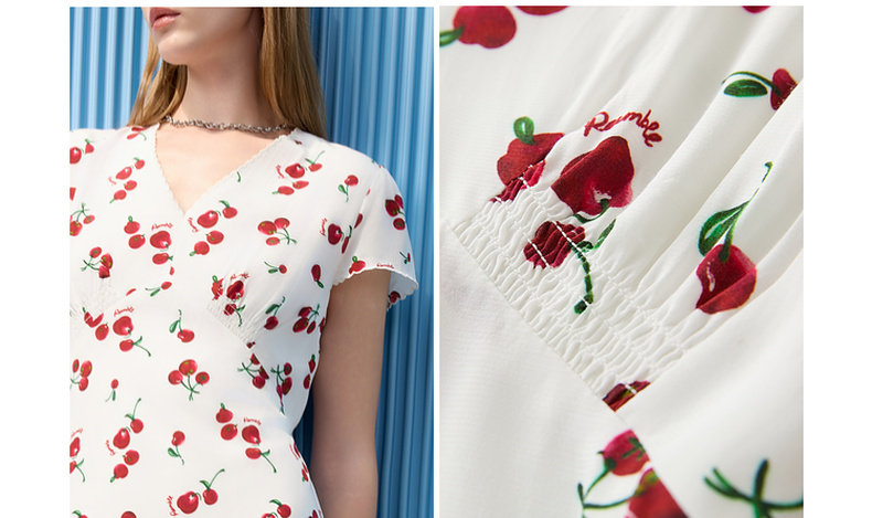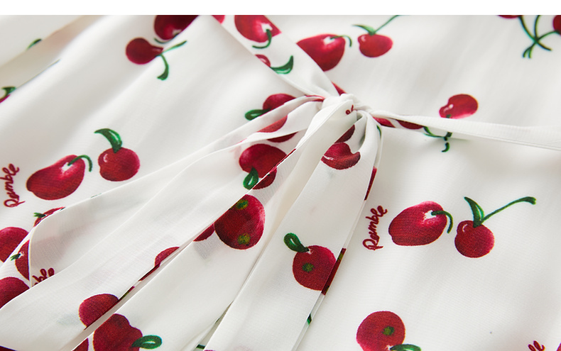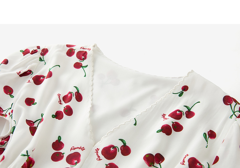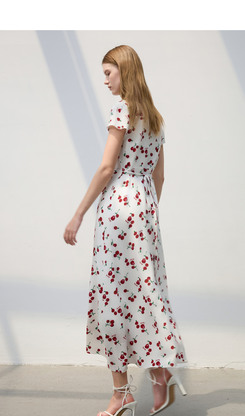 三彩2025夏季新款樱桃连衣裙V领收腰A字裙短袖长裙复古优雅S