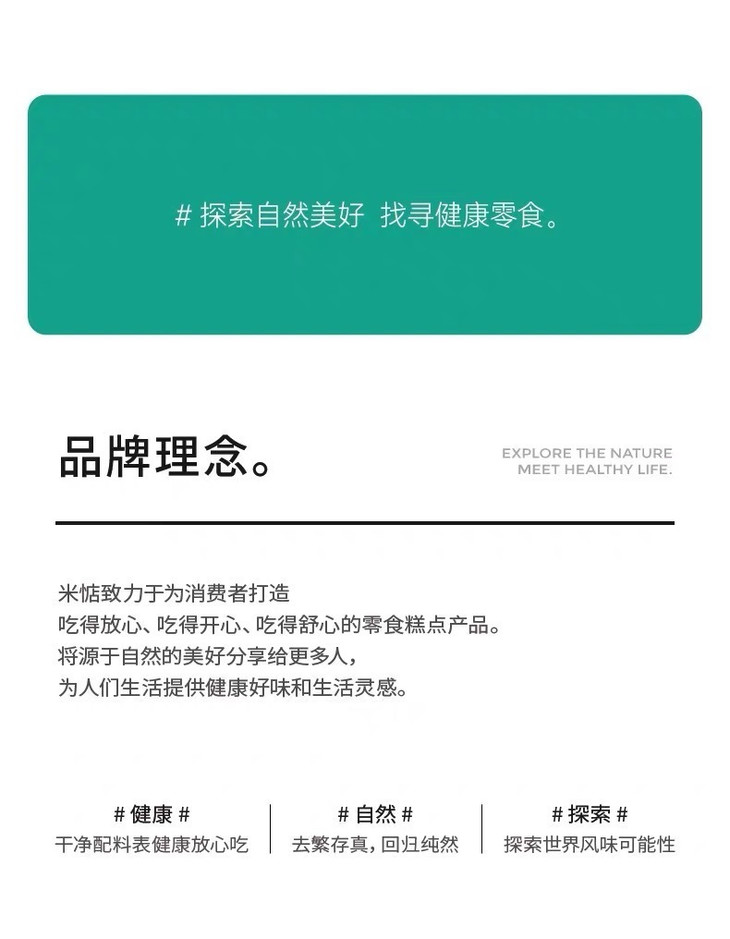 ✔米惦,以找寻和分享健康零食而来,秉持着低添加甚至无添加的产品理念,致力于为每个人提供更安心的美味。 ✔我们为打破“零食是不健康的”固有认知而来,成立至今,已销售8000万袋,深受年轻一代的喜欢和认可。 ✔在坚持健康零食上,我们不止步于好吃,而是研发更有趣好玩,更高品质高颜值的产品,为每个人带来好吃好玩的零食生活体验。