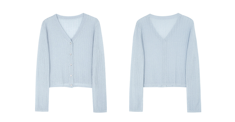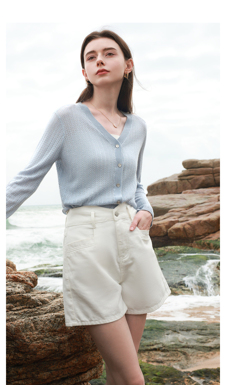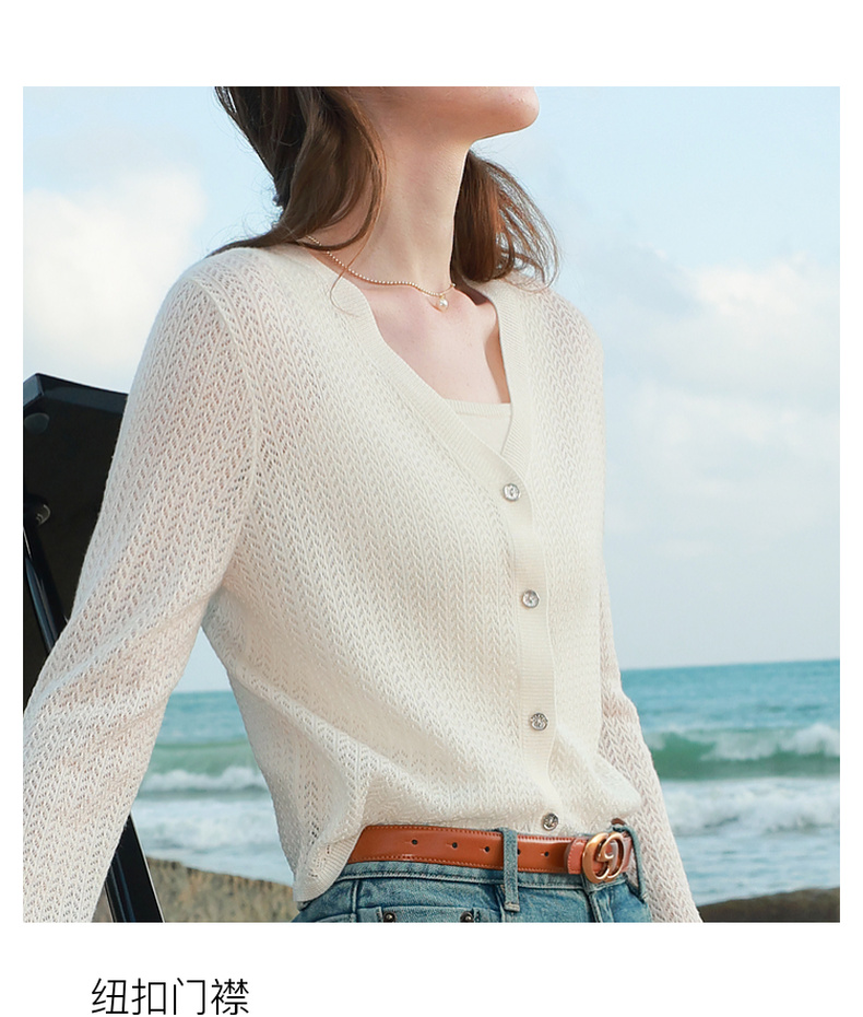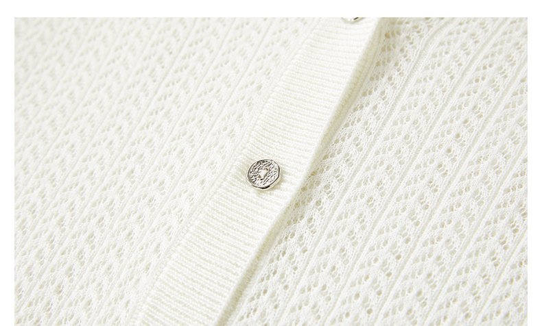三彩2025夏季新款镂空针织衫V领轻薄毛衫外套短款开衫简约罩衫M