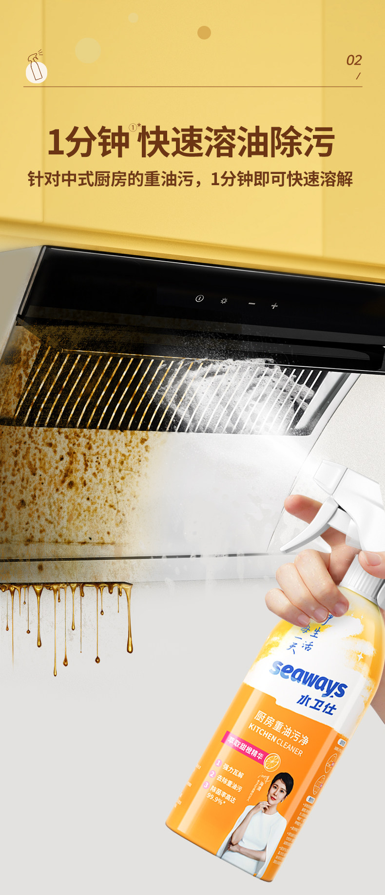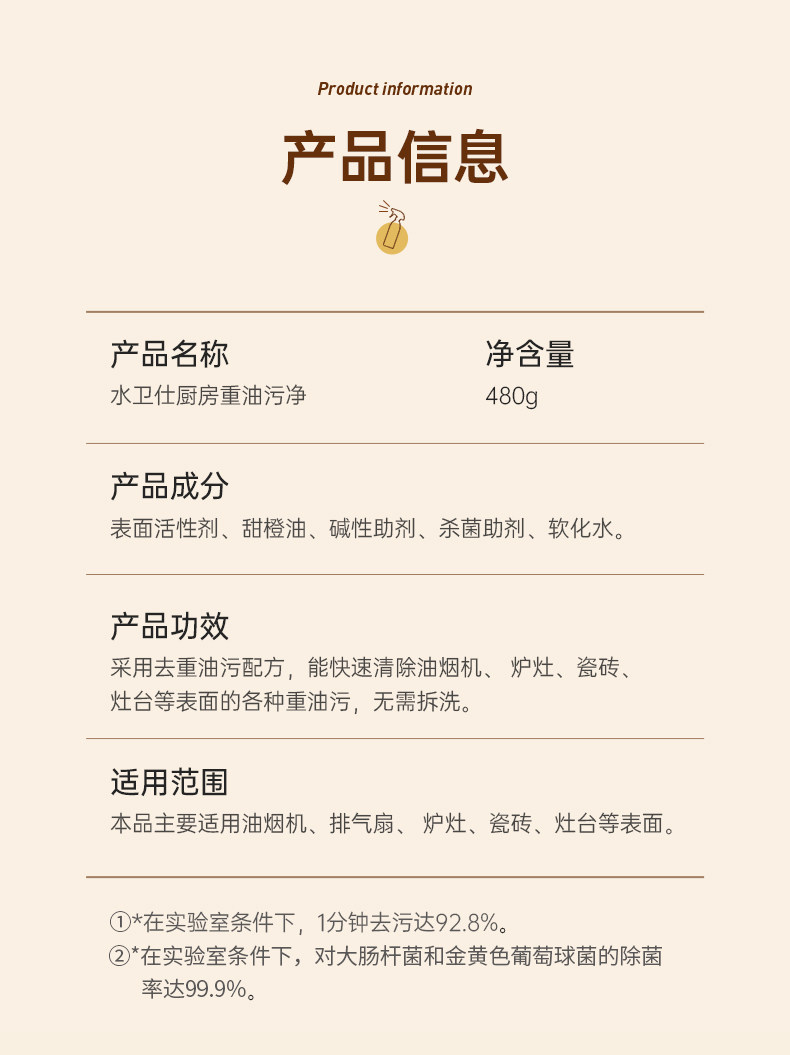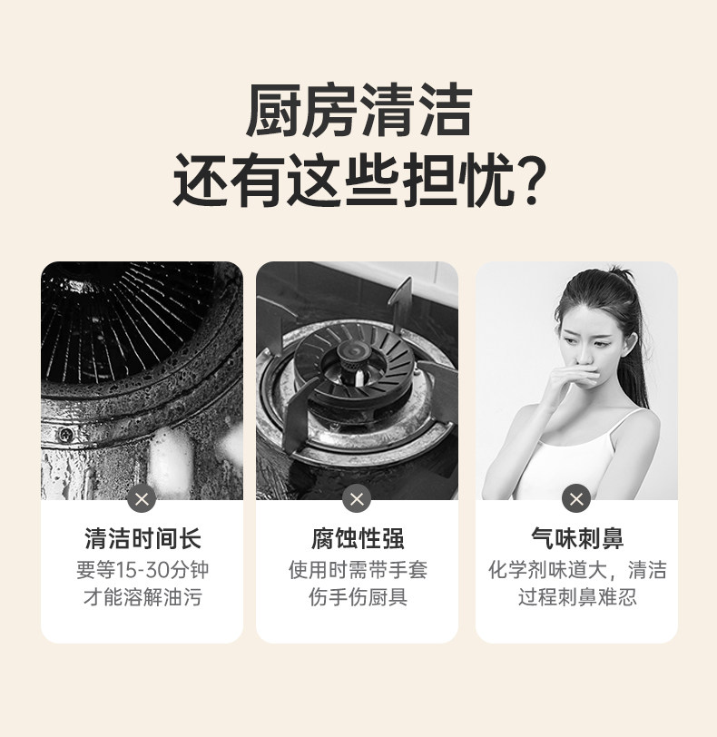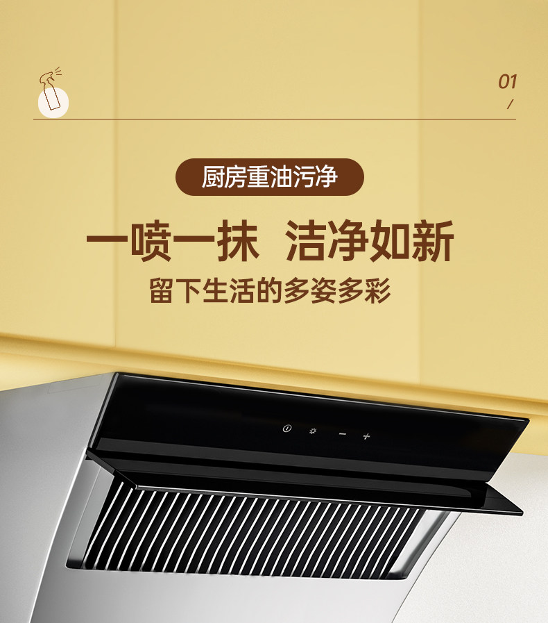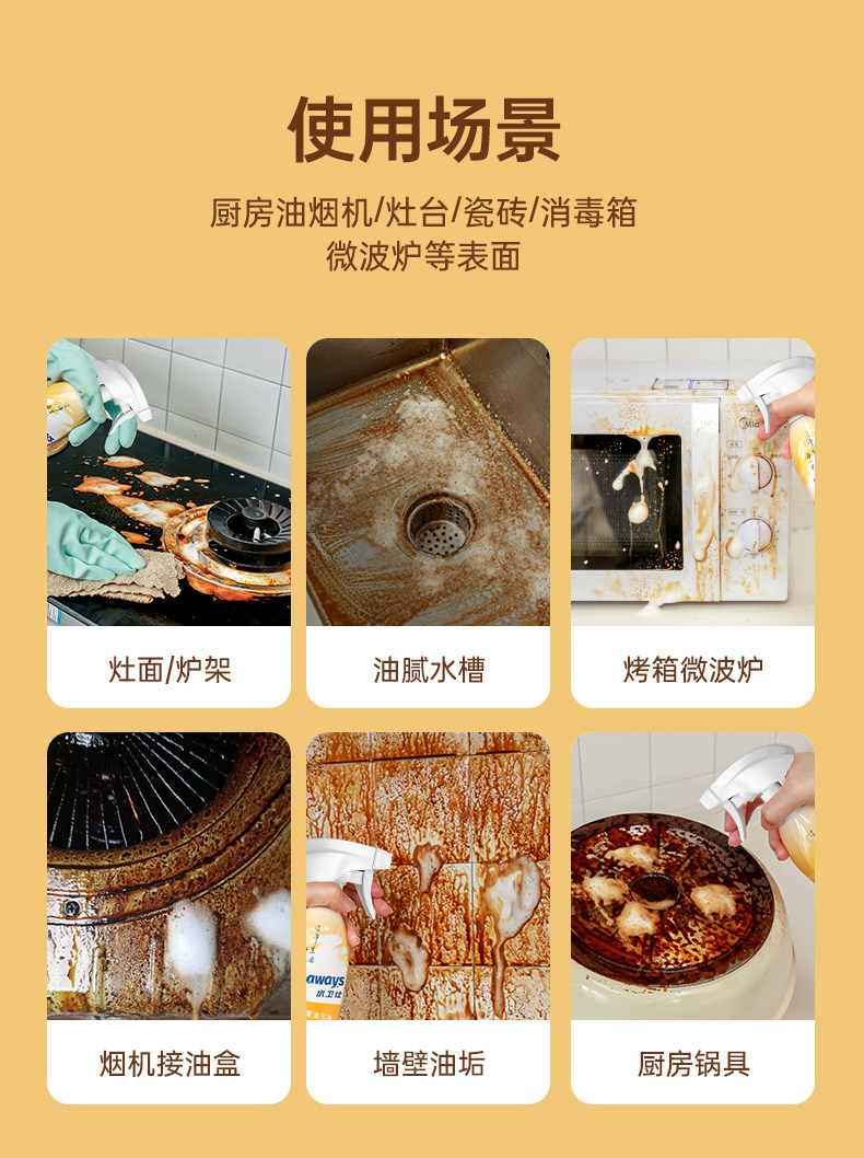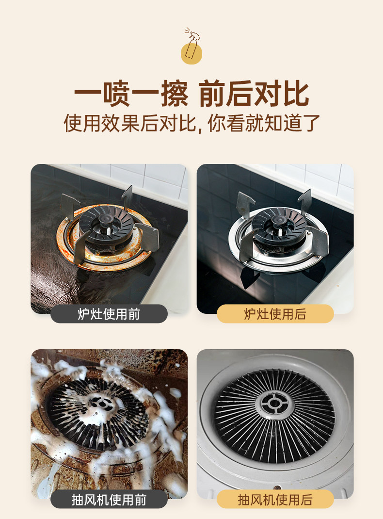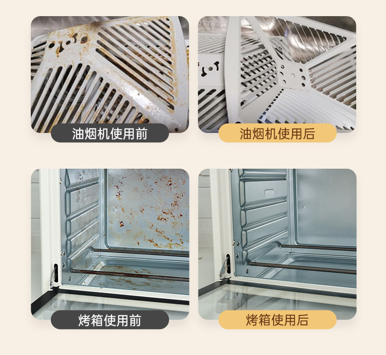 【使用场景】清洁油烟机、灶台、蒸烤箱、排气扇等重油污