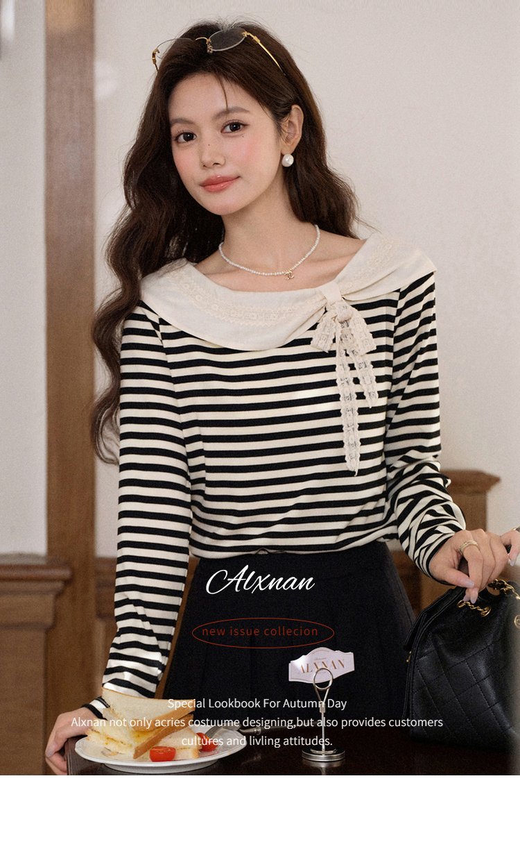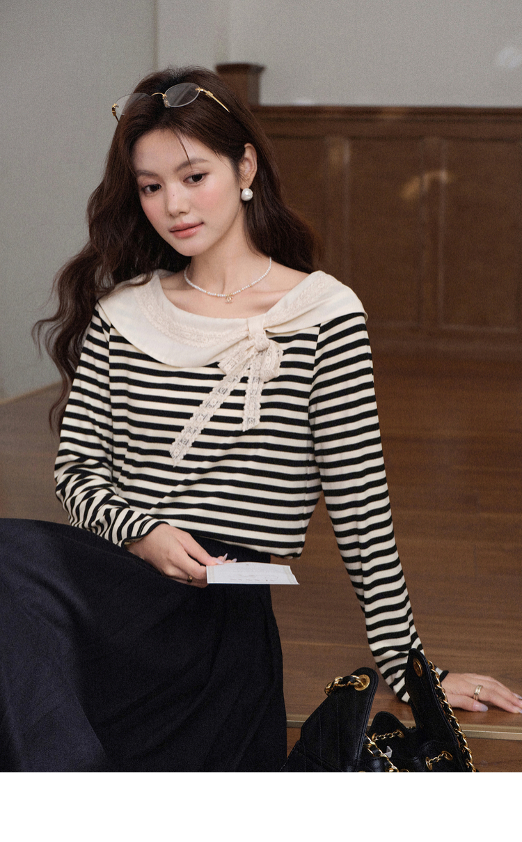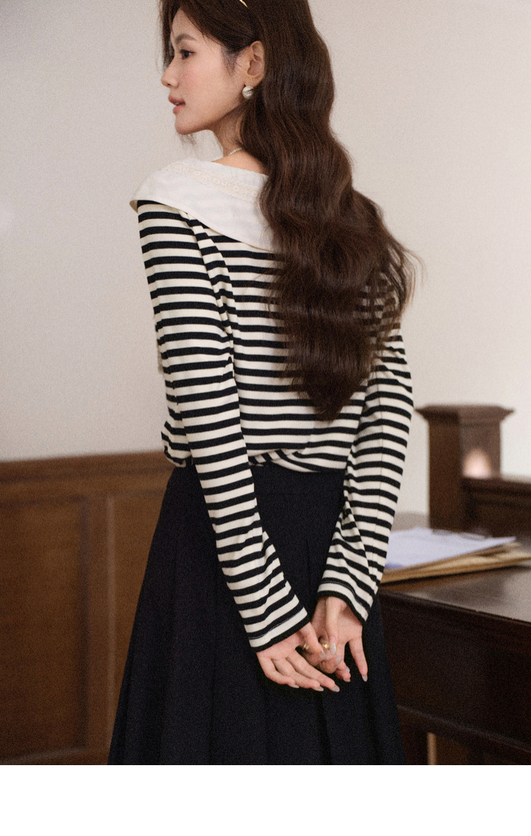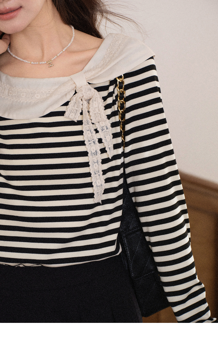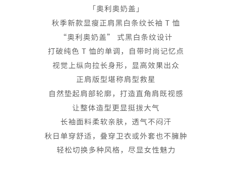 鹿向南「奥利奥奶盖」黑白条纹长袖T恤女秋新款法式显瘦正肩上衣L559112-1