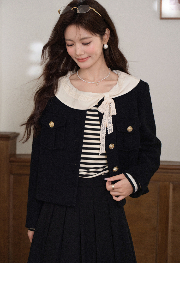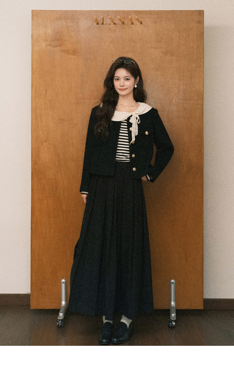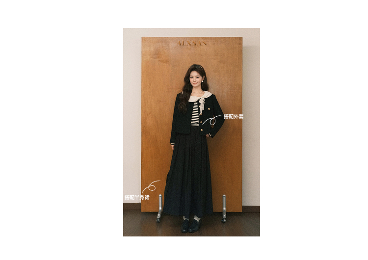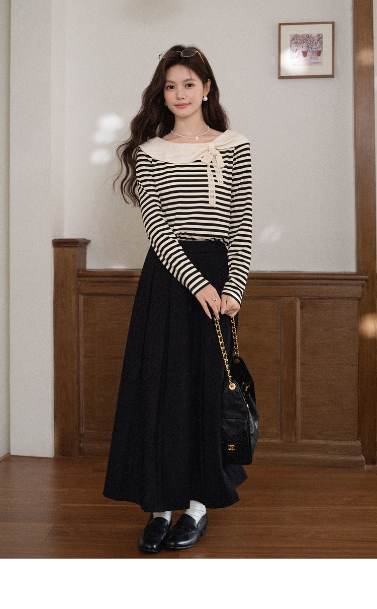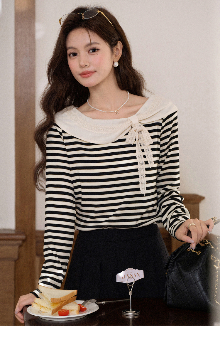 鹿向南「奥利奥奶盖」黑白条纹长袖T恤女秋新款法式显瘦正肩上衣L559112-1