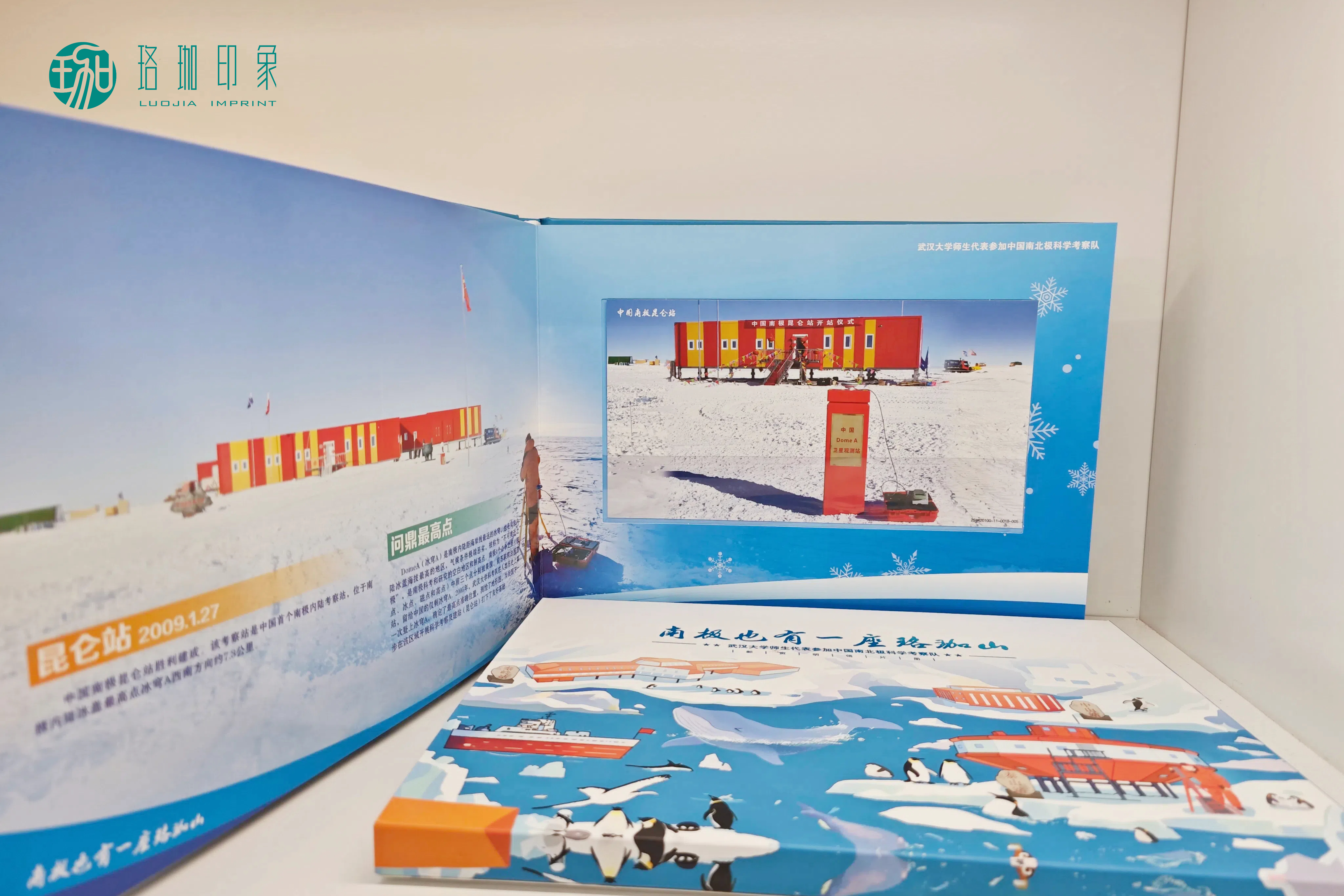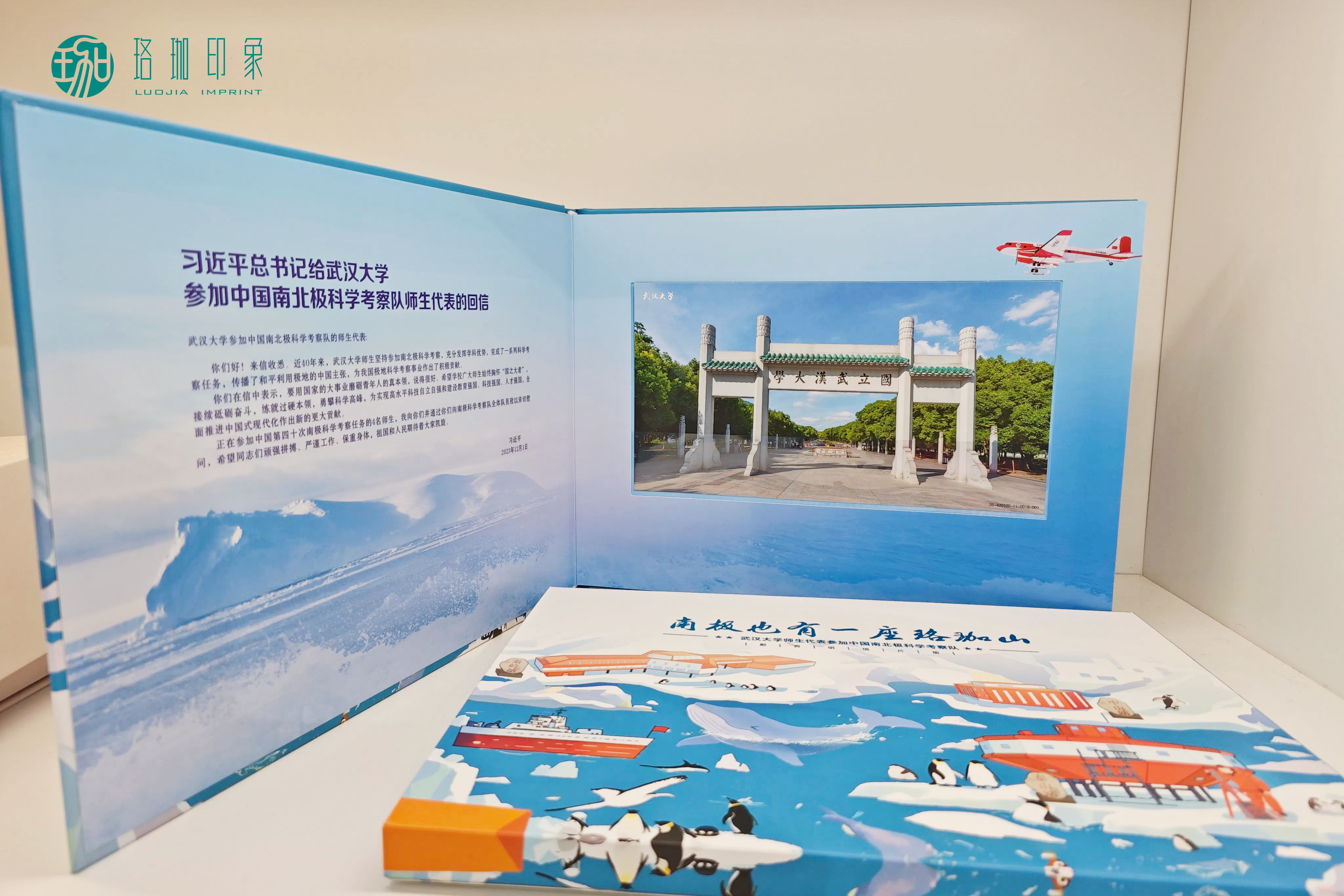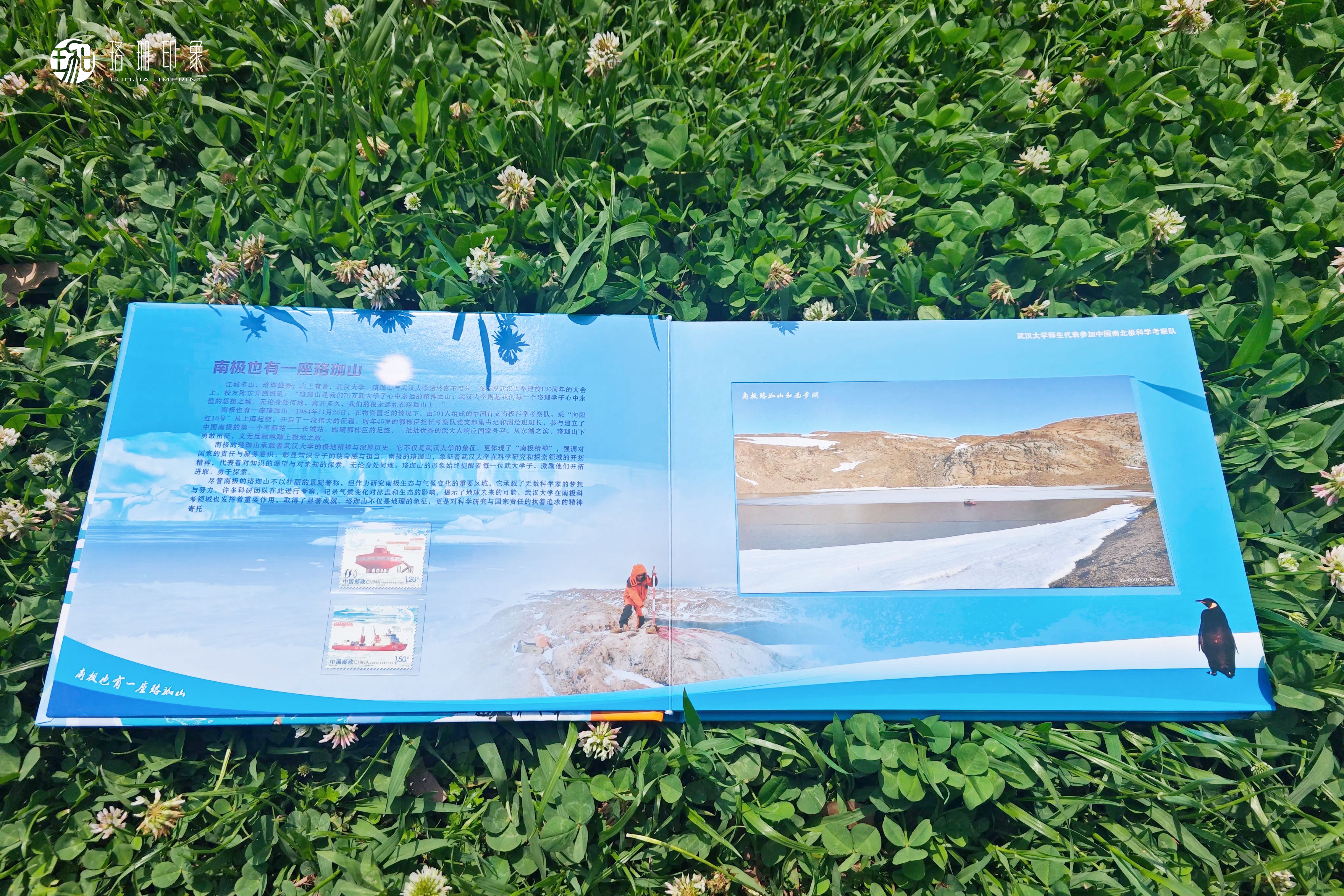 珞珈印象联合中国邮政集团公司武汉市武昌区分公司、武汉大学中国南极测绘研究中心、城市设计学院黄敏设计团队、数字文化与创意产业研究所,围绕武汉大学南极科考主题文化,推出专属个性化邮资明信片册及邮资邮折文创系列产品,是科学、历史、艺术与人文的交汇点,是武大科考的独家极地记忆。
