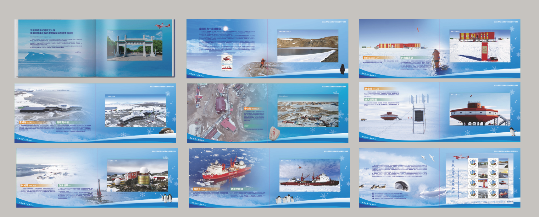 《南极也有一座珞珈山》邮资明信片册:以习近平书记回信为开篇,8张明信片,18枚邮票,每张明信片画面申请个性化邮票,通过方寸之间的叙事,将南极科考站点及珞珈山的荣耀时分转化为可触摸的文化符号。