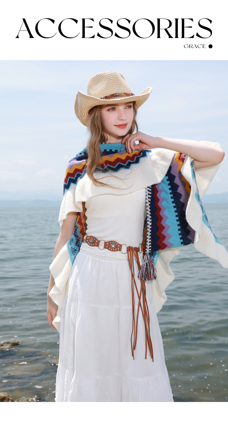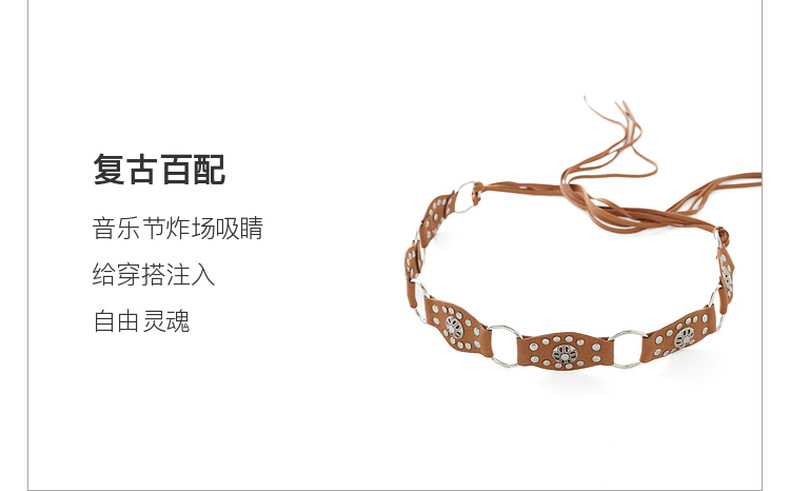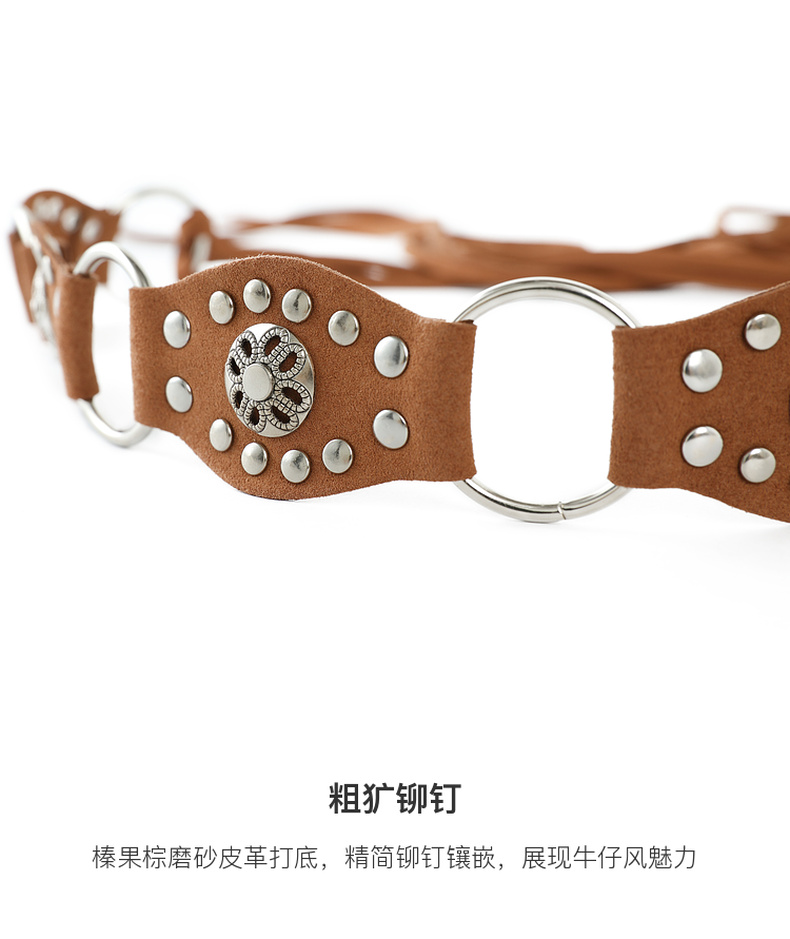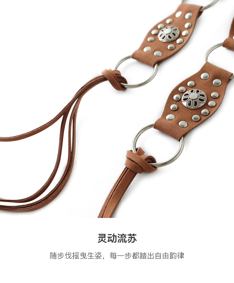 三彩2025新款波嬉风皮革腰带金属圆环雕花铆钉流苏西部牛仔风