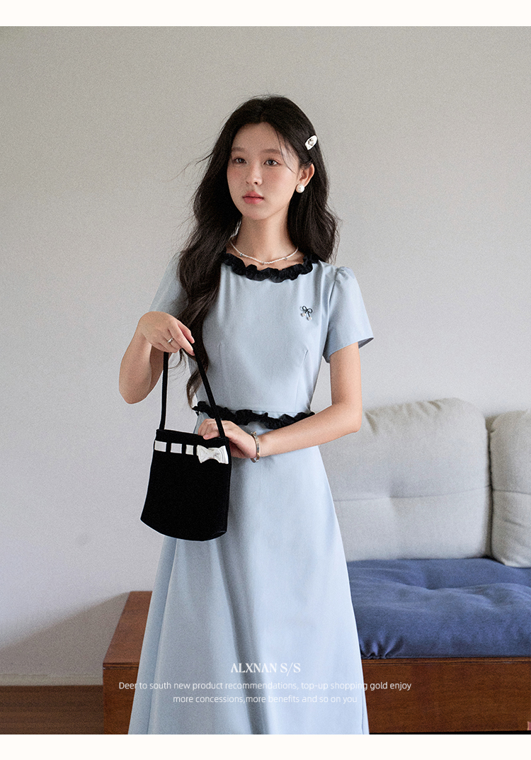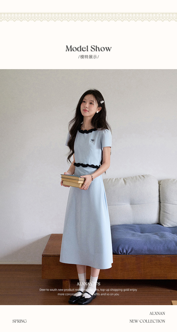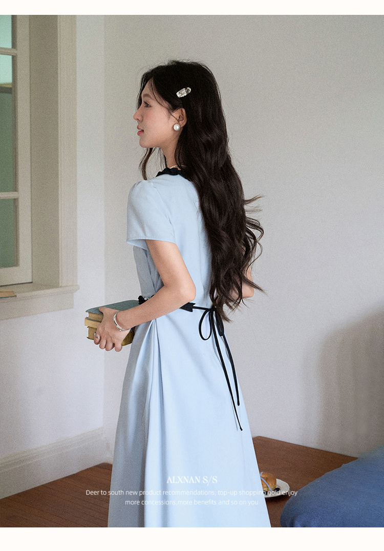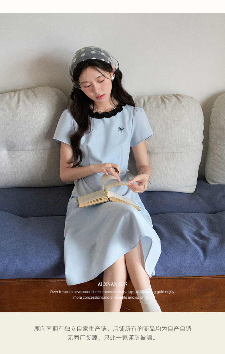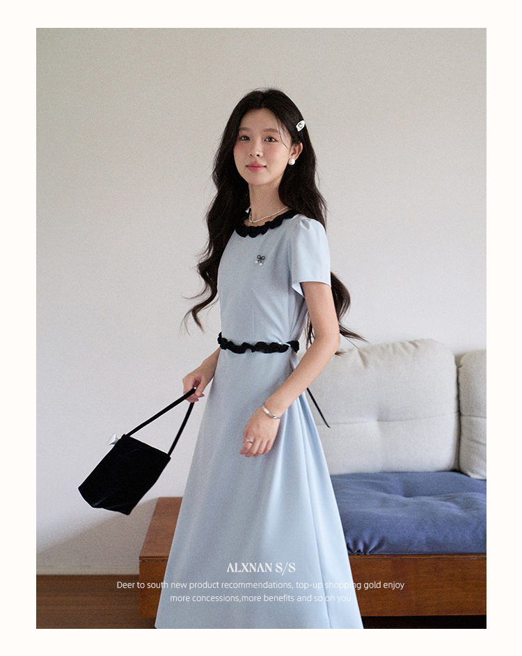 鹿向南「冰蓝岛语」法式短袖蓝色连衣裙女夏收腰气质漂亮长款裙子