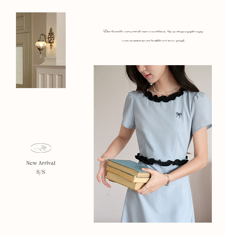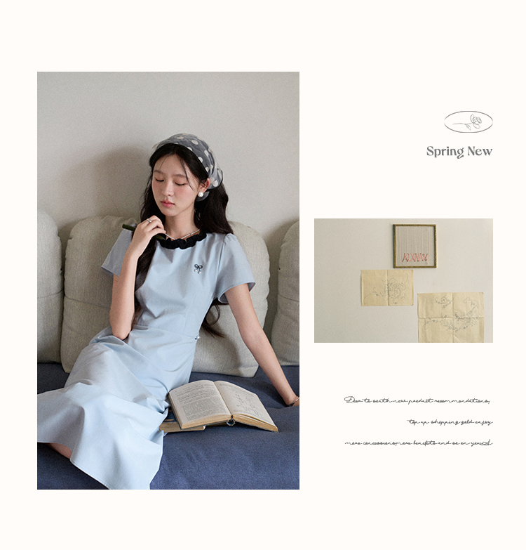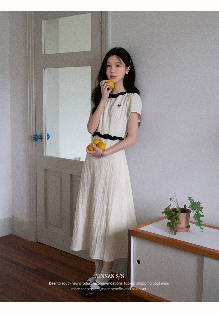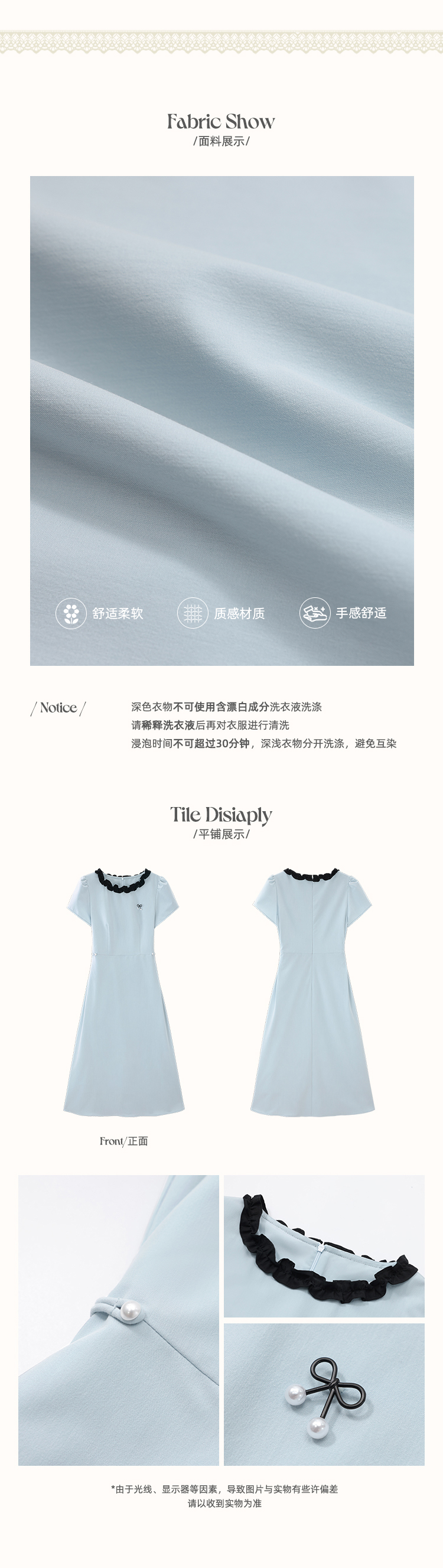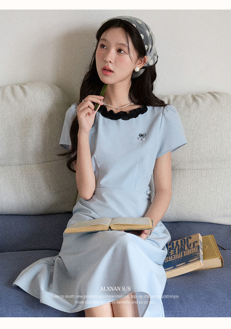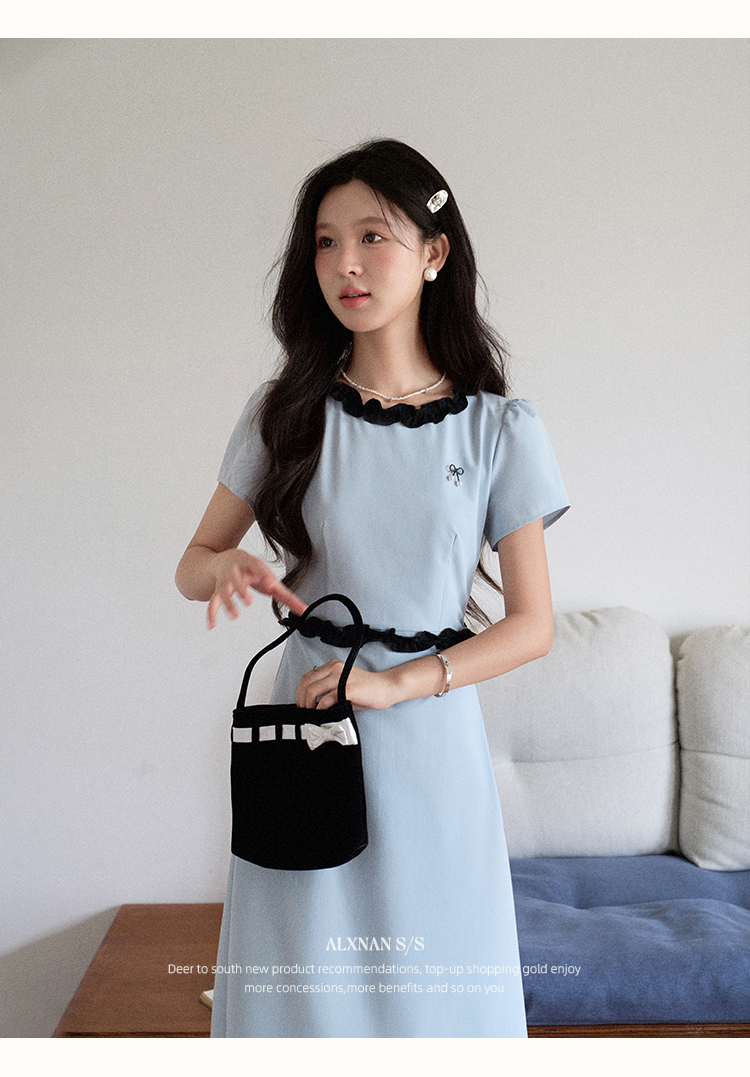 鹿向南「冰蓝岛语」法式短袖蓝色连衣裙女夏收腰气质漂亮长款裙子