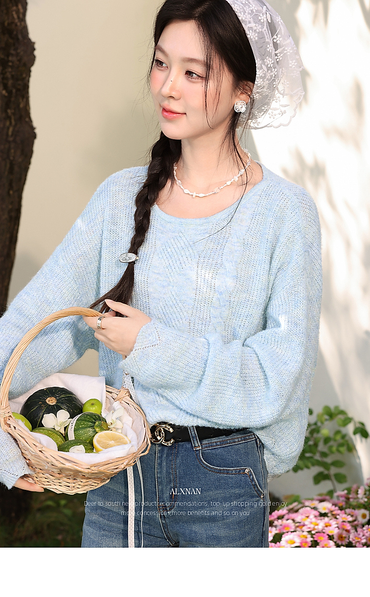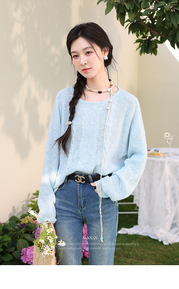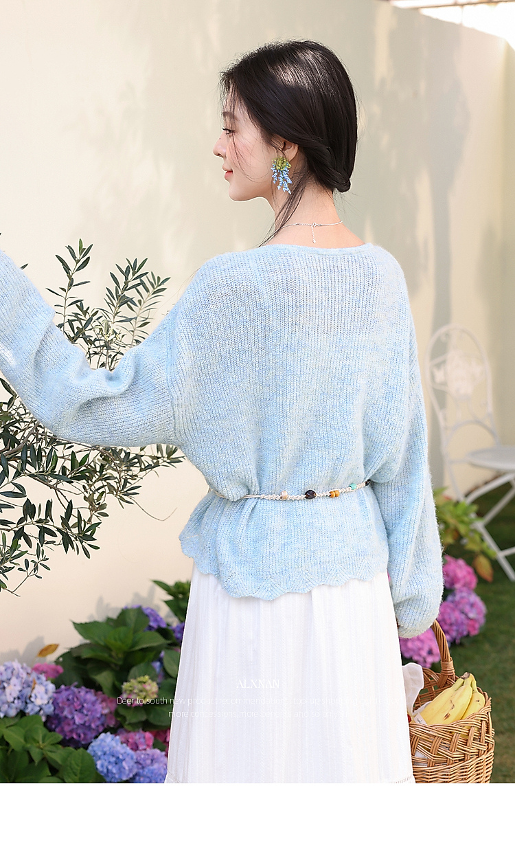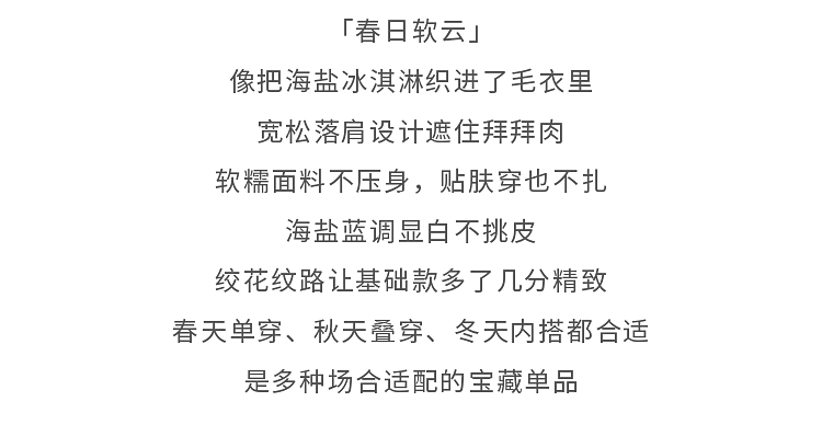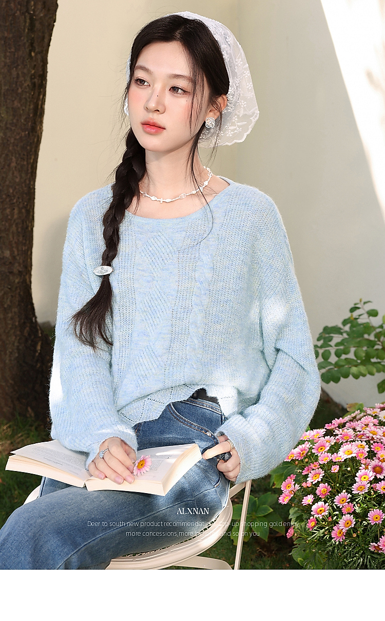 鹿向南「风信子」慵懒感蓝色针织衫女春季收腰显瘦圆领长袖上衣