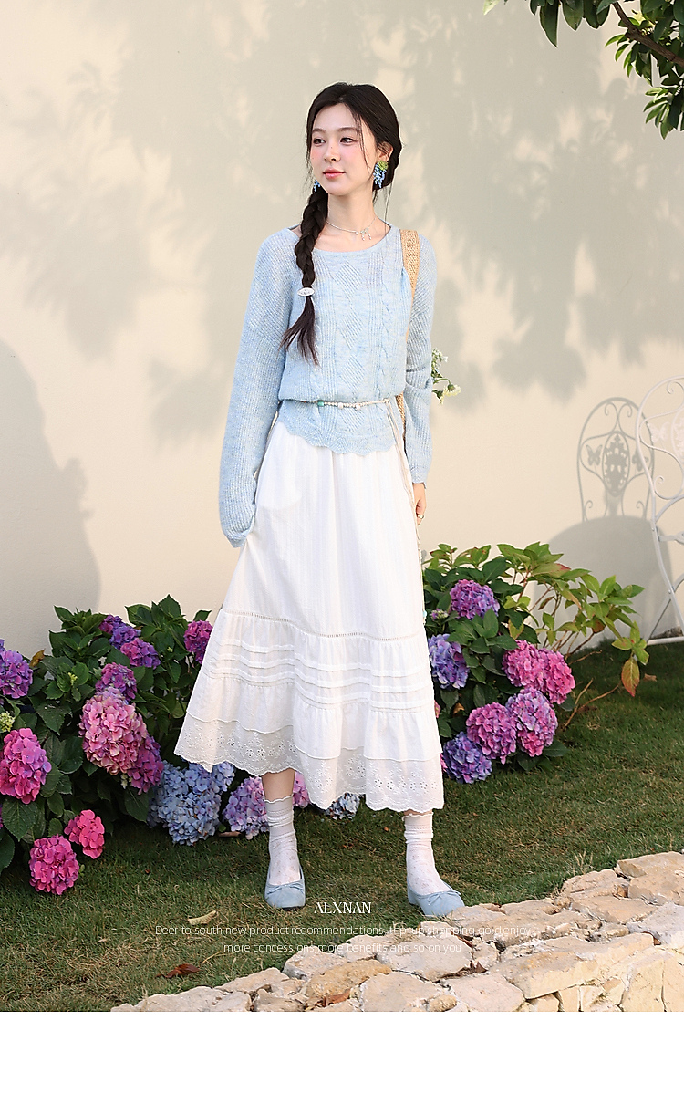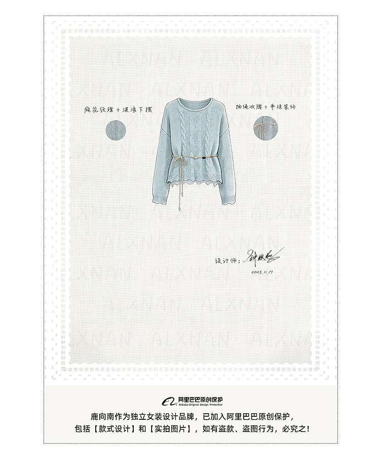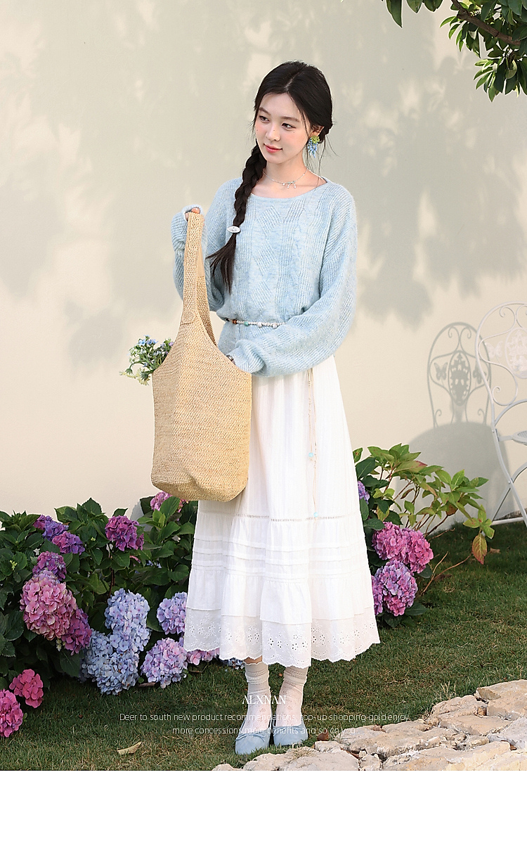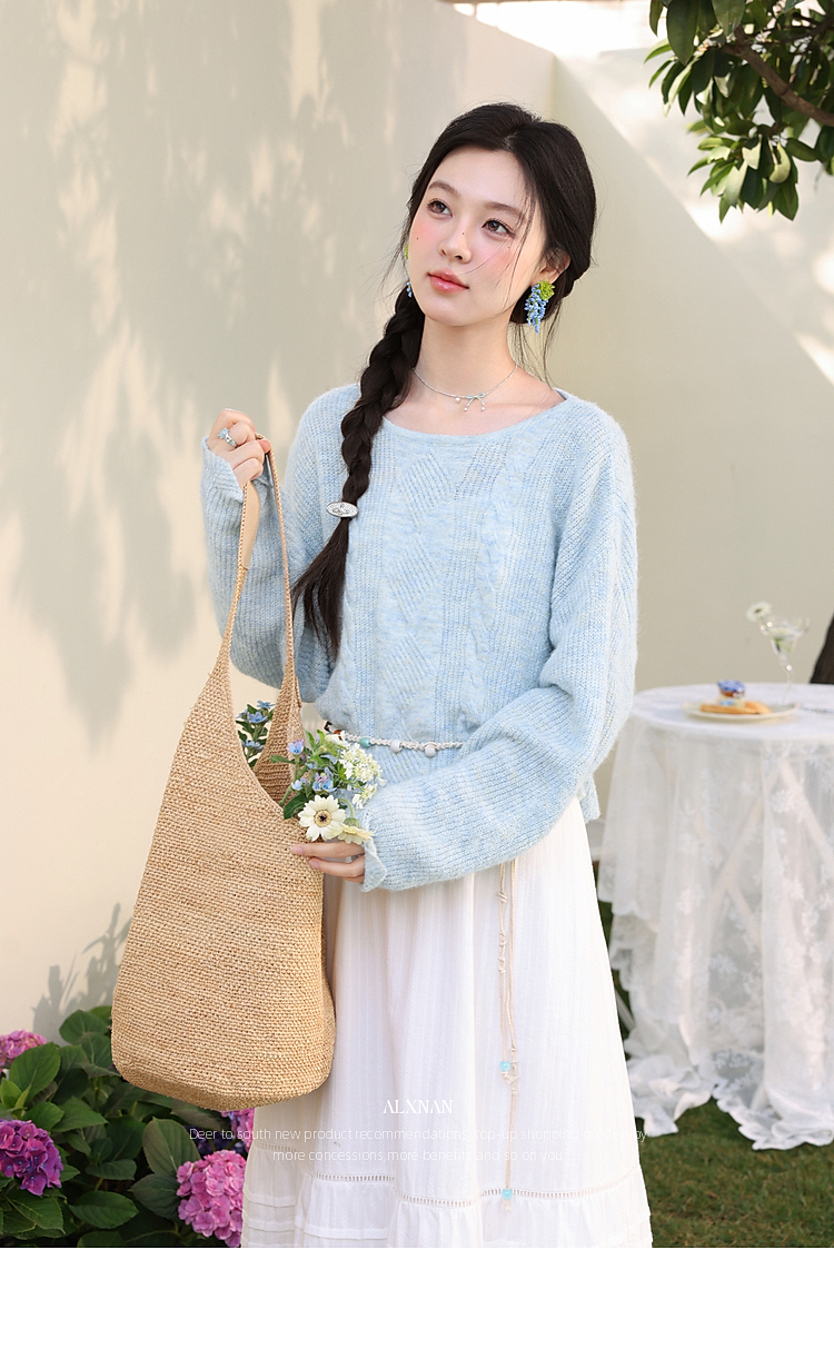 鹿向南「风信子」慵懒感蓝色针织衫女春季收腰显瘦圆领长袖上衣