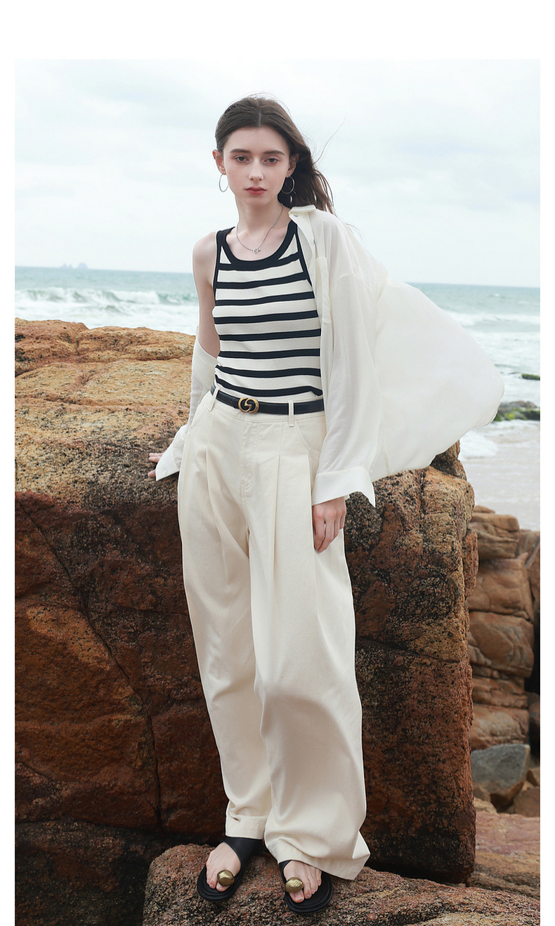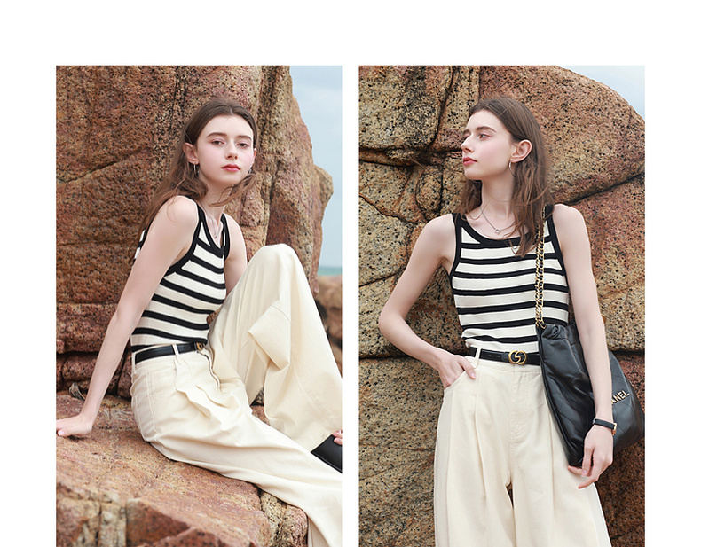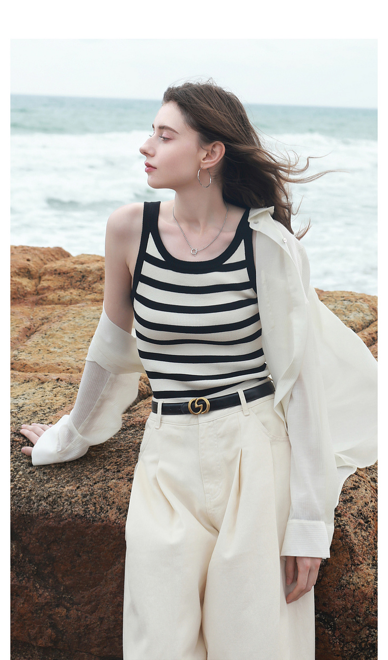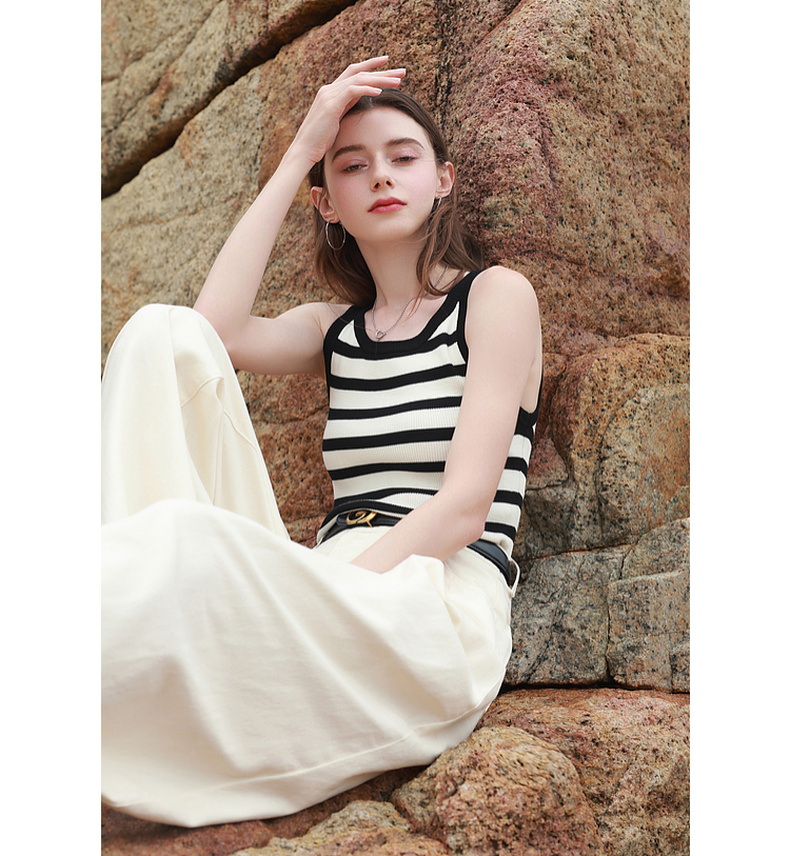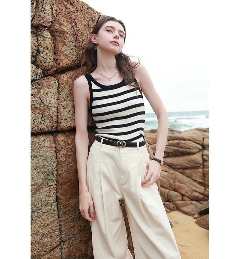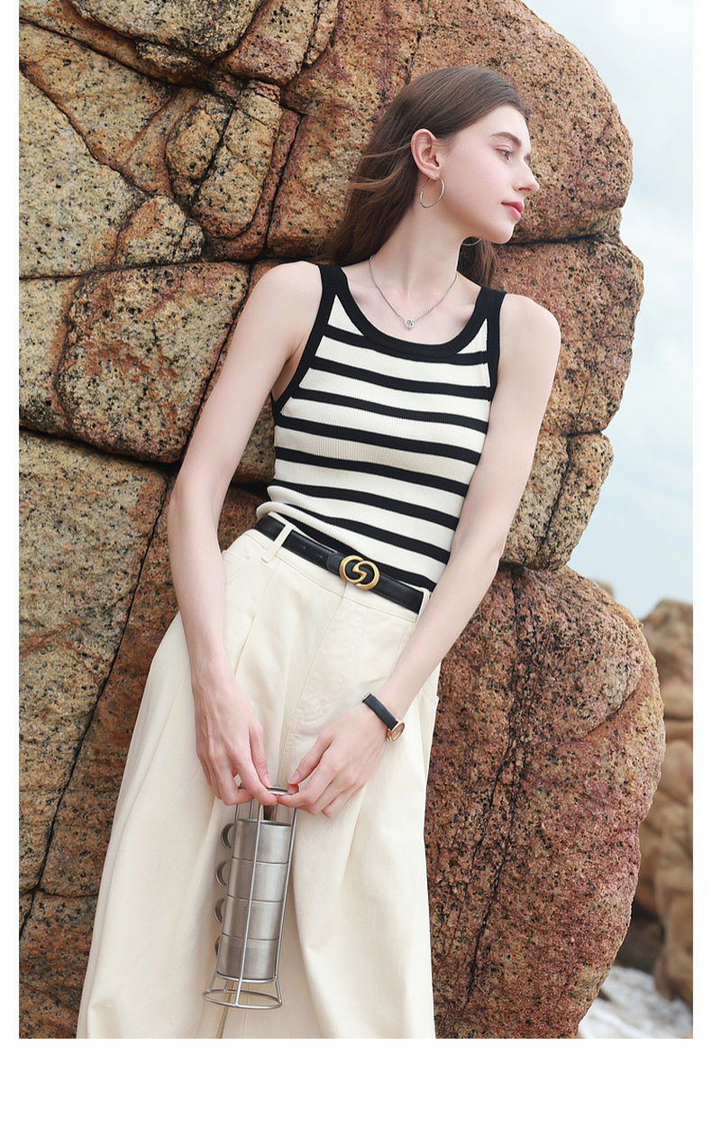三彩2026夏季新款条纹背心吊带圆领无袖修身短款冰丝针织衫显瘦M