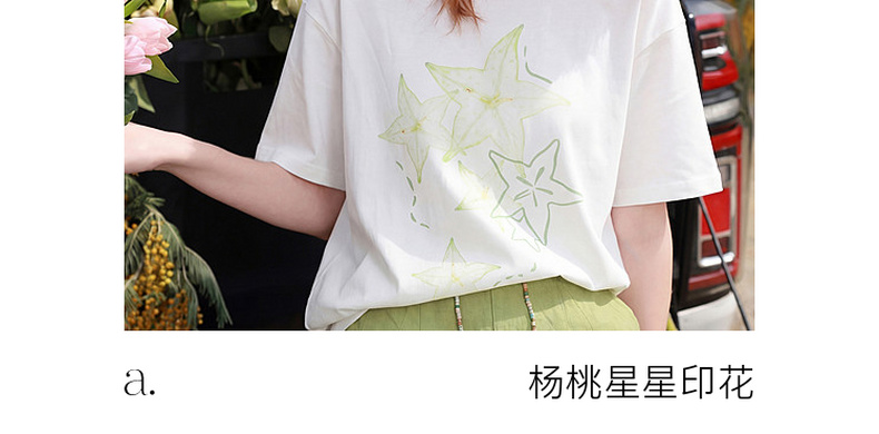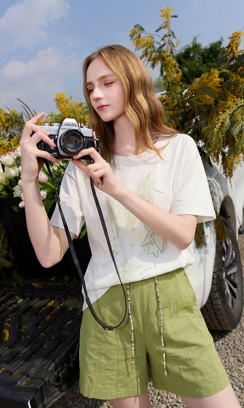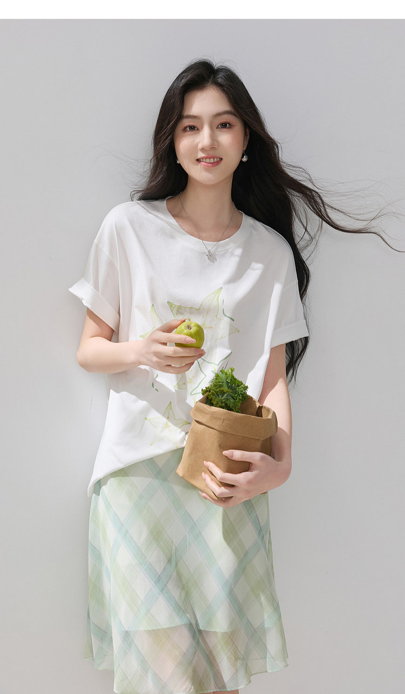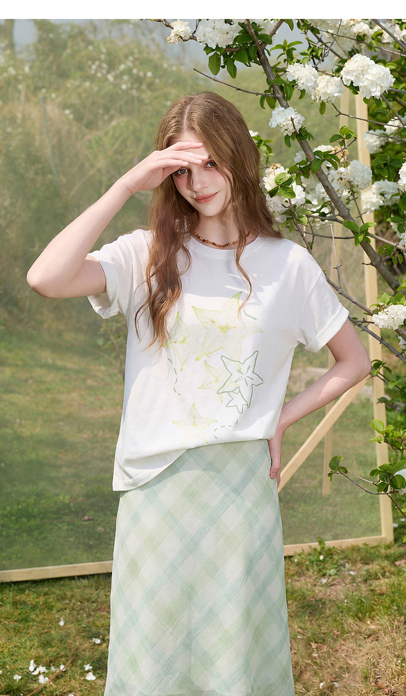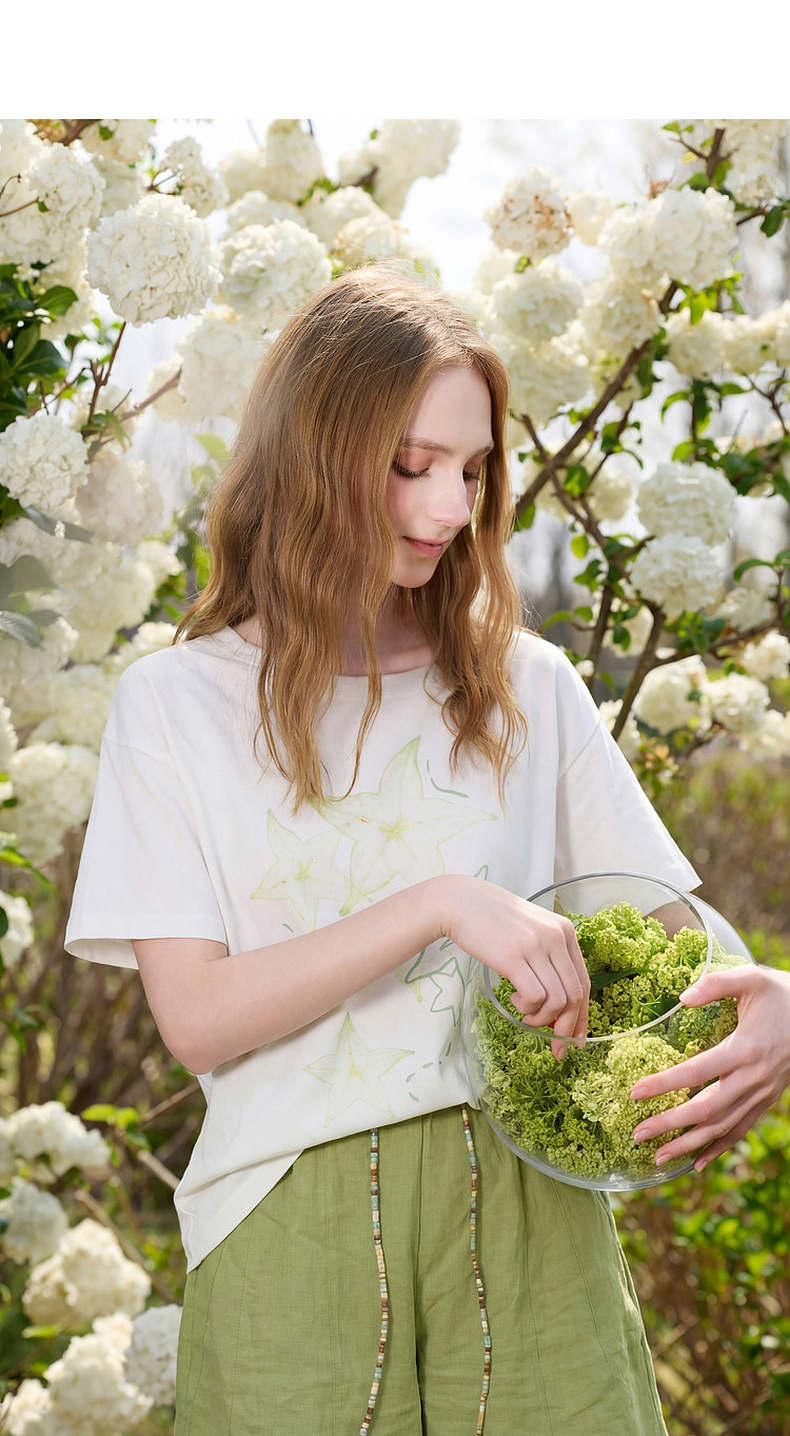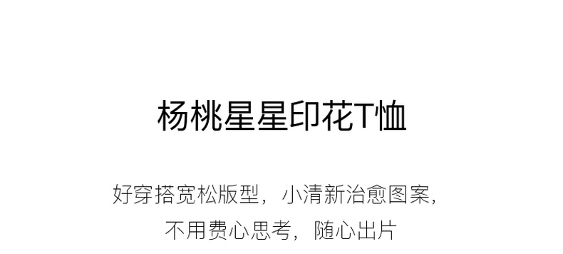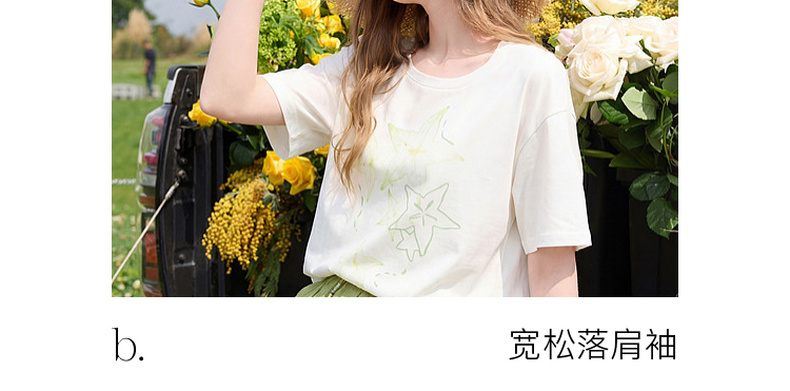 三彩2026夏季新款清新印花T恤宽松落肩袖圆领套头衫上衣休闲M