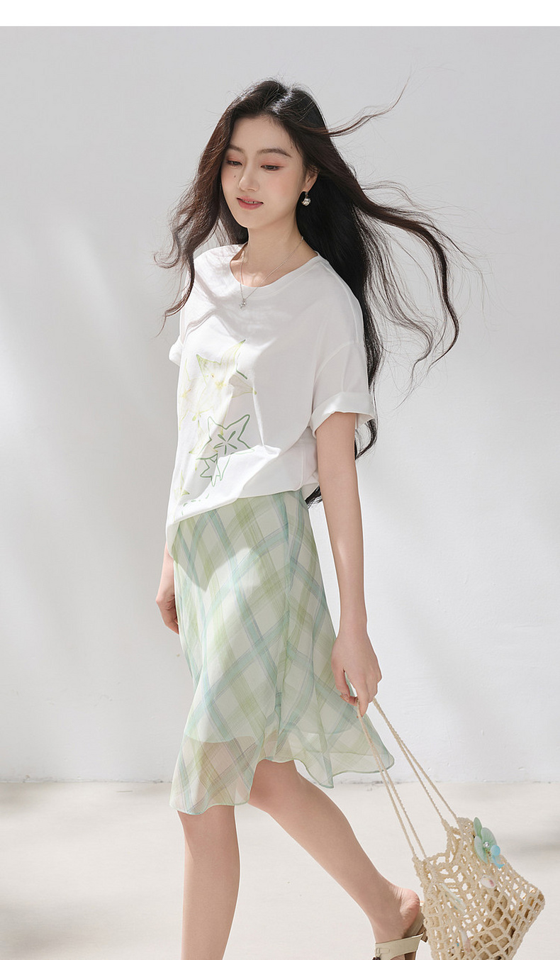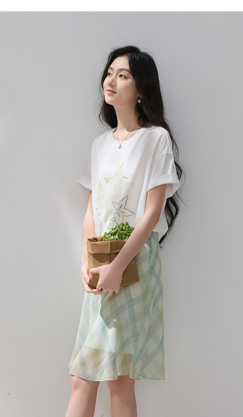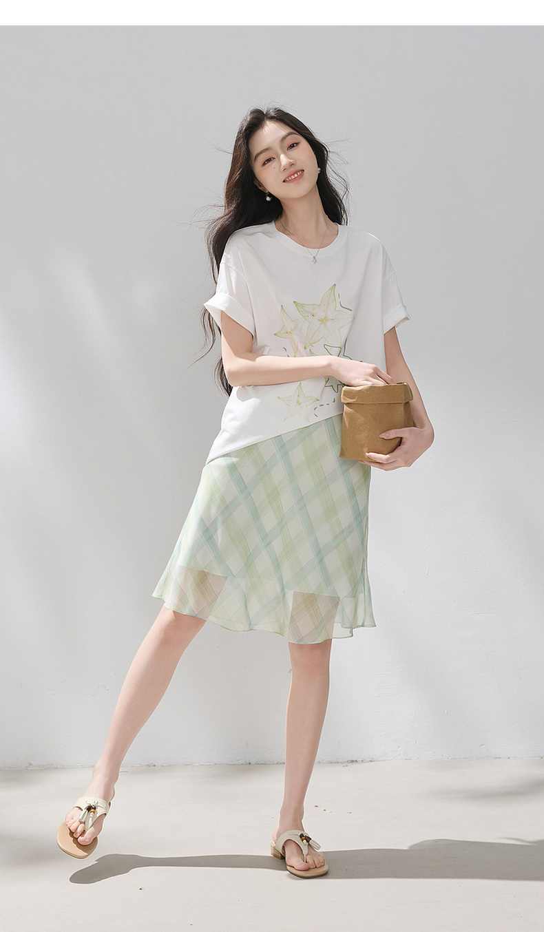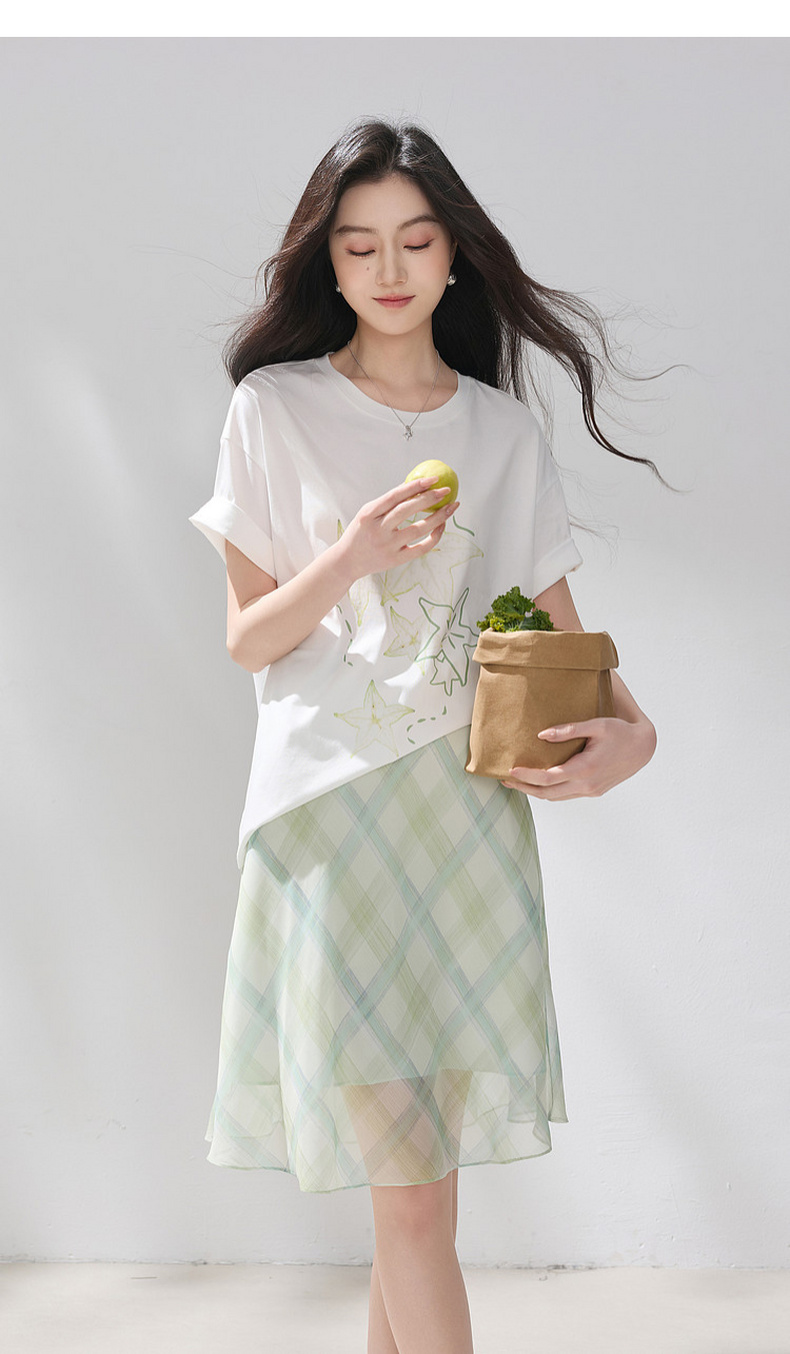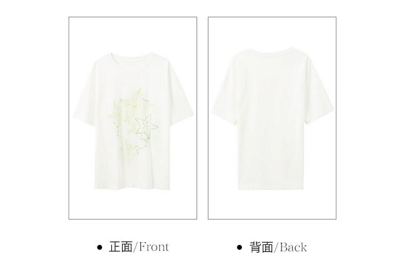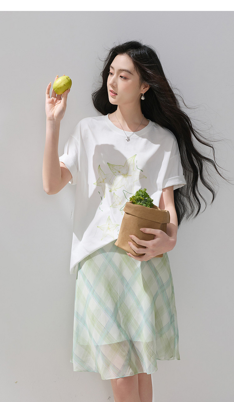 三彩2026夏季新款清新印花T恤宽松落肩袖圆领套头衫上衣休闲M