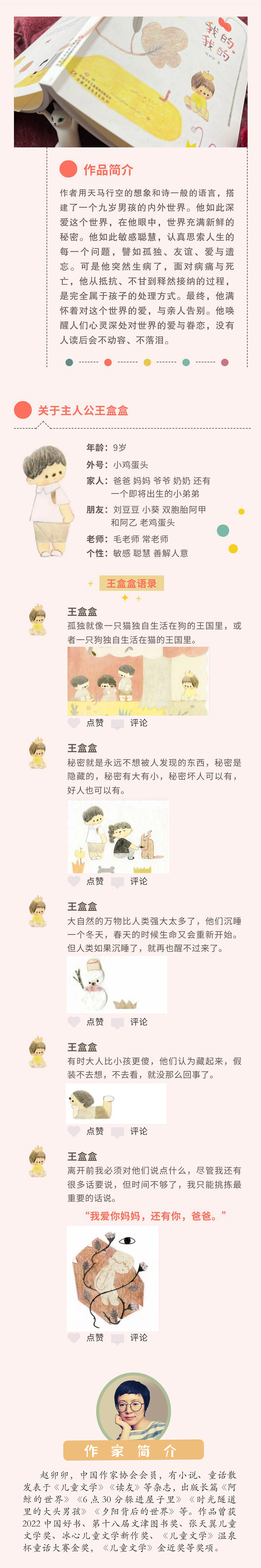 赵卯卯是近些年异军突起的新锐儿童文学作者,在童话创作和儿童小说创作上,都具有较独特的风格,文风鲜明,童年感强,诗性足,能较好地将艺术性和故事性融合起来,具有较高的辨识度。同时其作品也屡获各类儿童文学奖项,是中国原创儿童文学领域正在升起的一颗新星。