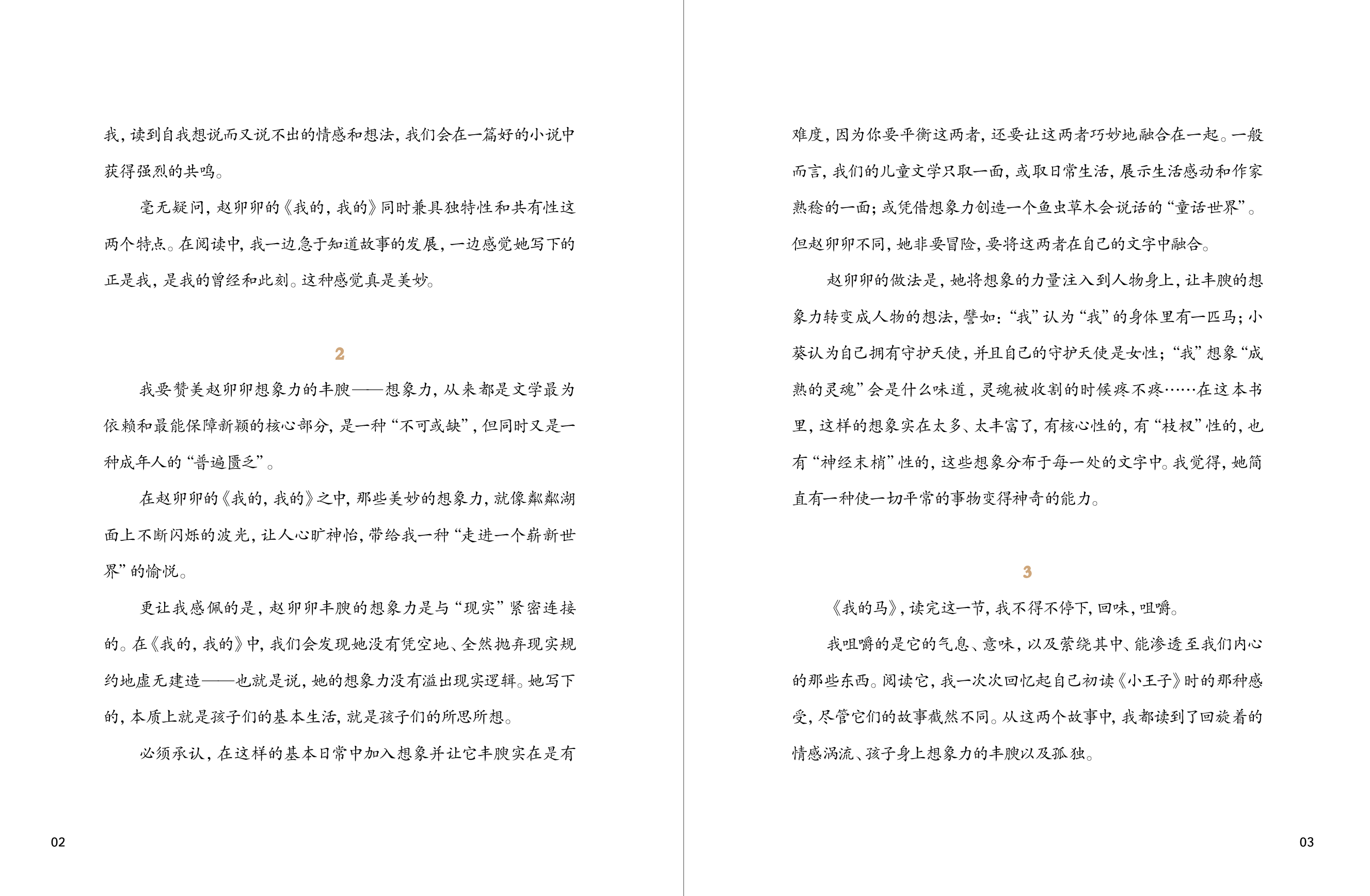 孩子青蛙一样一跳一跳的思维,孩子星星一样闪闪发光的语言,孩子天气一样变幻不定的情感,都在这本《我的,我的》里。赵卯卯的这些童话里有了不起的幼稚,不得了的懵懂,还有不简单的简单,它们组成了一个通往童年的秘密花园,期待你的流连驻足。它不单单是我的,我的,还是你的,你的。