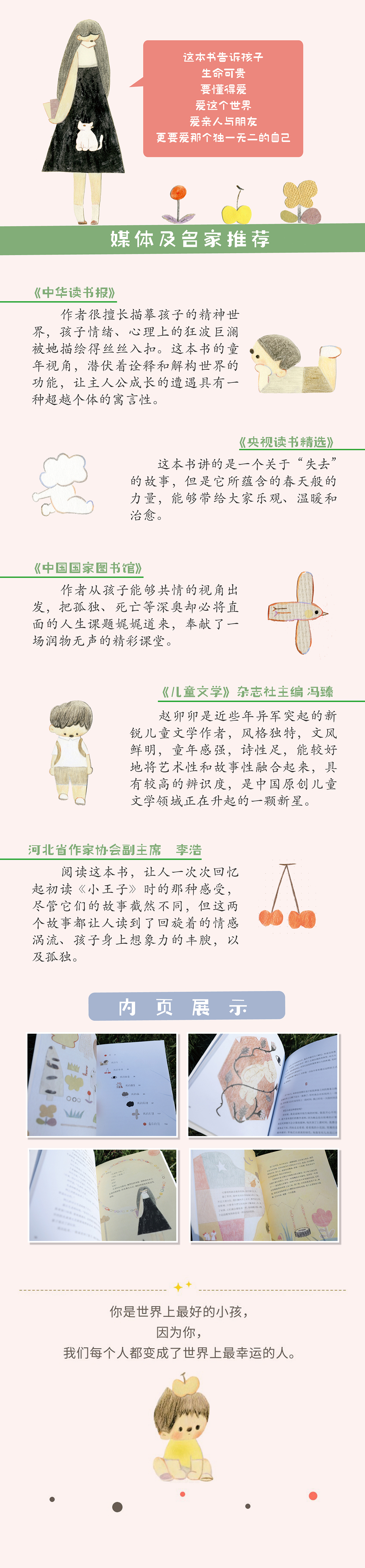 这是一本阅者落泪的儿童小说,它的的语言极其诗意,又极其孩子气,它触及生命中那些重要的议题:孤独、秘密、友谊、爱、遗忘、消逝,它唤醒每个人心灵深处对生命的理解与悲悯。说是童书,但它不仅仅适合孩子阅读,它适合所有人阅读。