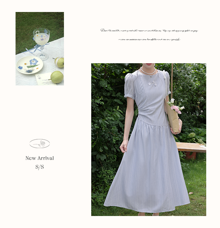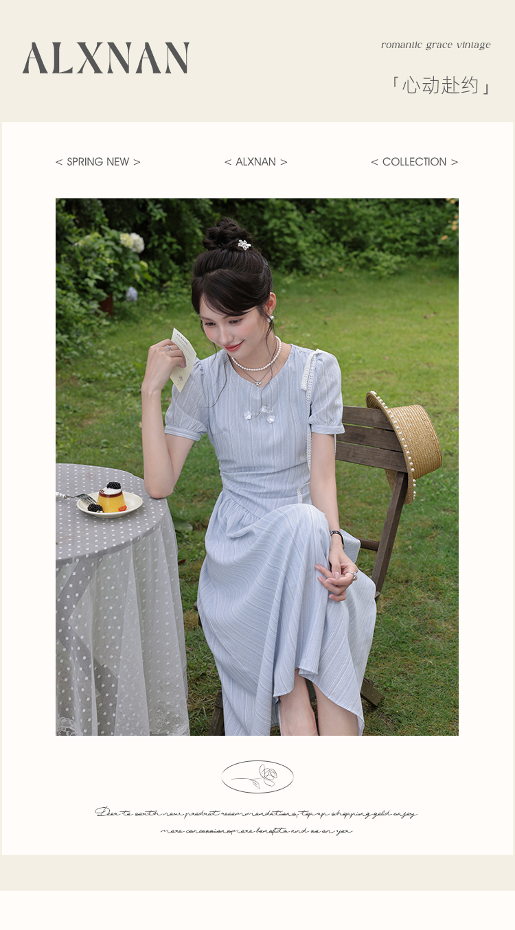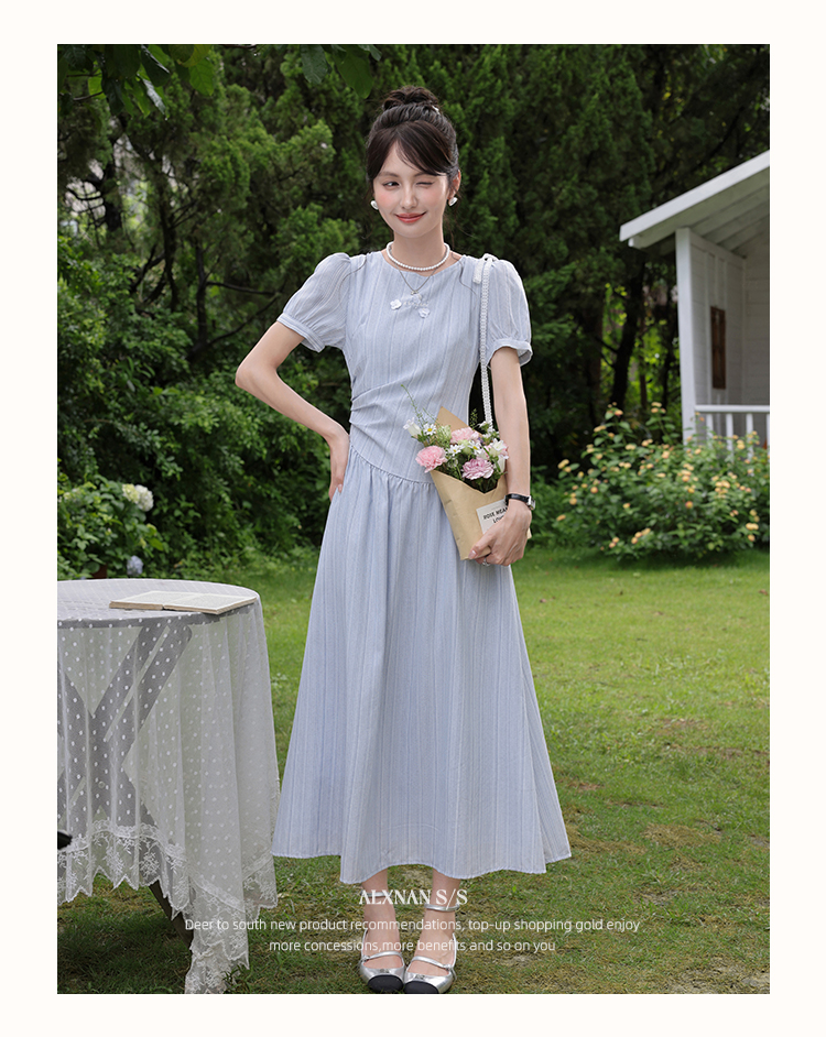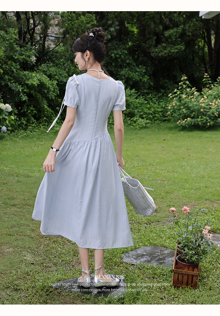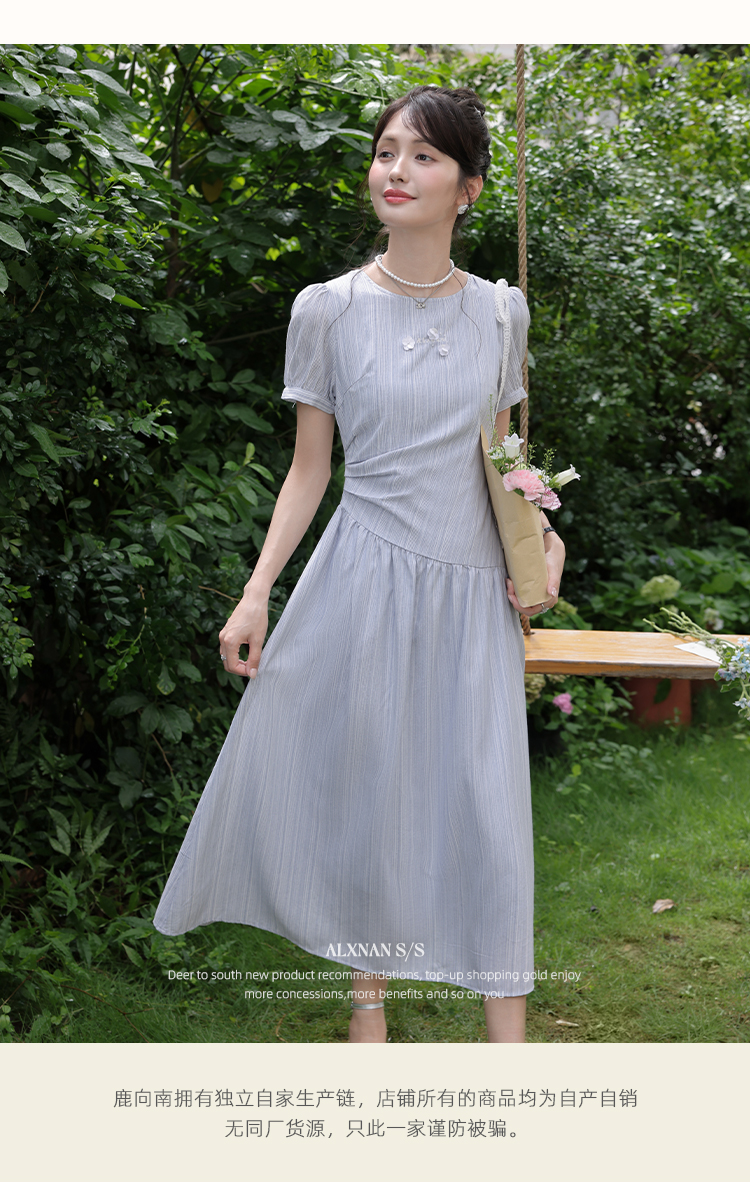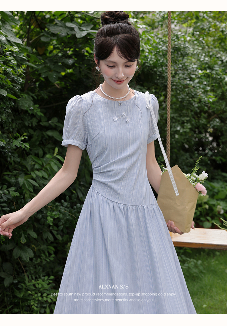 【6折秒杀】鹿向南「心动赴约」法式蓝色气质短袖连衣裙女夏季设计感收腰长裙DYL661785-1