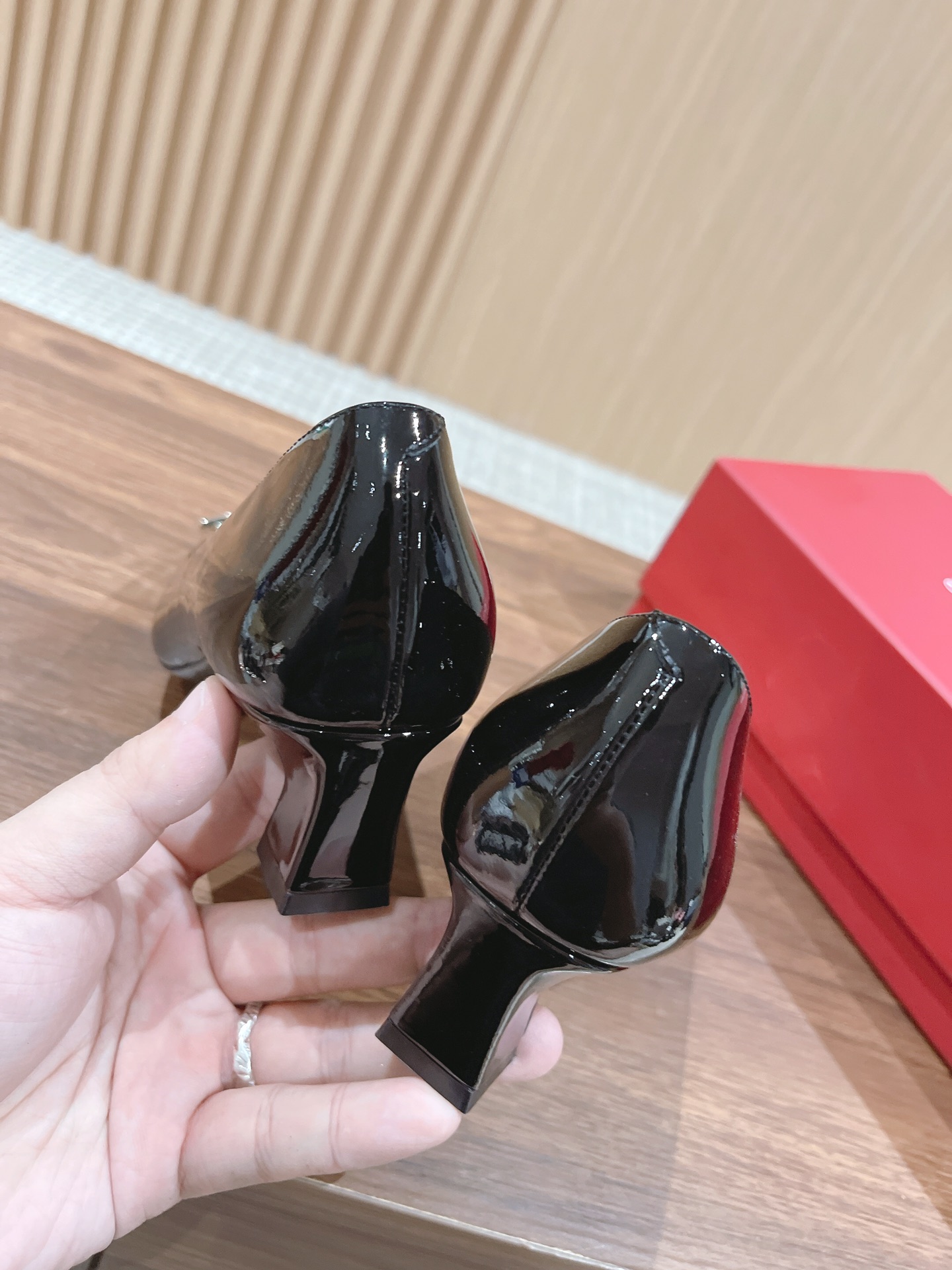 鞋跟高度4CM,小牛漆皮的完美融合,给这个款式带来独一无二的风格,隐约露出的脚背,无形中增加了几分性感!