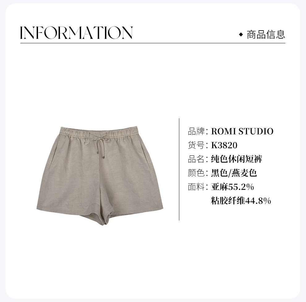 ROMI STUDIO“率性简约”休闲百搭高腰直筒松紧腰抽绳薄款短裤K3820