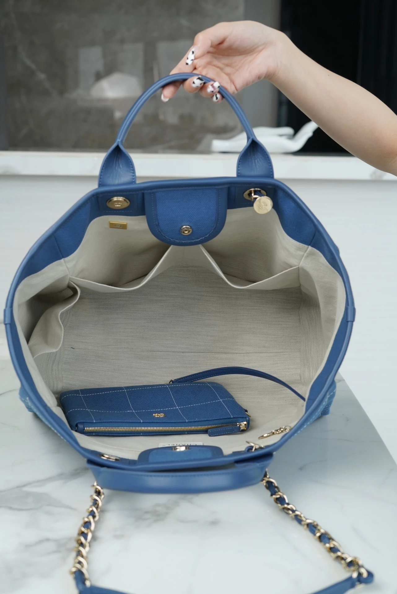 由材质棉质制作,小牛皮与金色金属的搭配,在小废包时代杀出重围的大包,都说时尚是一个圈,转一圈又回来了,然而chanel 又赋予了它更多的质感与时尚感,都市丽人上班背,健身背,买菜背,带娃背,出门旅行还能背,休闲通勤都ok,使用率感人