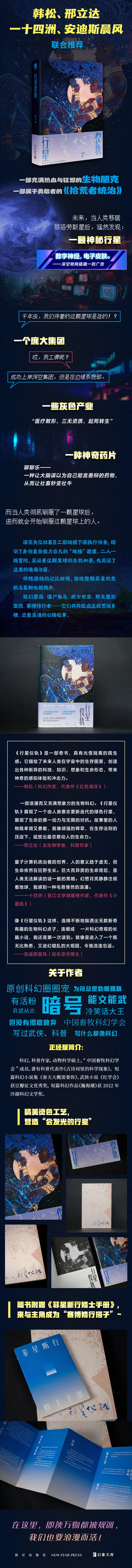 暗号,科幻、科普作家,动物科学硕士,“中国畜牧科幻学会”成员。著有科普代表作《古诗词里的科学现象》,短篇科幻小说集《春天大概需要你》。武侠小说《红学会》获豆瓣征文优秀奖,短篇科幻作品《瀚海潮》获2022年冷湖科幻文学奖。