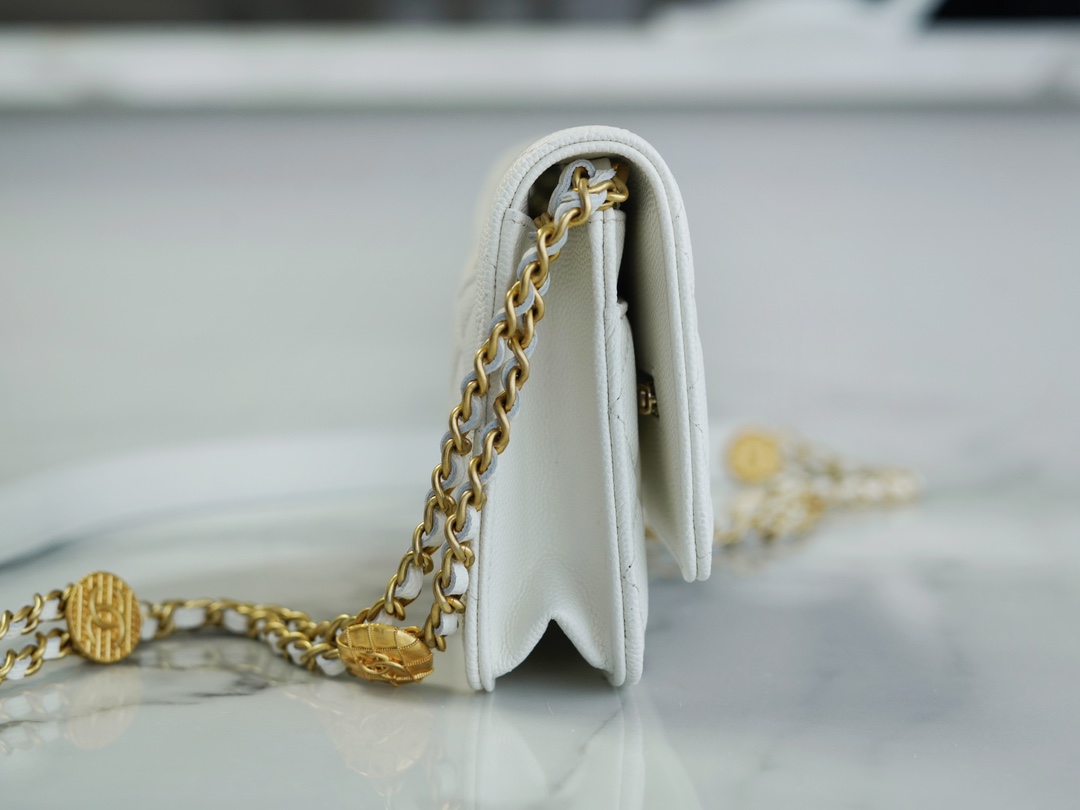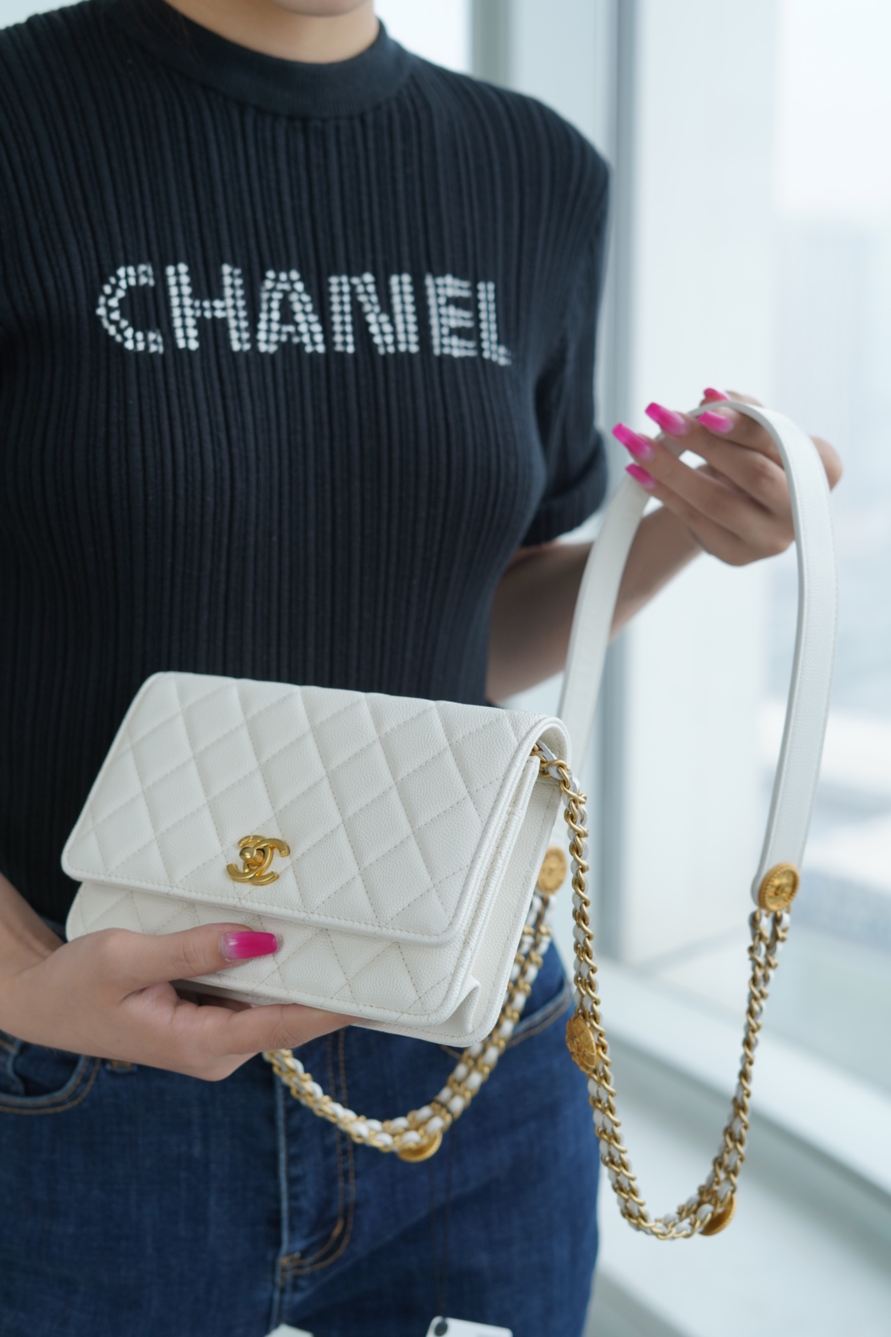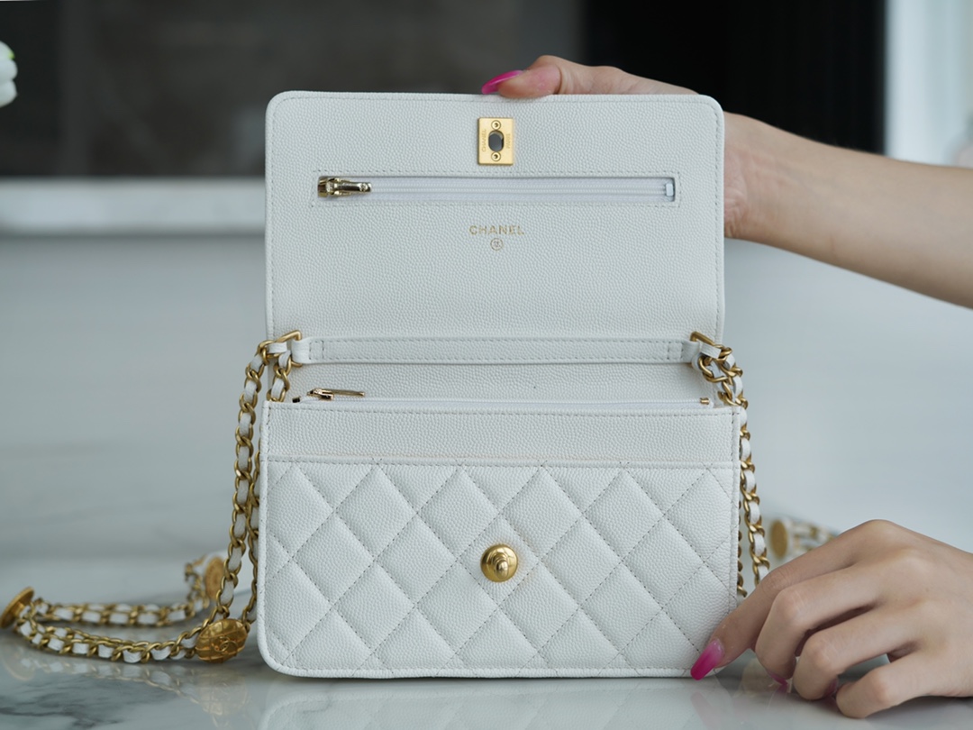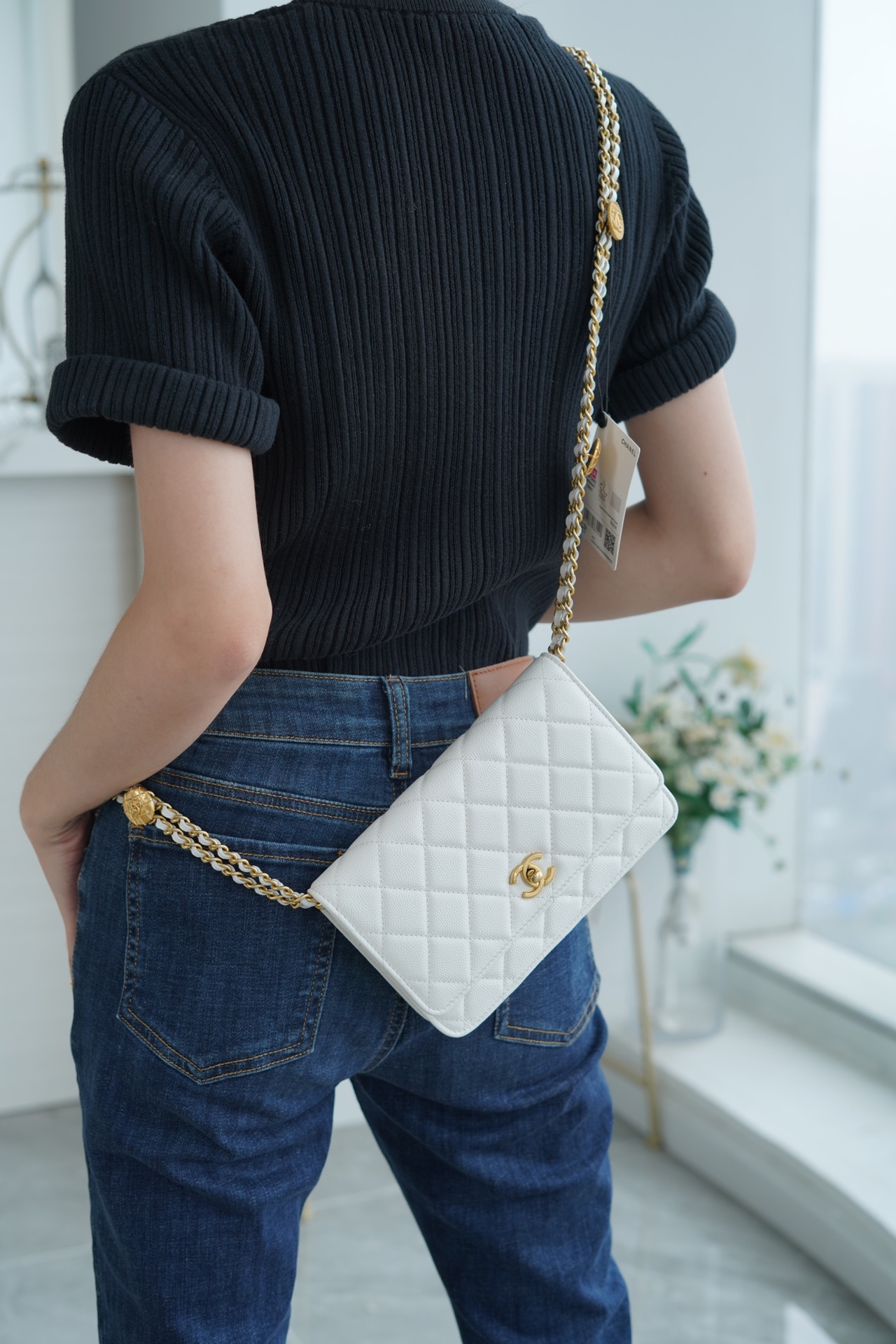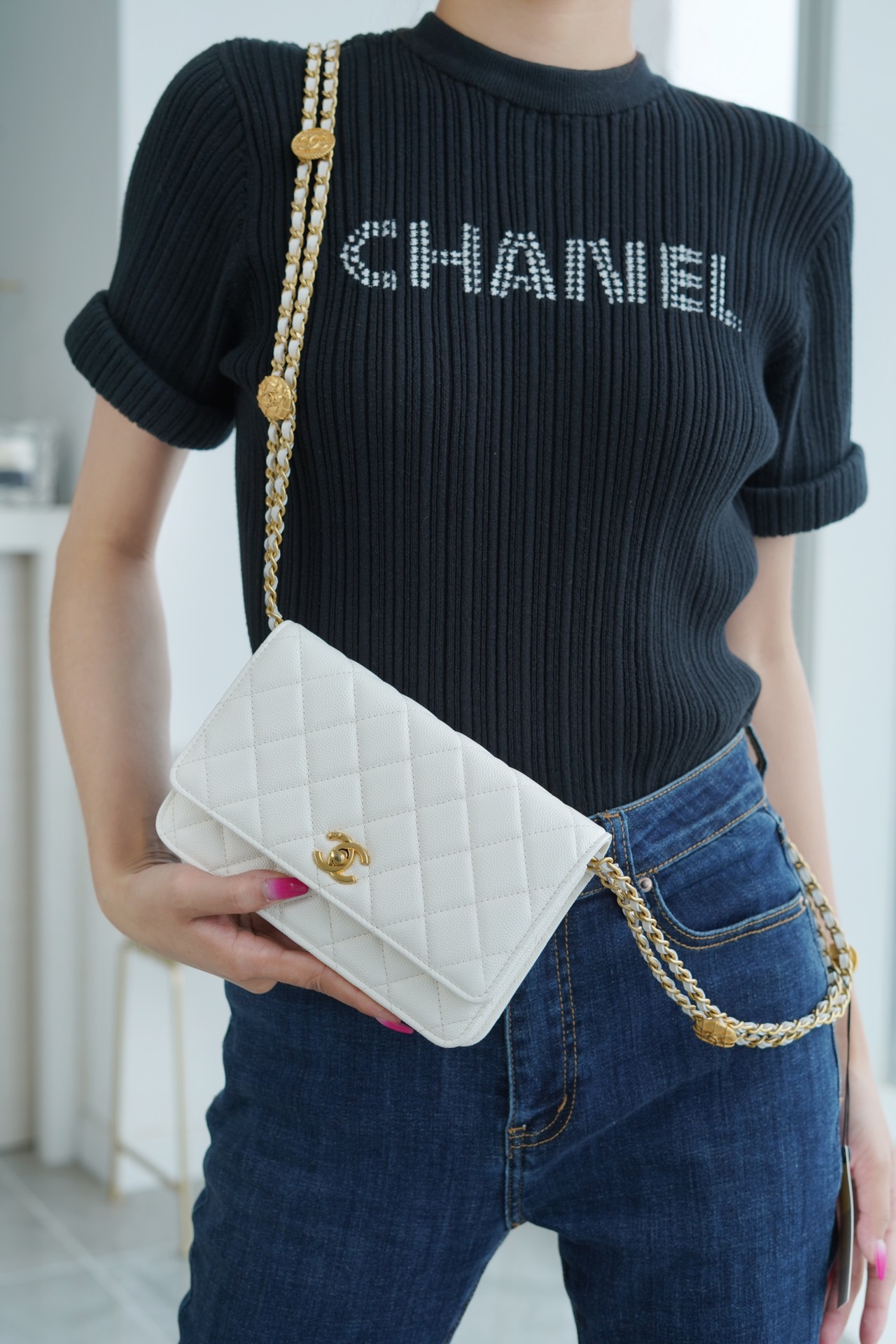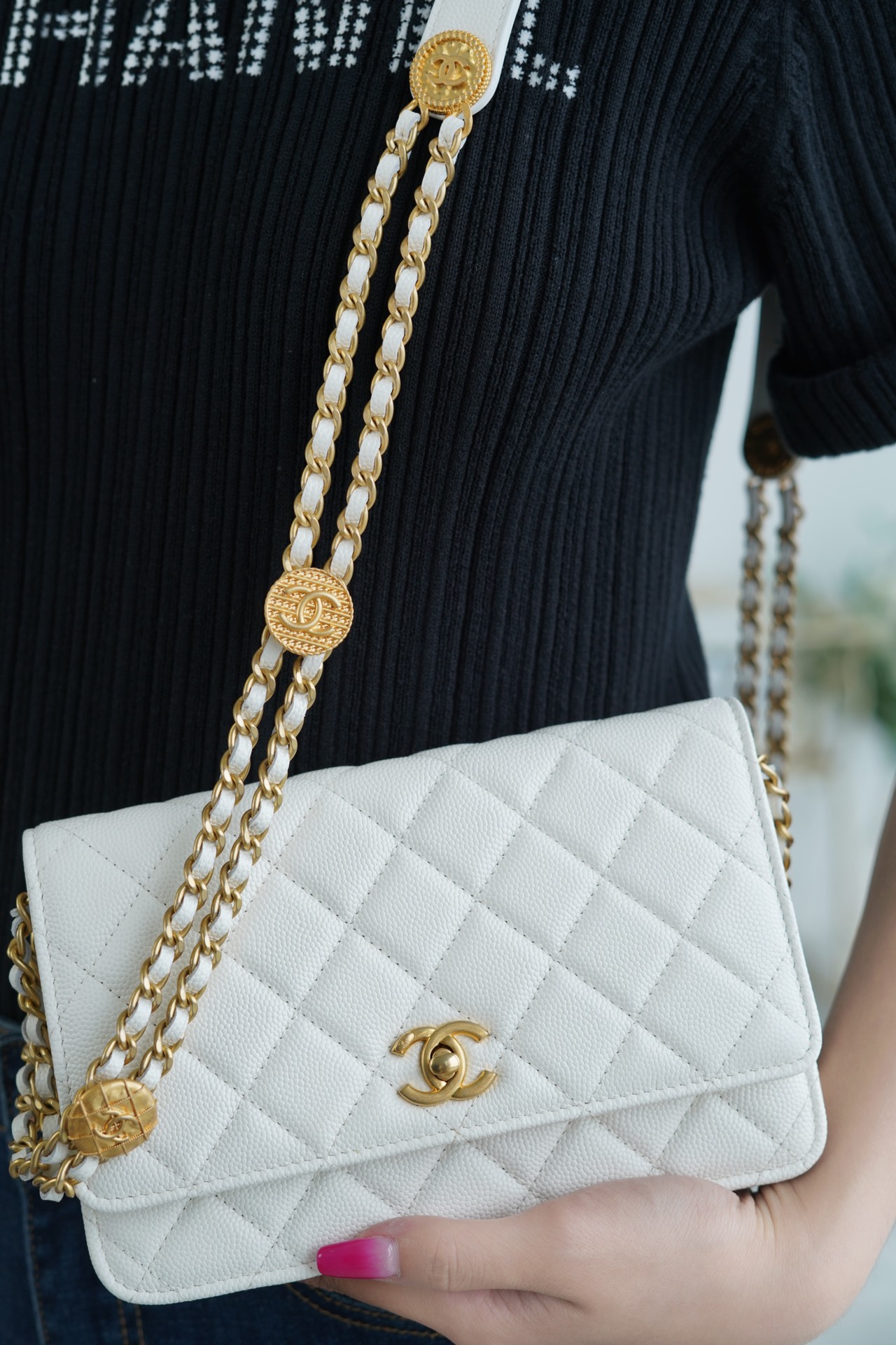 荔枝纹牛皮+复古金币扣,皮质亮面有光泽,耐磨性强!使用开合旋钮,比经典款设计更方便。皮穿链条中结合了不同图案的金币元素设计,每个都精雕细琢。集合了满满香奈儿经典元素组成的包包,一整个爱住啦??