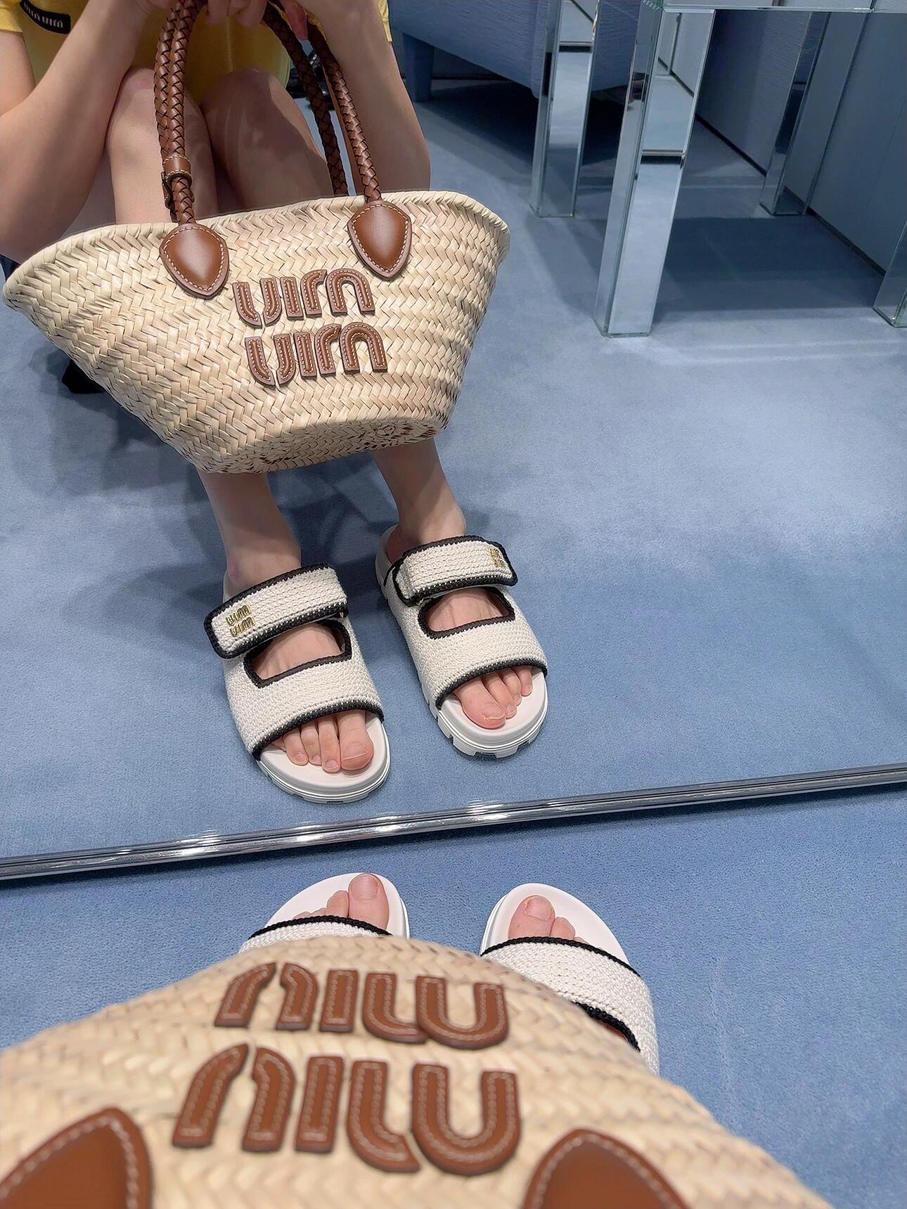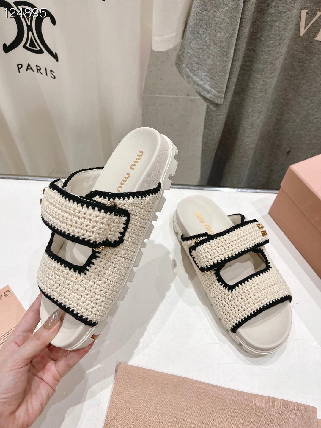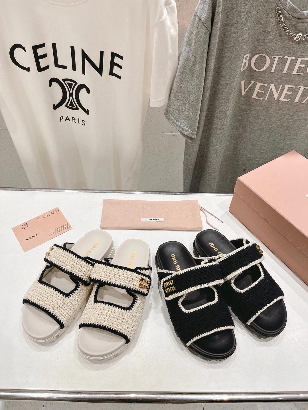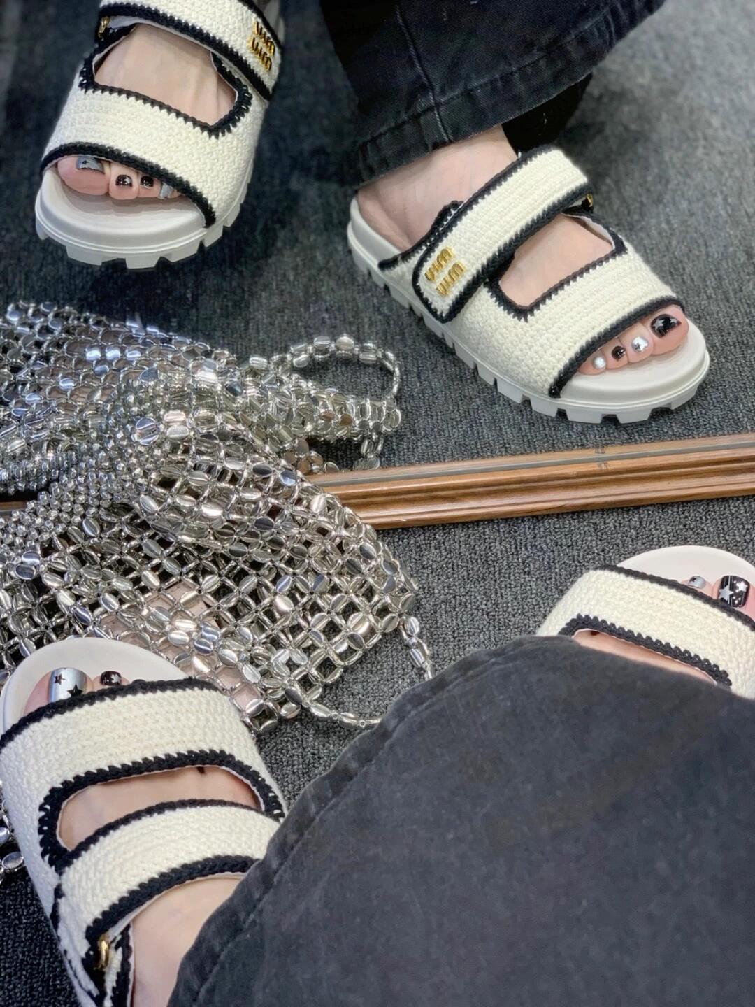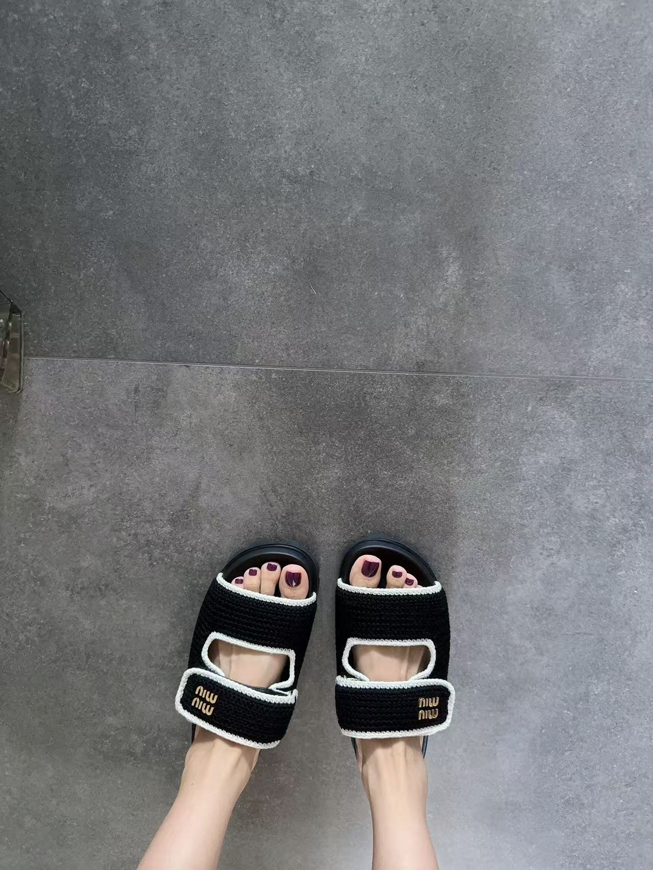 MiuMi*缪缪两带魔术贴!!编织 厚底 平底 拖鞋