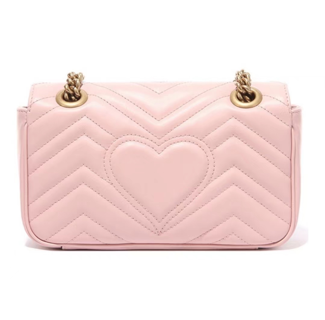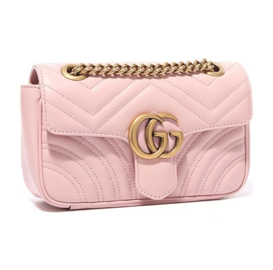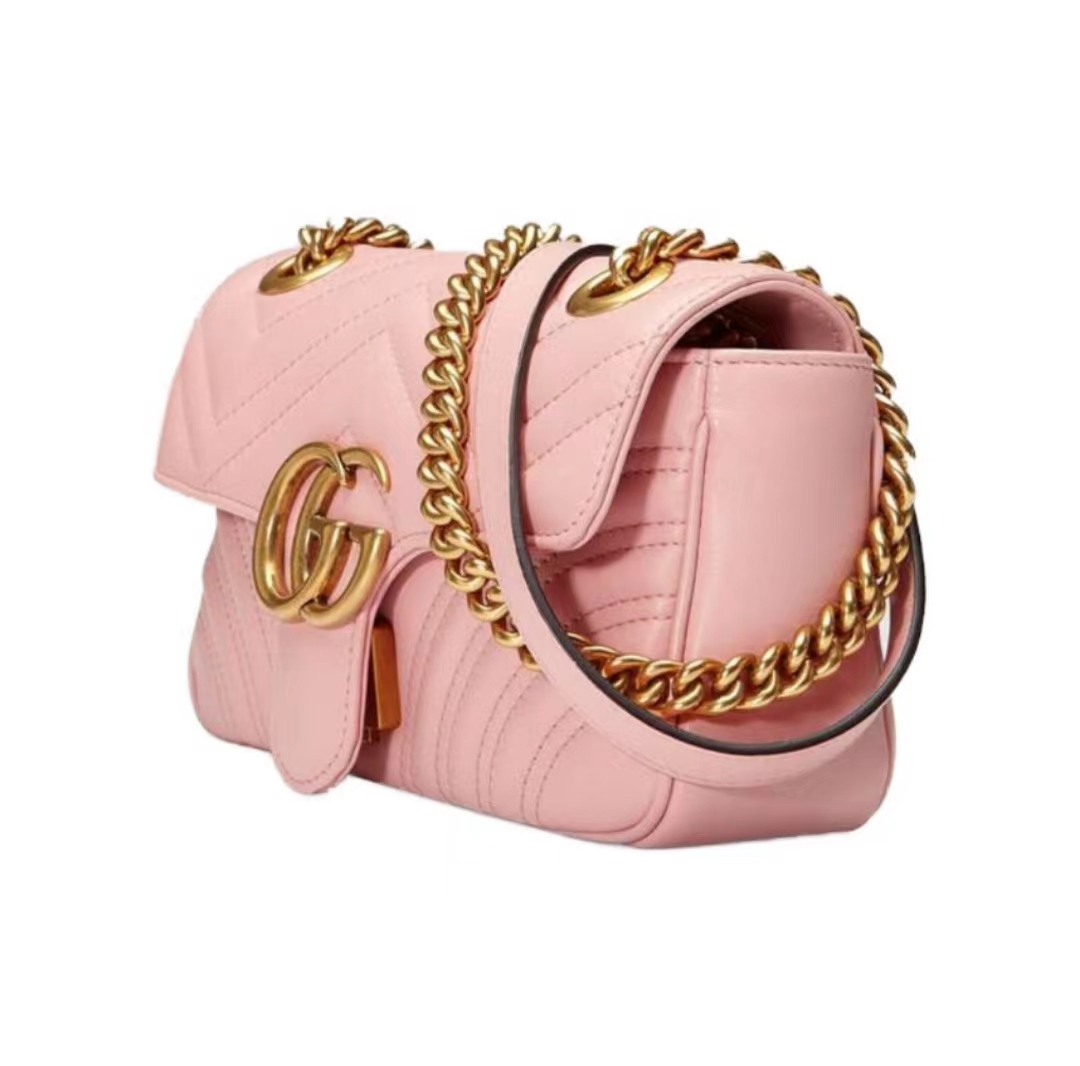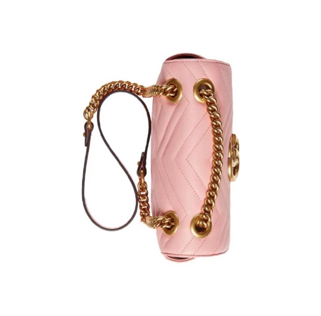 GUCCI古驰 GG Marmont系列 马蒙 链条金标Logo做旧 牛皮 斜挎单肩包 迷你 女款 粉色(HH)