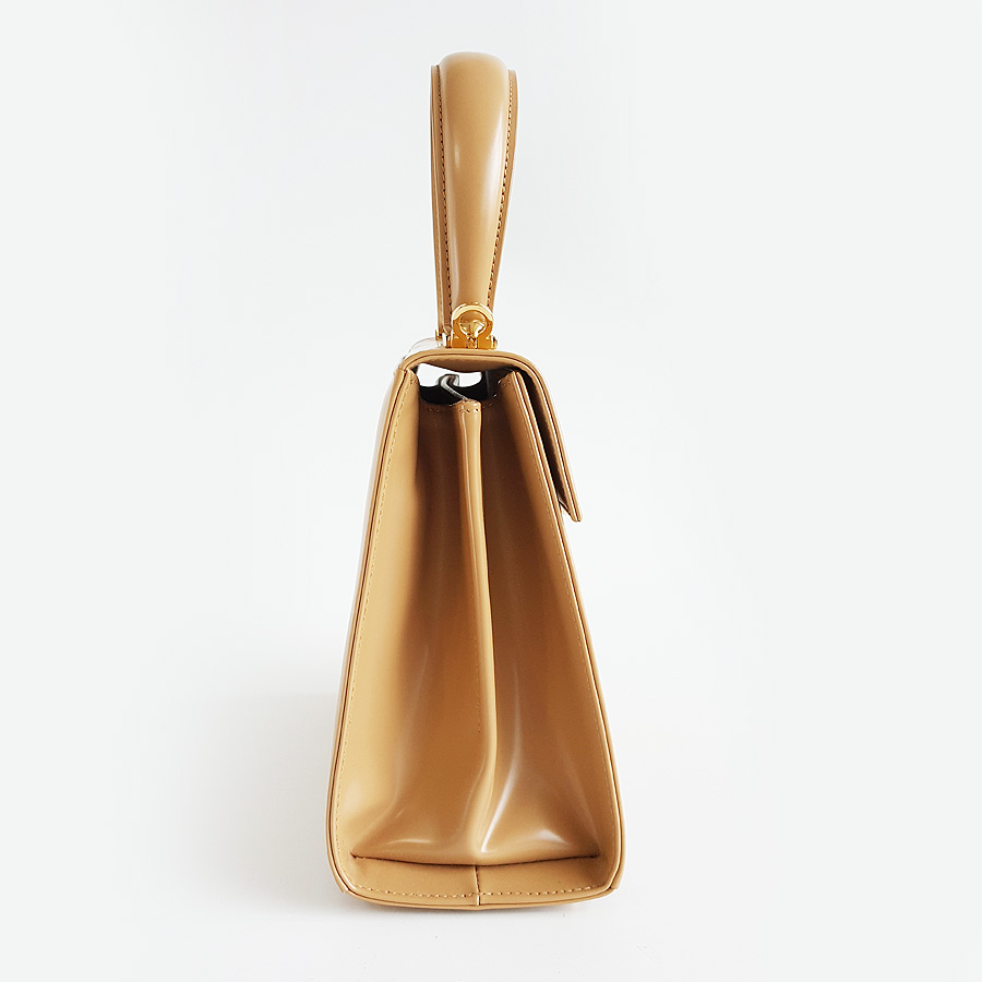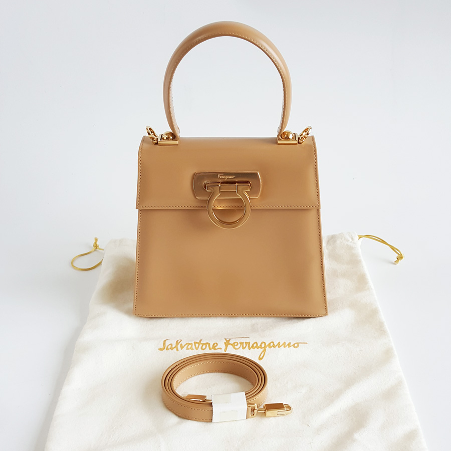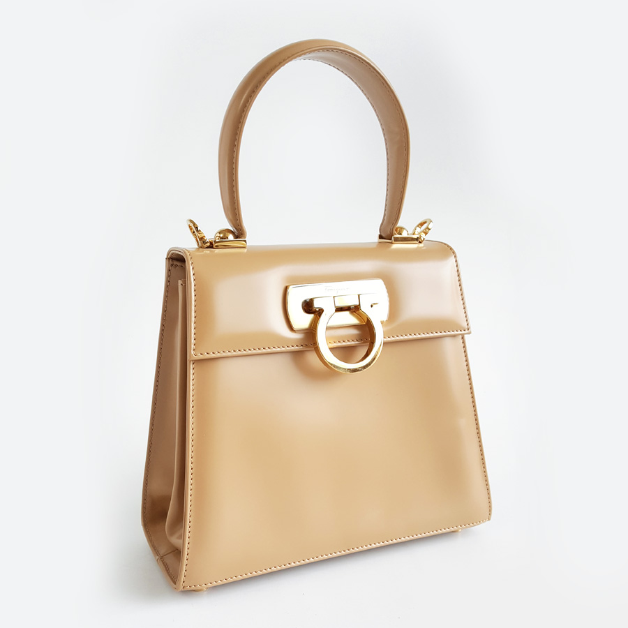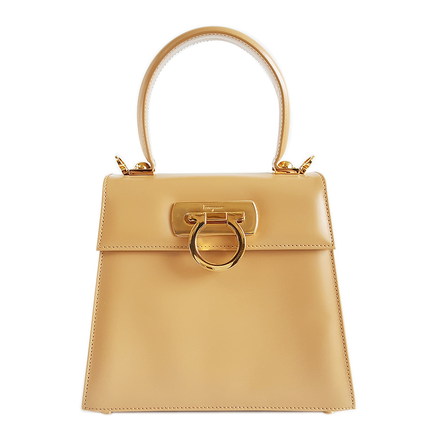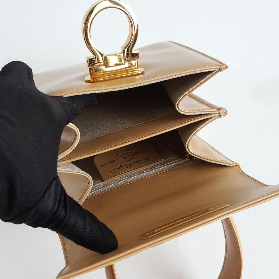【95新】FERRAGAMO菲拉格慕小号奶茶色漆皮马蹄扣博物馆手提包女士050924JJ21