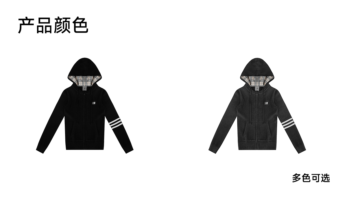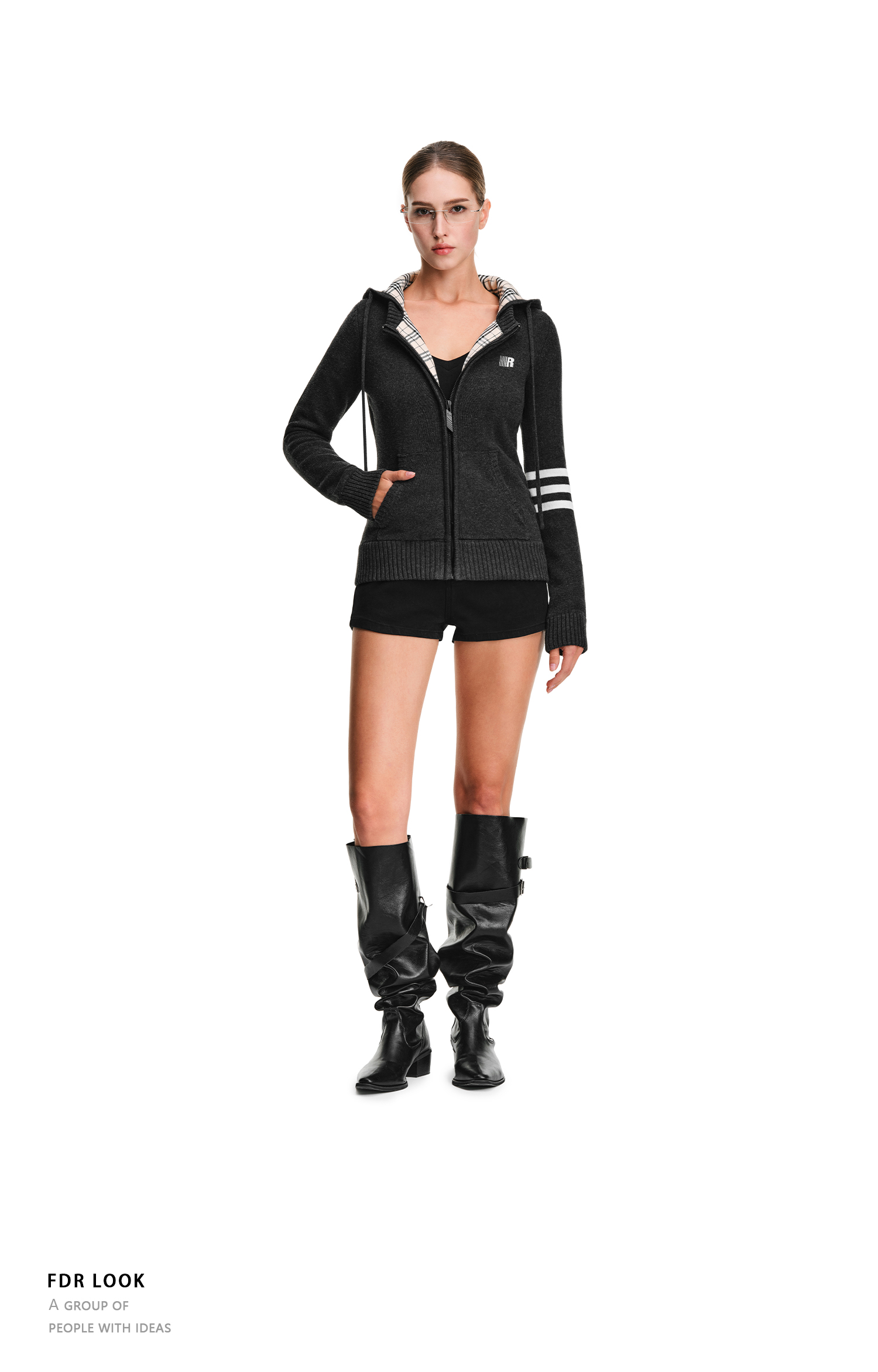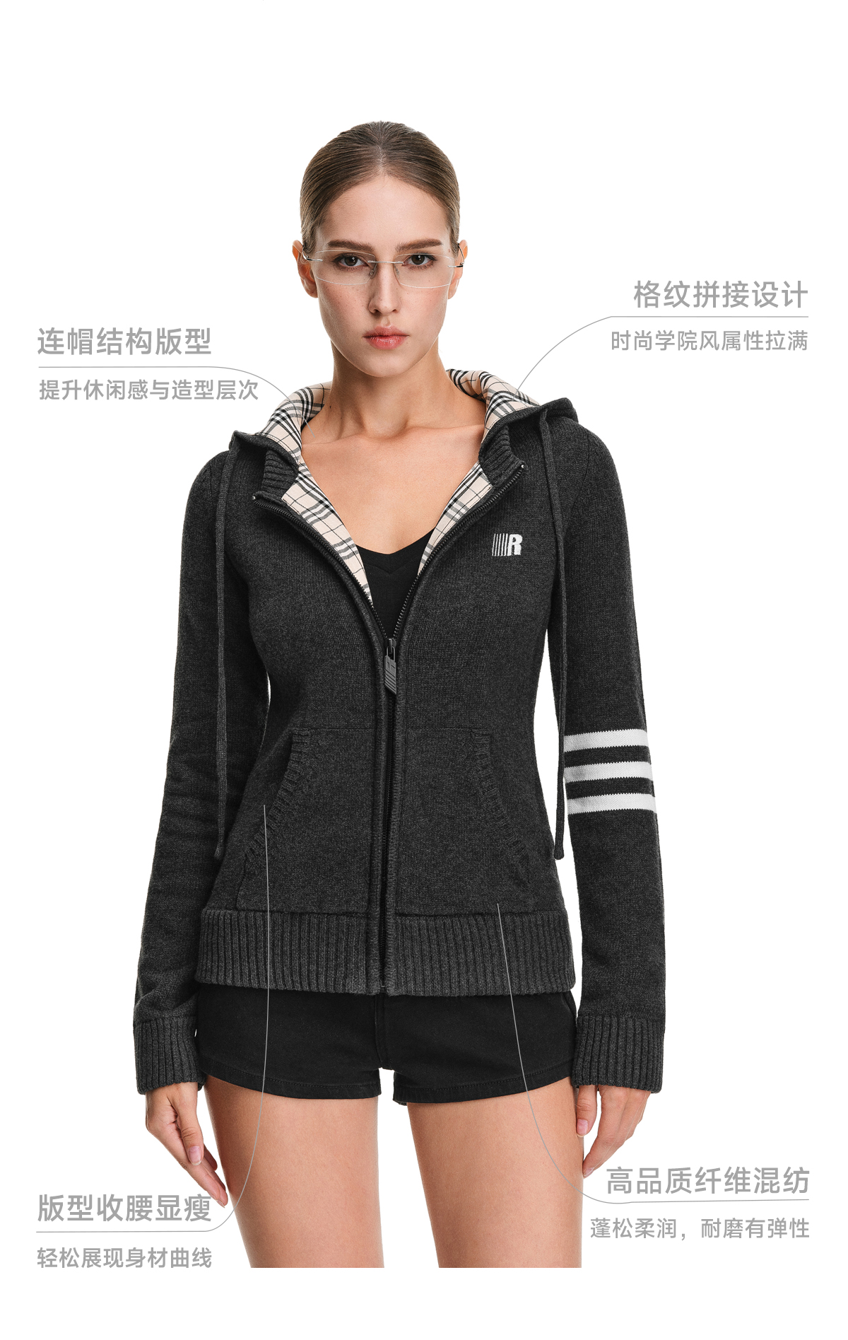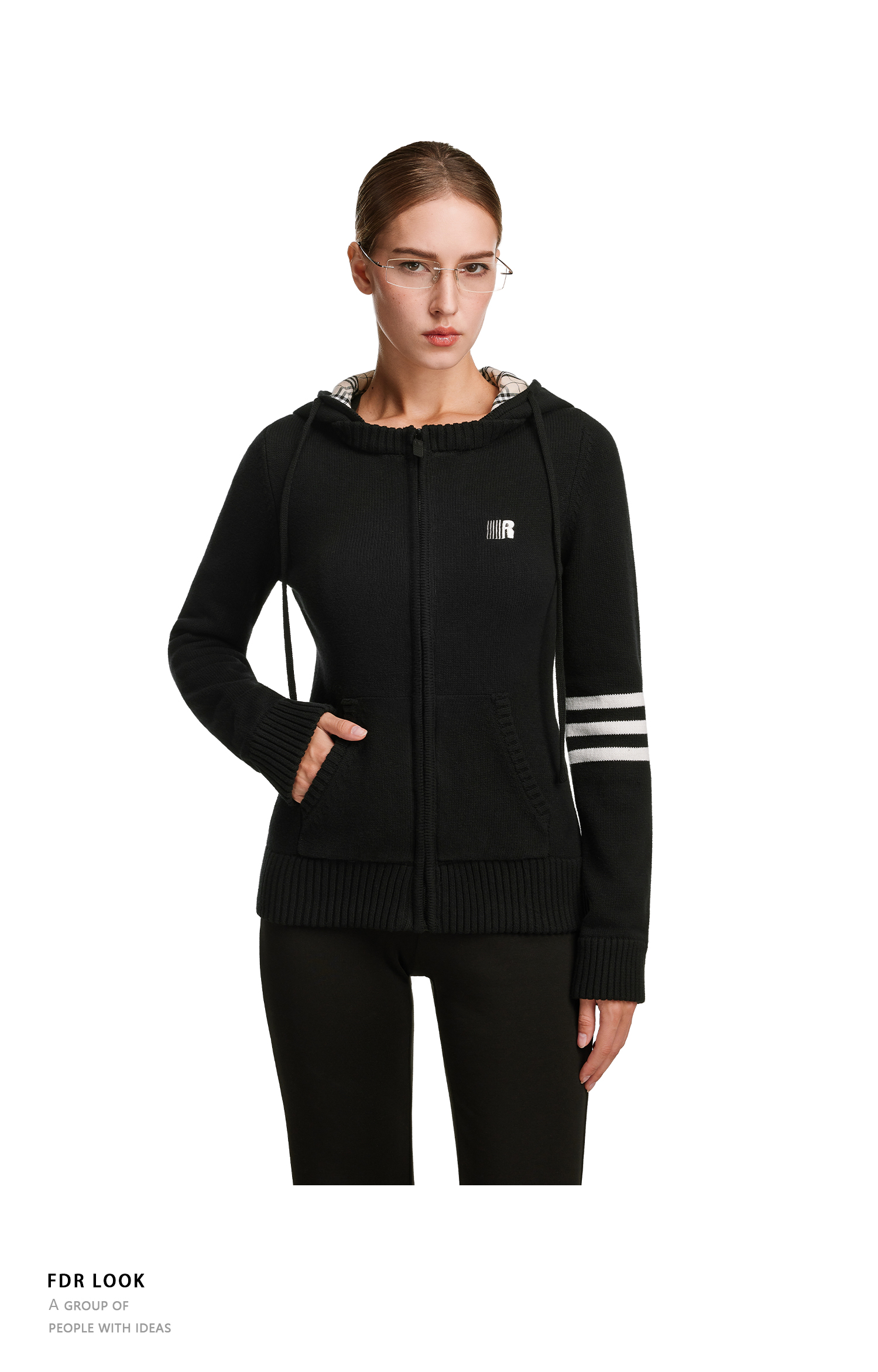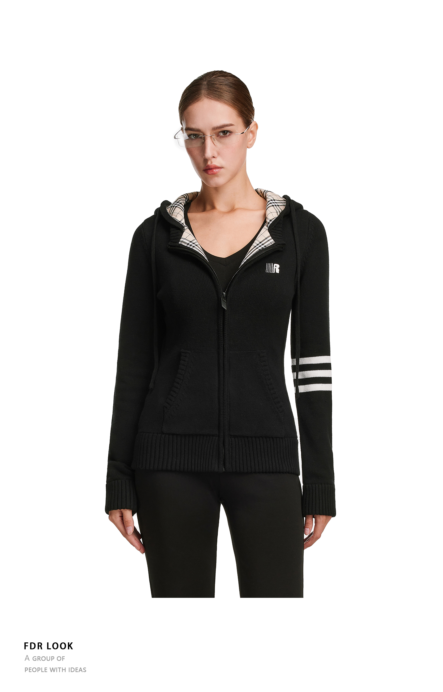 FDR官方店 修身连帽长袖格子拉链开衫针织毛衣外套女秋季新品卫衣