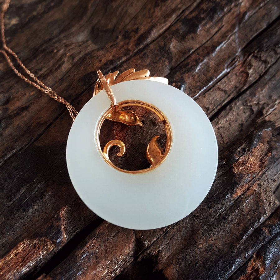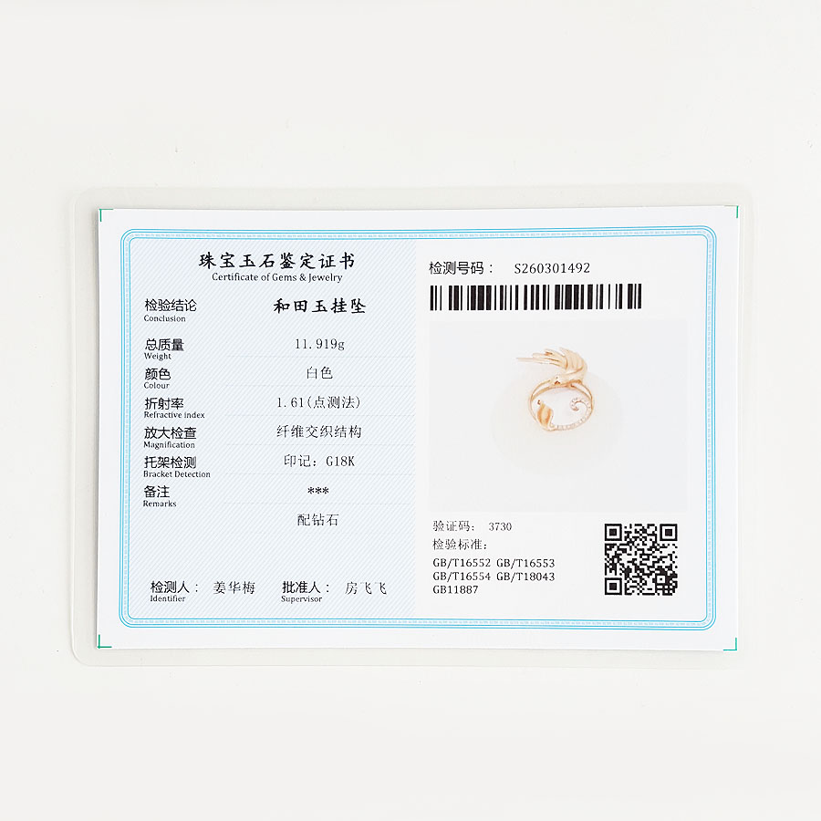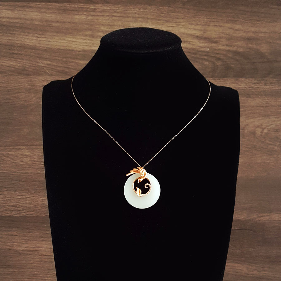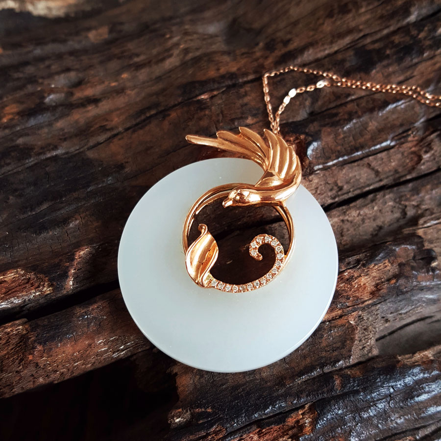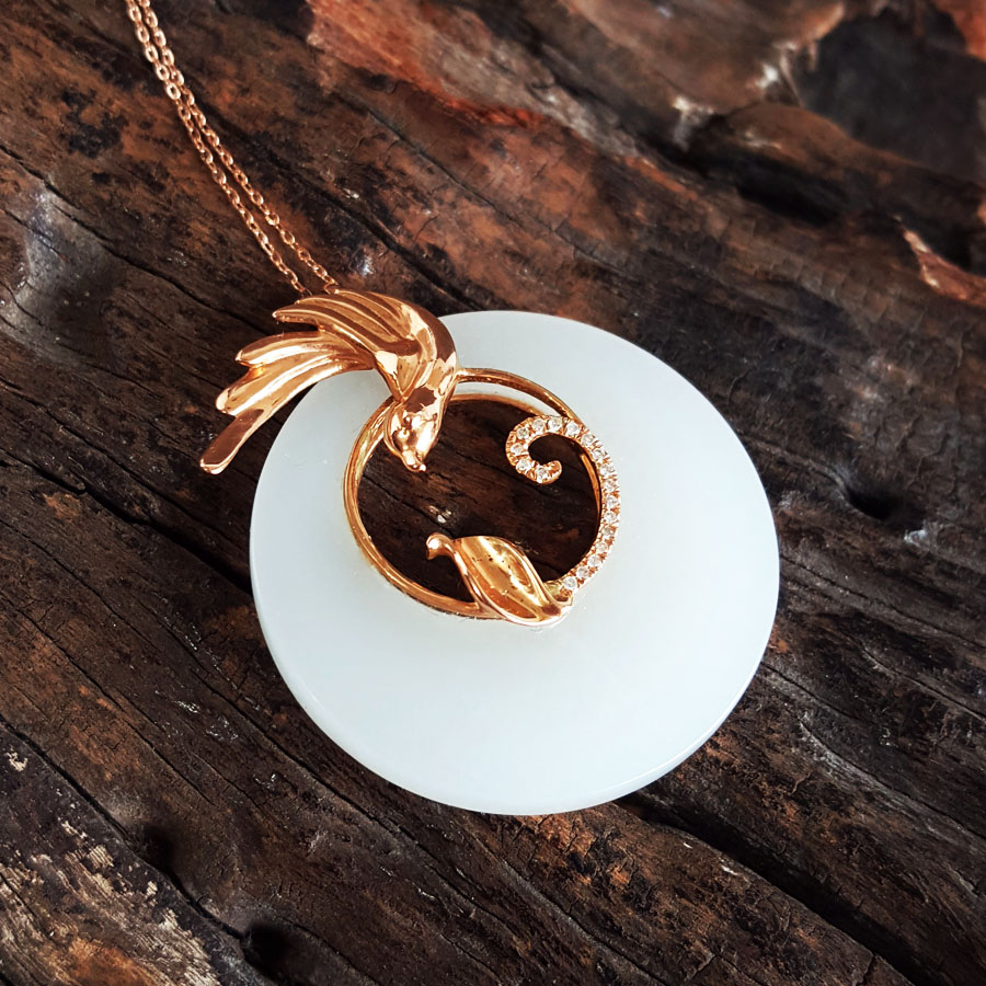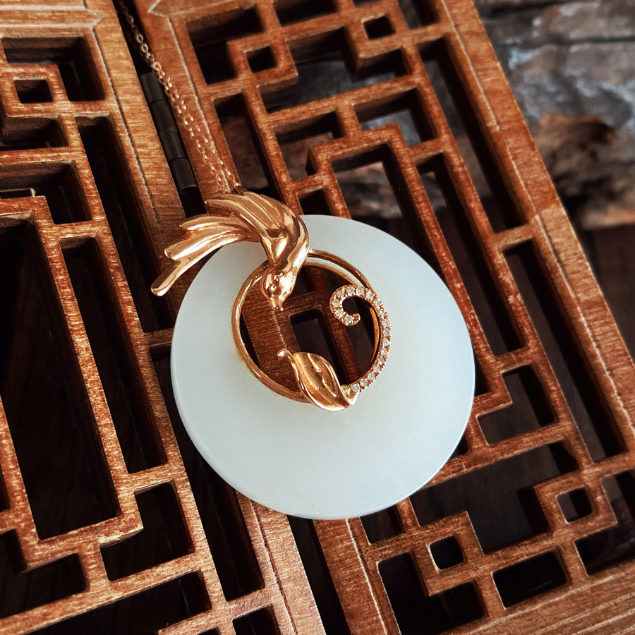 名称 | AU750玫瑰金镶钻镶天然细腻油润度佳喜鹊衔枝造型平安扣和田玉吊坠项链 |