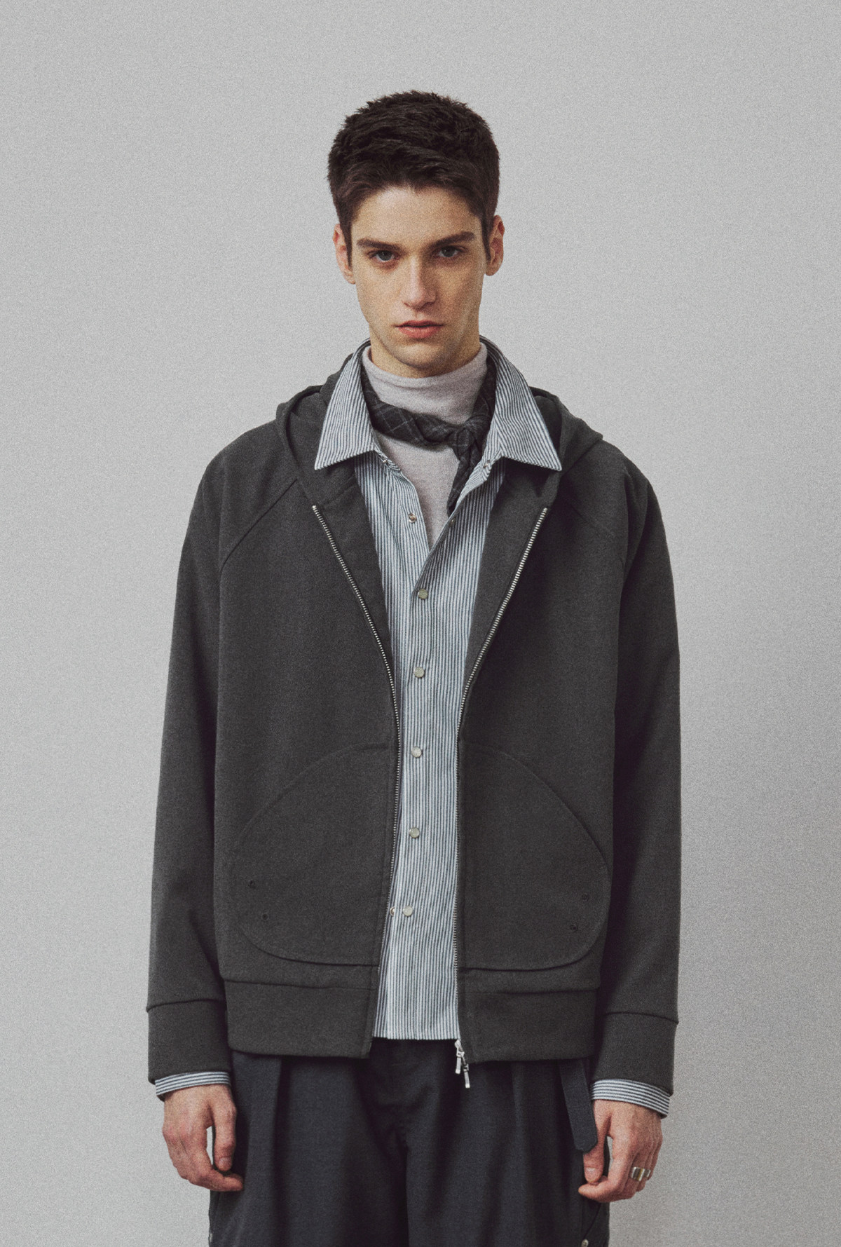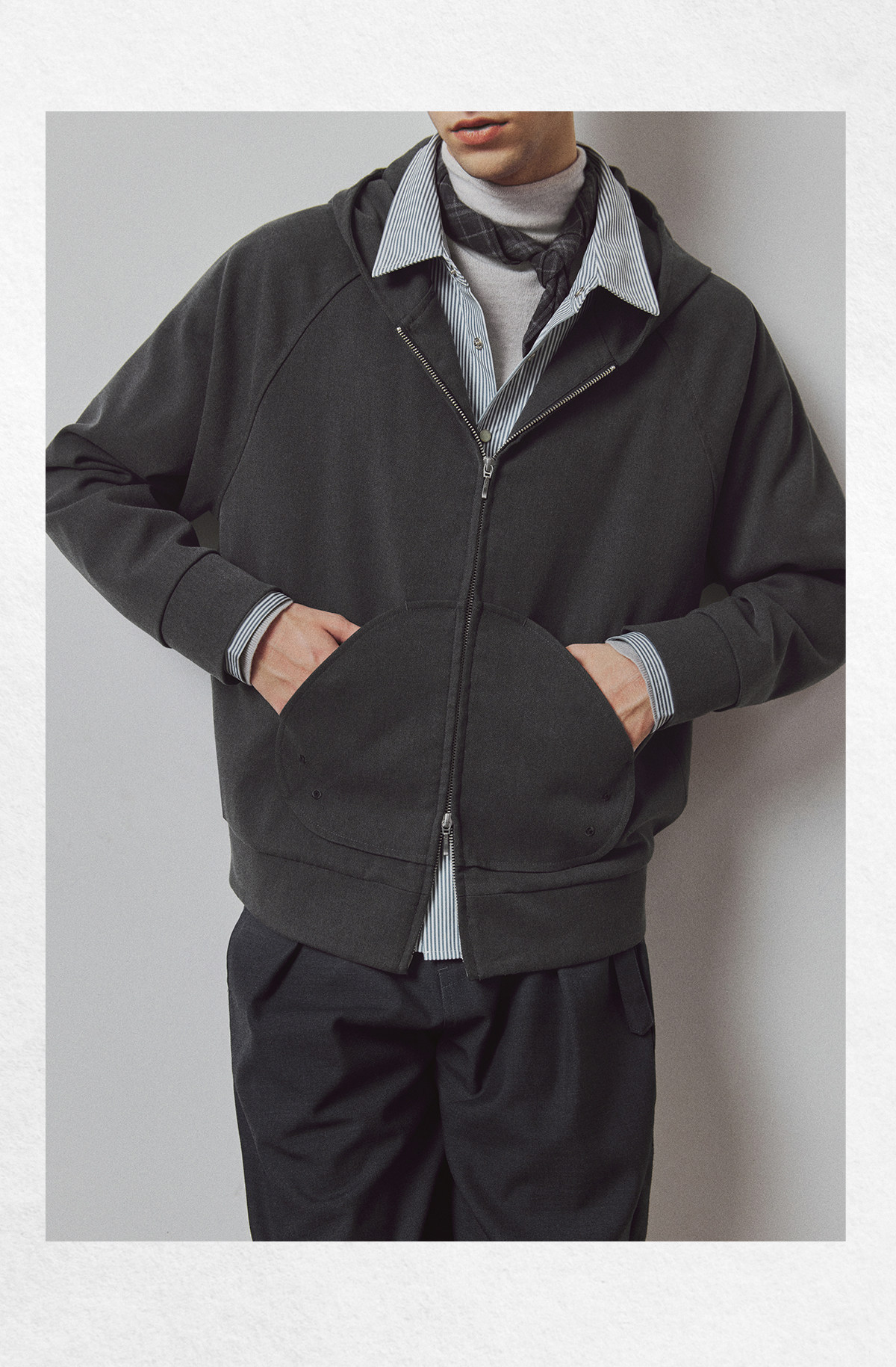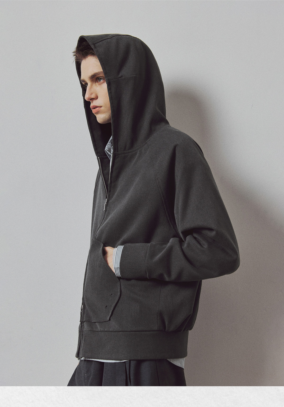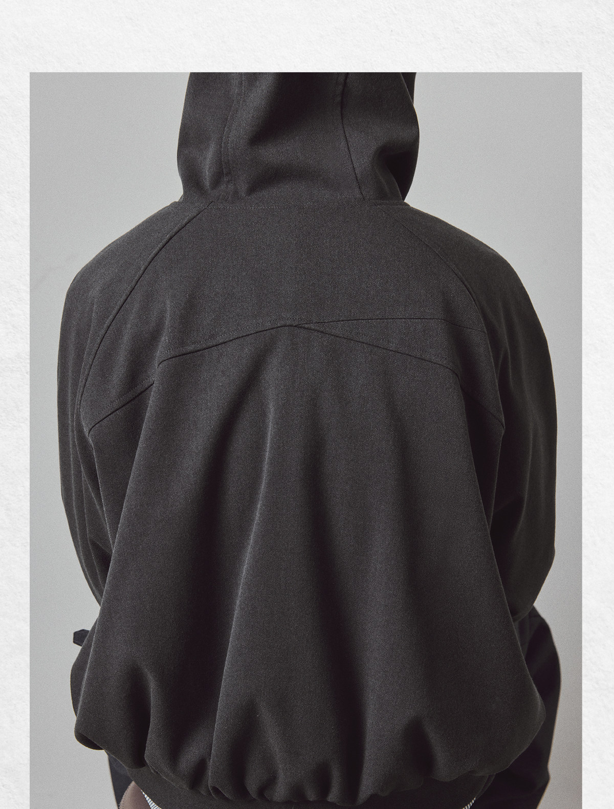 714street高端线BEHALF 弧型口袋 层次抽皱 绒面极简开衫连帽卫衣