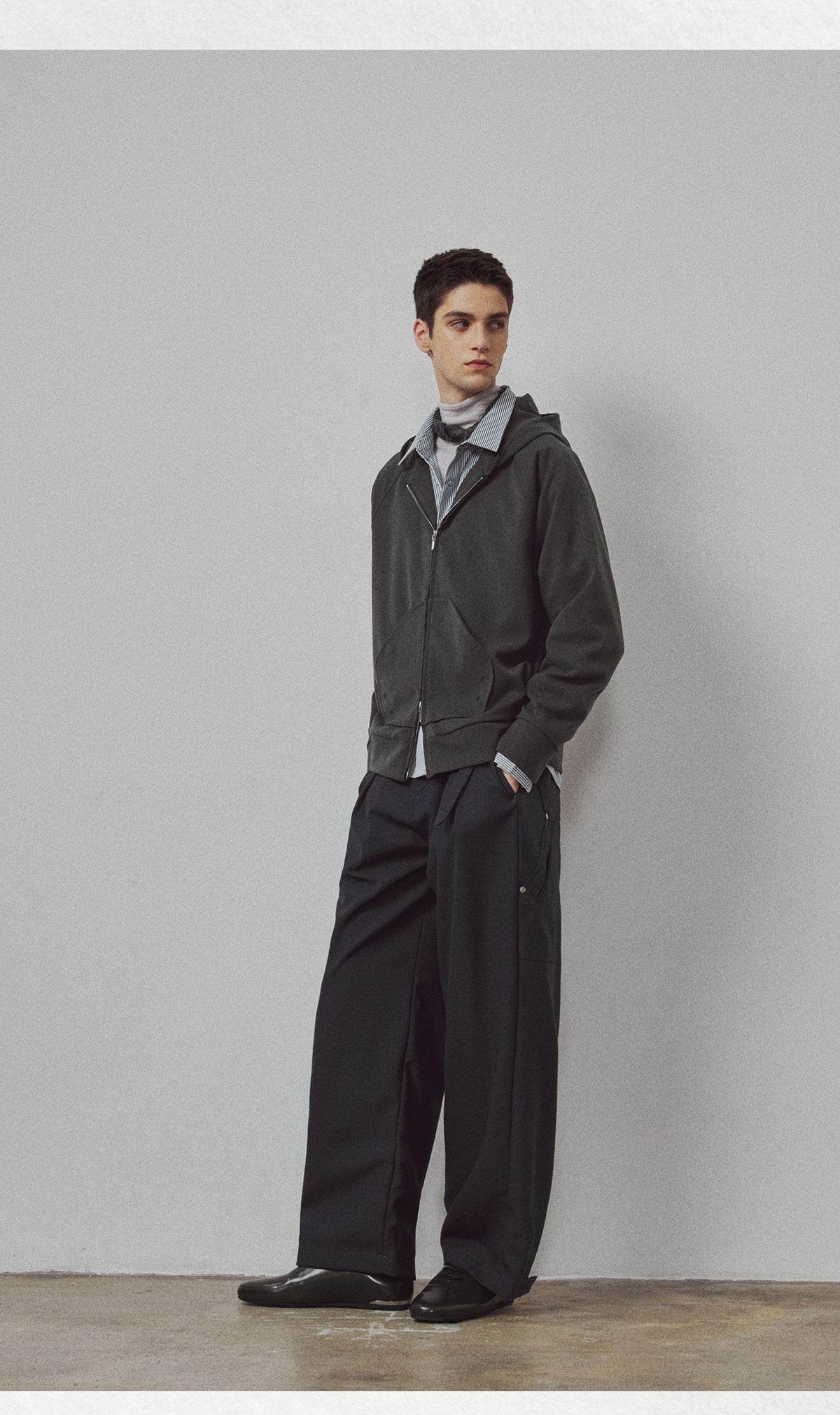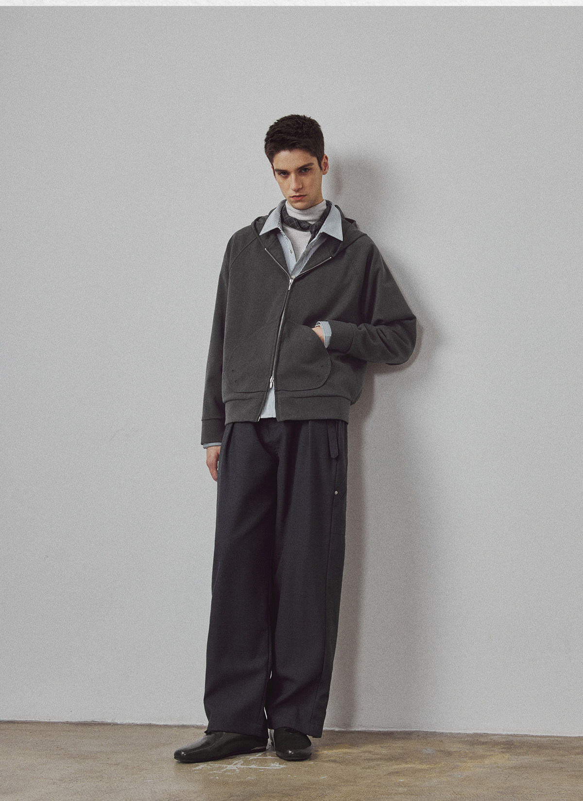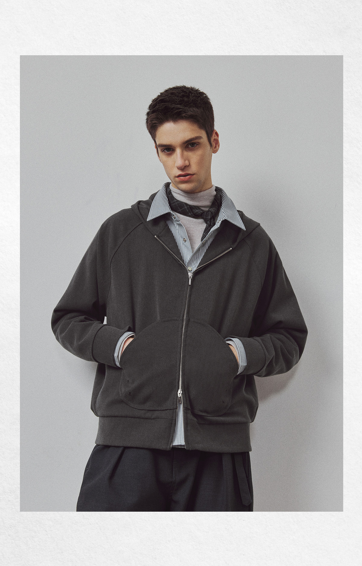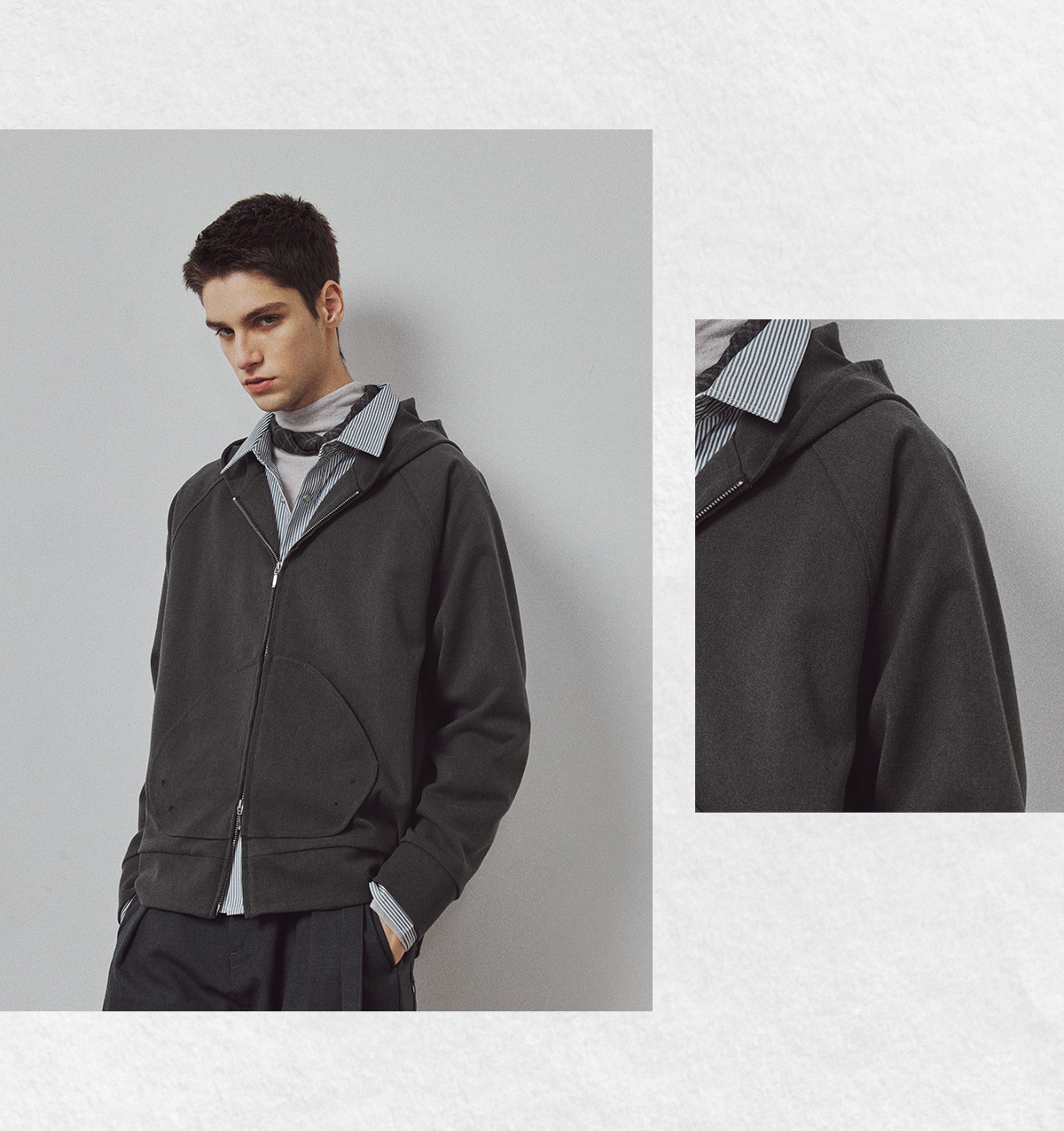 714street高端线BEHALF 弧型口袋 层次抽皱 绒面极简开衫连帽卫衣