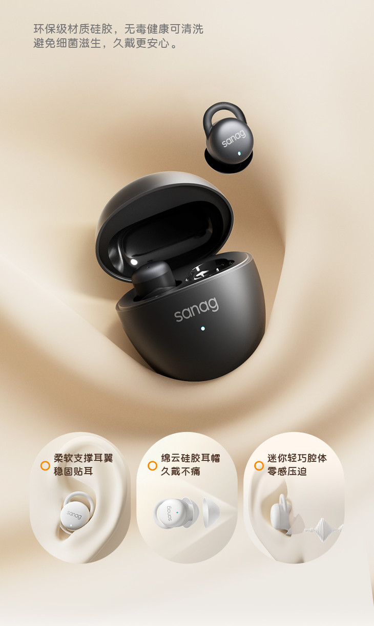 Sanag J20S睡眠豆用的是环保级绵云亲肤硅胶,不仅无毒还容易清洁,能避免细菌滋生。柔软支撑的耳翼加上迷你腔体设计,让耳机仿佛与耳朵融为一体,就算侧睡也不会压到,真正实现"零感佩戴"。在静音方面,表现也很出色,全包裹硅胶入耳结构能紧密贴合耳道,物理阻隔24dB的噪音。更厉害的是特研的睡眠模式:耳机内置的麦克风会实时捕捉环境杂音,通过DSP芯片生成反相声波精准抵消,双重降噪让周围瞬间安静下来。