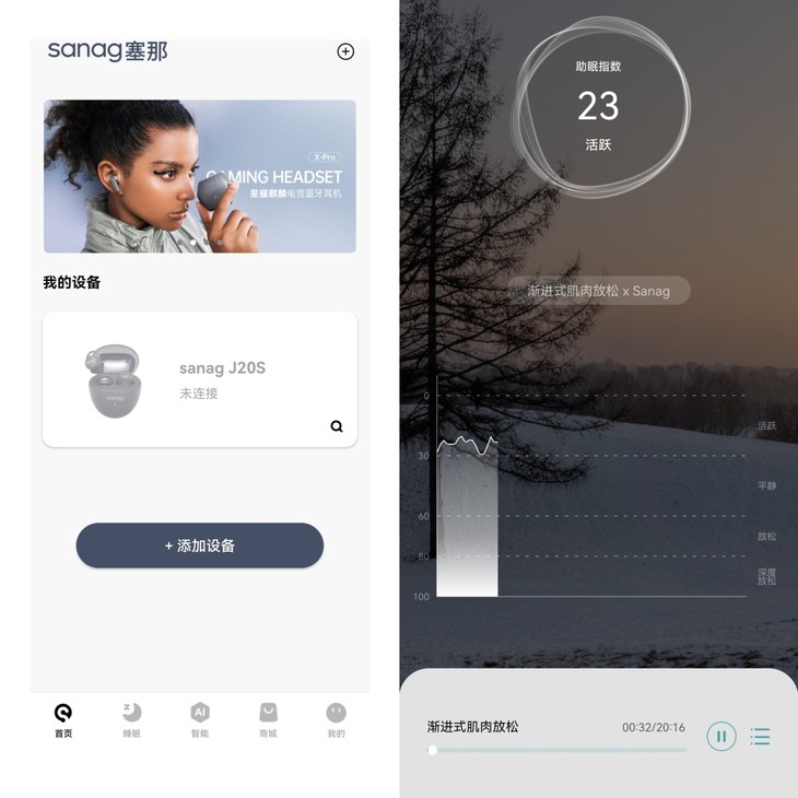 Sanag APP里还内置66+种助眠白噪音,从海浪轻吟到树叶沙沙,各种自然声音应有尽有,还搭配ASMR音效和iAwake脑波冥想课程。这些课程由专业睡眠专家与加州健康研究院联合开发,能帮助快速放松身心,让入睡如同享受一场SPA般舒适。