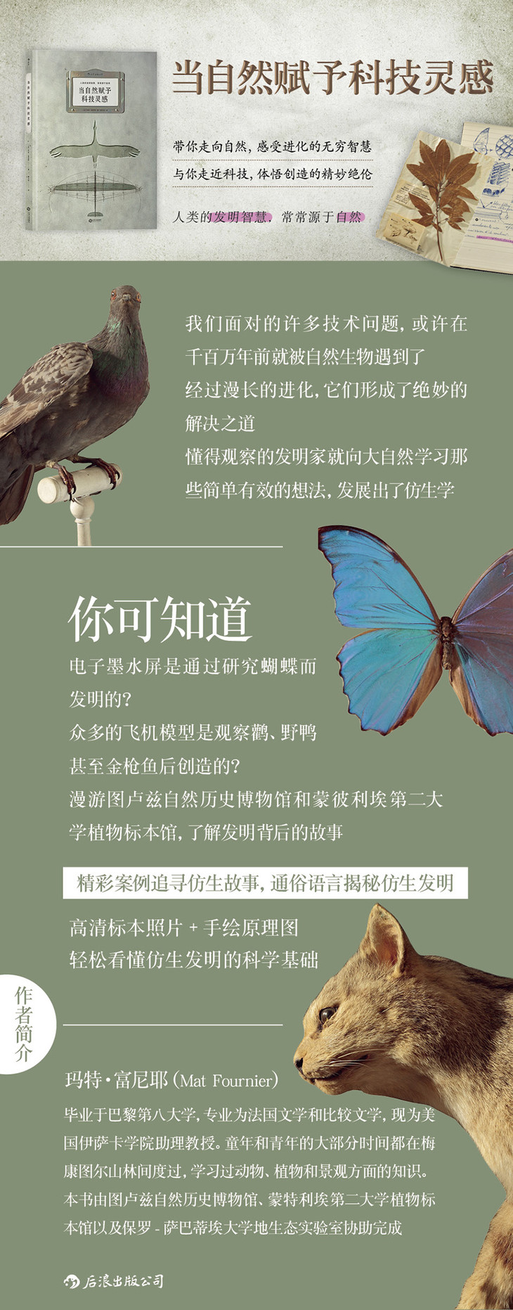 本书以精彩案例讲述植物和动物如何启发了发明家、工程师、建筑师、科学家,也讲述了仿生学如何成为现代科学研究中最有前景的学科之一。在每一个对页里,左页介绍一种植物或动物启发一种或多种仿生发明的故事,另有多个小模块,向我们展示了这种植物或动物的物种信息、奇特策略以及由它们引发的“想象出的发明”;右页则是该植物或动物的标本照片,以及由插画师蒂特瓦内(Titwane)绘制的发明原理图。