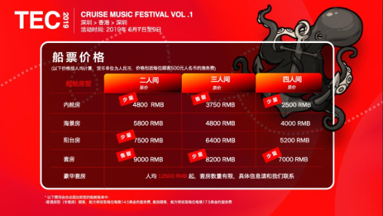 2019电音节费用: 9600元/间舱起