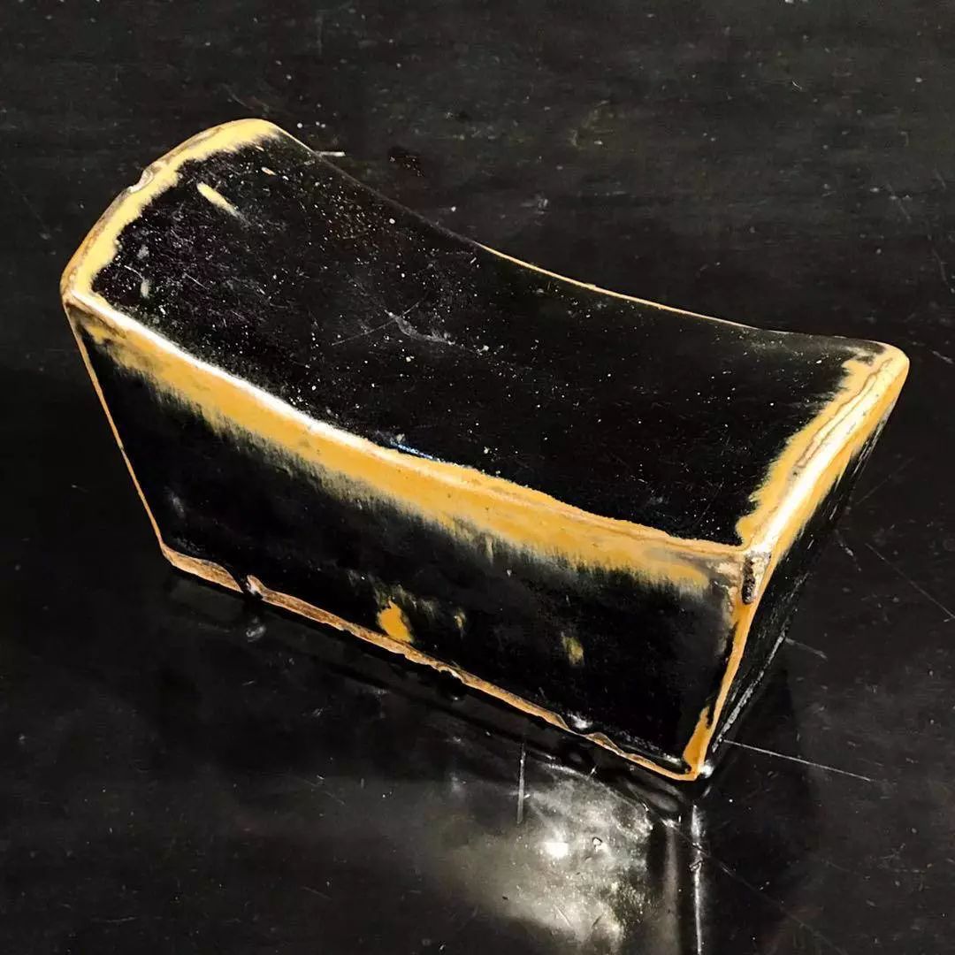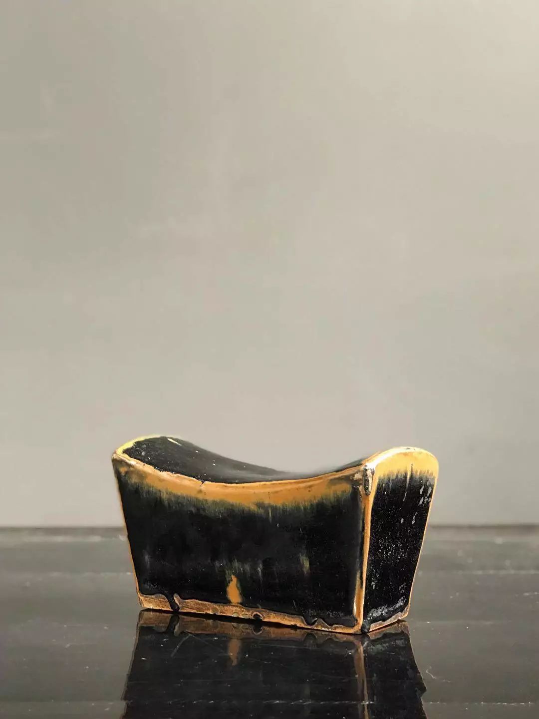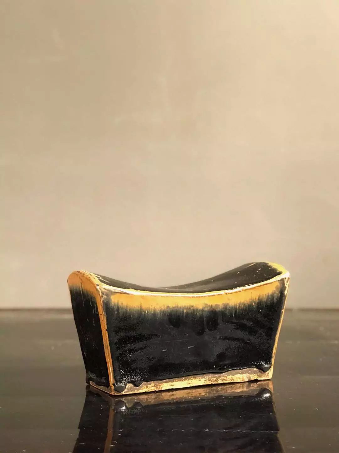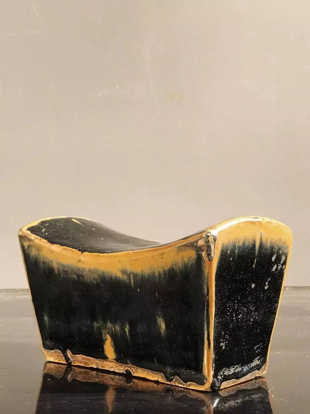 今天我们分享的正是一件产于山西或陕西的黑釉瓷枕,这件瓷枕造以双头翘起之元宝为原型,塑造出简约枕头造型,全器除底部露胎外,罩着一层乌亮润泽的黑釉,转折釉薄处显深褐色,整体造型简约大气,釉质肥厚靓丽,釉表自然磨损痕与浑厚包浆皮壳温润细腻,风韵犹存,如今摆放于任何当代空间,有如一件当代抽像极简风格雕塑,况且是收藏历代中国陶瓷者不容错过之经典老瓷枕。