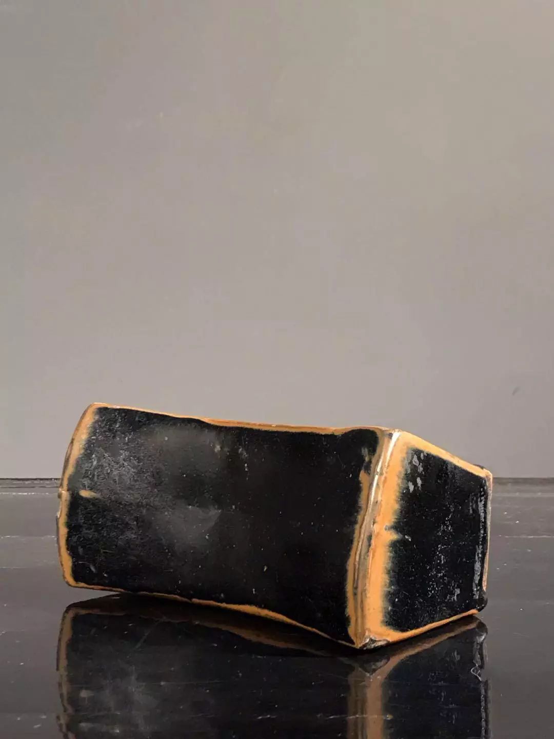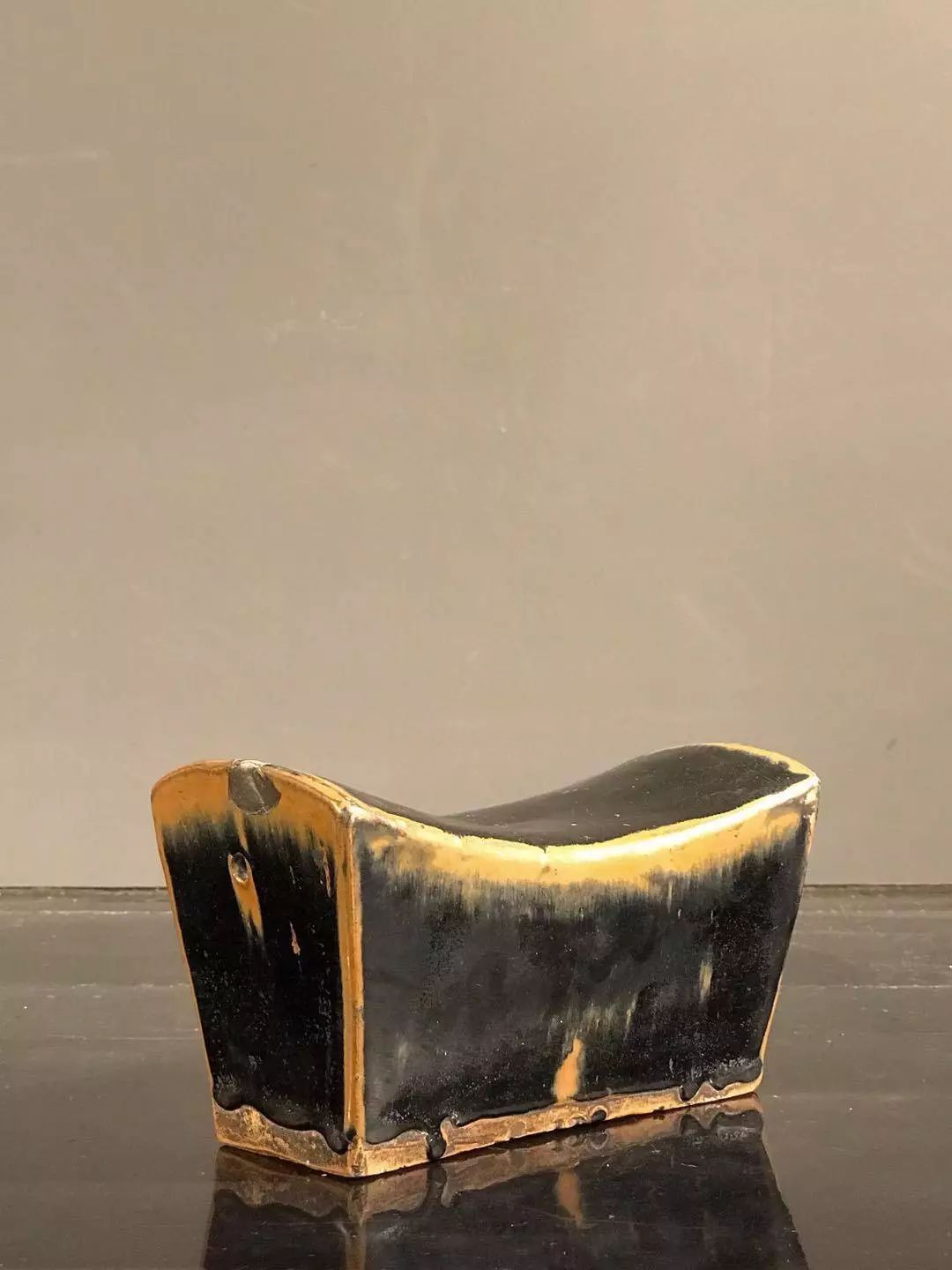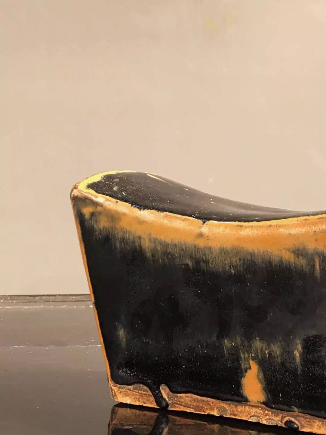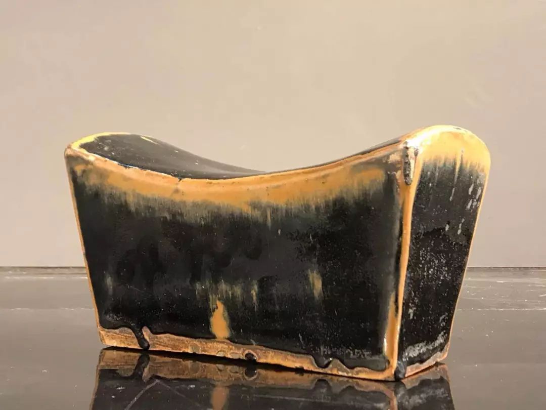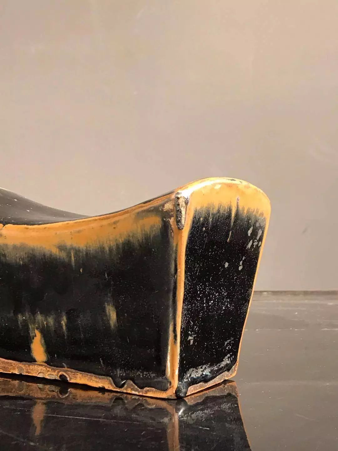 今天我们分享的正是一件产于山西或陕西的黑釉瓷枕,这件瓷枕造以双头翘起之元宝为原型,塑造出简约枕头造型,全器除底部露胎外,罩着一层乌亮润泽的黑釉,转折釉薄处显深褐色,整体造型简约大气,釉质肥厚靓丽,釉表自然磨损痕与浑厚包浆皮壳温润细腻,风韵犹存,如今摆放于任何当代空间,有如一件当代抽像极简风格雕塑,况且是收藏历代中国陶瓷者不容错过之经典老瓷枕。