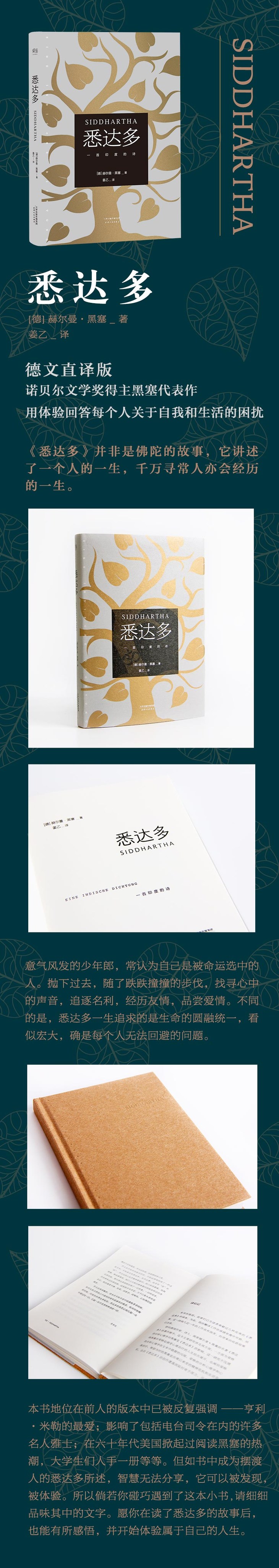 因为黑塞我喜爱上一种独白式的文体,像日记,也像书信;像孤独时自己与自己的对话。黑塞的文学可能影响了一代的青年走向追寻自然、流浪、孤独,追寻自我的觉醒。--蒋勋读完黑塞小说《悉达多》,有关修道者的书。他游历天下,*后坐在河边,师从于河流,流水日夜教会他。我想的,河流就是时间的形象,时间是宇宙秘密的源泉。永远流逝并且歌唱。--周云蓬他(悉达多)象征那些寻求真理的人--那些寻求自我之真理的人。赫尔曼黑塞已然感受到我们这一代人那种内心的骚动、那种青春时代自寻其路的固有需求;这种需求让我们每个人都必须索取天经地义属于我们自己的东西:我们自己的生命。黑塞的这种先知先觉也必然启发未来时代的人们。--保罗科埃略人之一生,总有所惑。惑于理者心苦,惑于事者身苦,理事皆惑者活着已是大苦聚。悉达多却惑于生命自身,现成的答案经验皆不可用,于是悉达多流浪于声色犬马事业爱情之中,直到有一天遇见自己而豁然开朗,生命之惑顿除。这是每个追求自身生命真相的人必须面对的:生从何来,死往何处?--明奘禅师