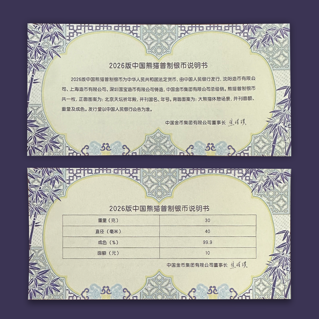 精美包装:采用独立卡片包装形式,银币放置位置为双面可视化设计,既方便欣赏可爱的熊猫图案,又能观察到熊猫币本身的细致工艺。