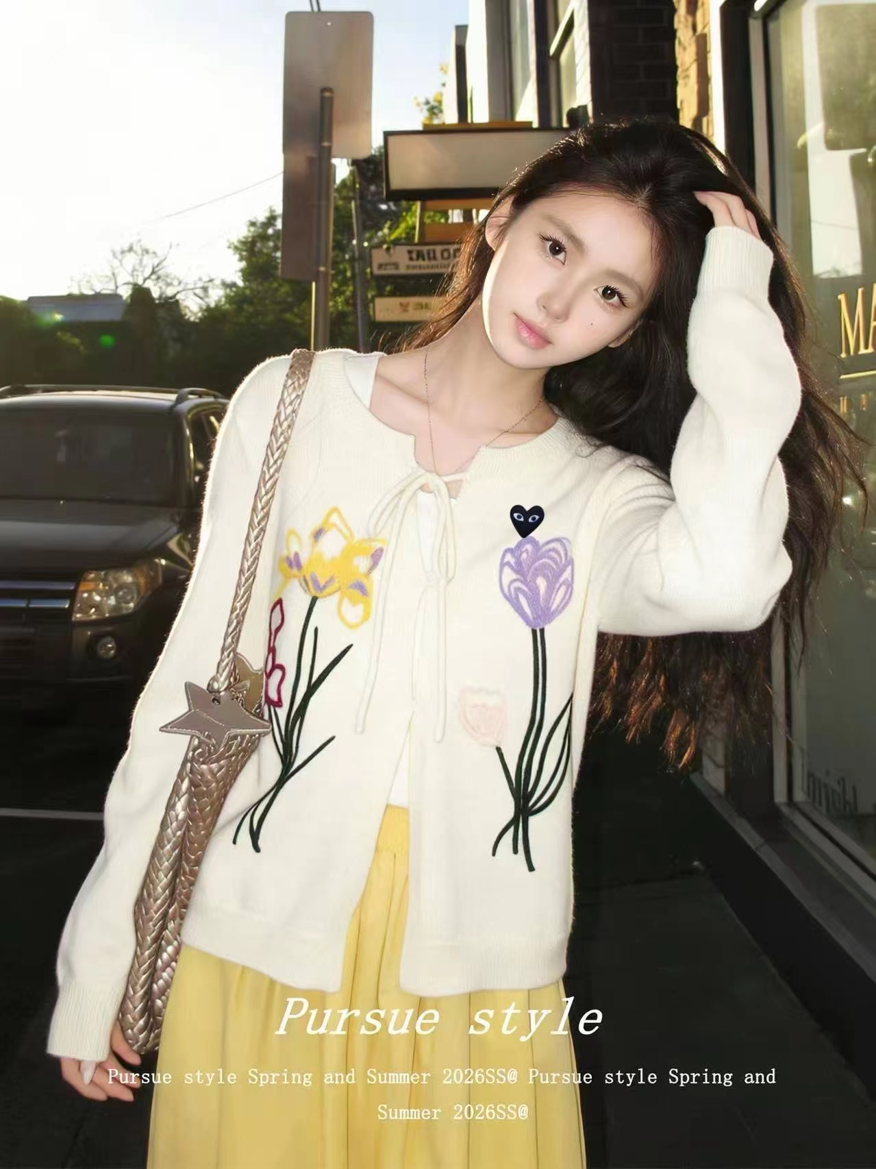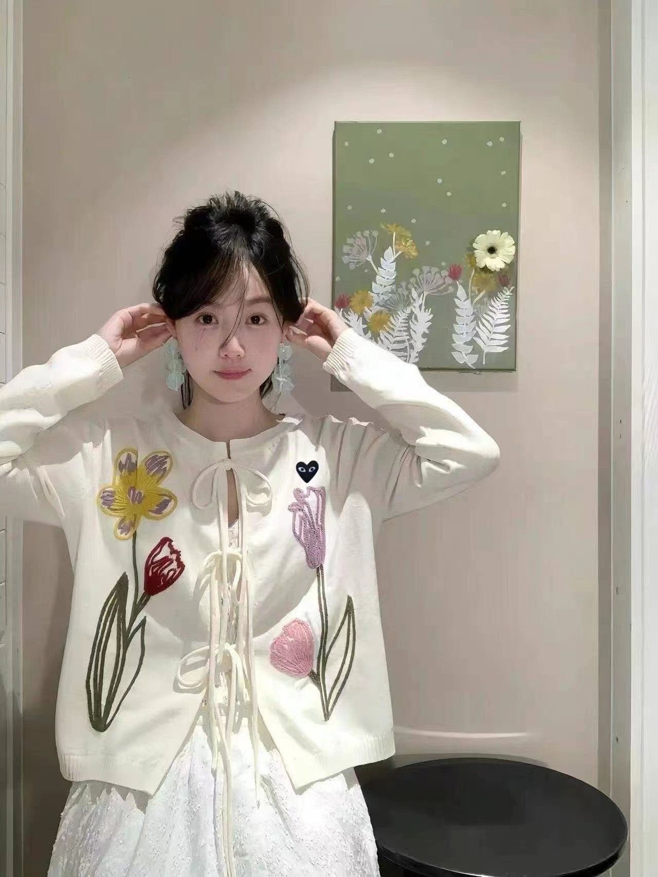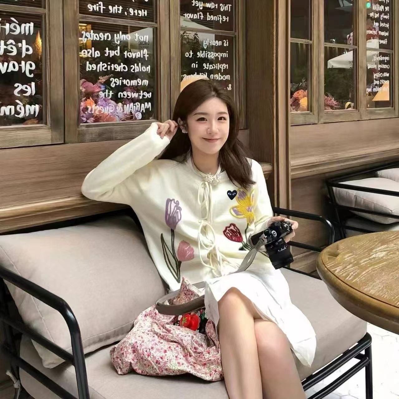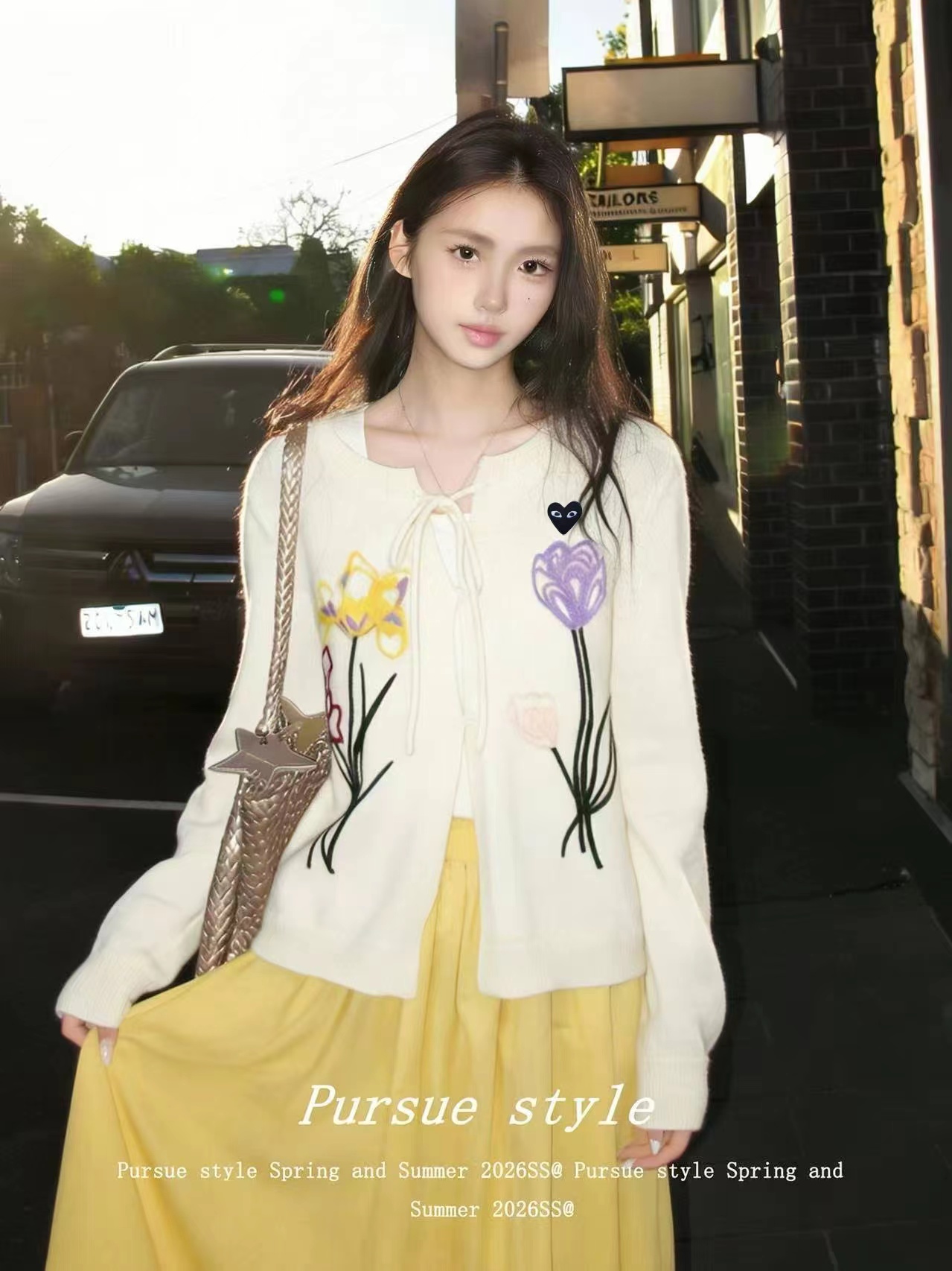 春日氛围感刺绣针织开衫这款开衫是温柔奶油风的代表,非常适合早春穿搭,自带清新治愈感宽松落肩的针织开衫版型,软糯亲肤的针织面料,兼具保暖性与慵懒感,对各种身材都很友好。领口做了小V型+系带设计,增添了一丝甜美与灵动,还能修饰颈部线条。衣身正面有大面积手绘风花卉刺绣,明黄色鸢尾、淡紫色郁金香与浅粉小花错落分布,用深绿色茎秆连接,色彩明快又柔和,充满春日生机感。左胸还有一个小巧的黑底爱心刺绣点缀,增加了俏皮感与辨识度。两侧设有实用口袋,方便放置小物件;袖口与下摆做了罗纹收边,既保证了版型挺括,又能防风保暖。图中搭配同色系黄色百褶裙,整体色调和谐统一,营造出元气少女感;也可搭配牛仔裤、半身裙,适配通勤、约会、出游等多种场景。奶油白底色+清新花卉刺绣,让它成为减龄神器,温柔又不失活泼,非常适合打造“韩系小姐姐”或“日系清新”的穿搭风格。