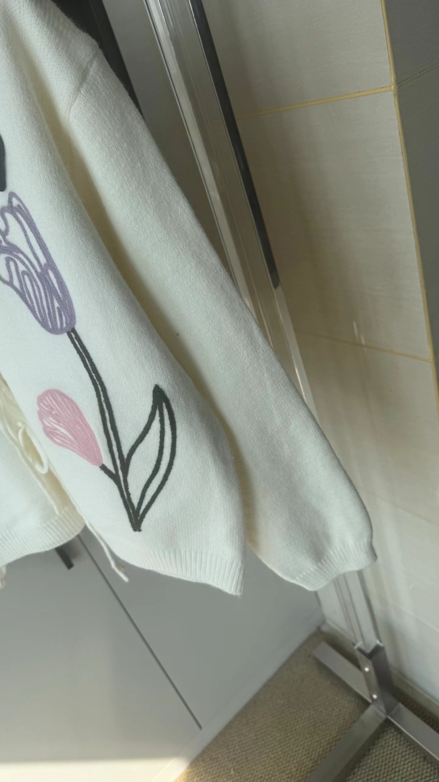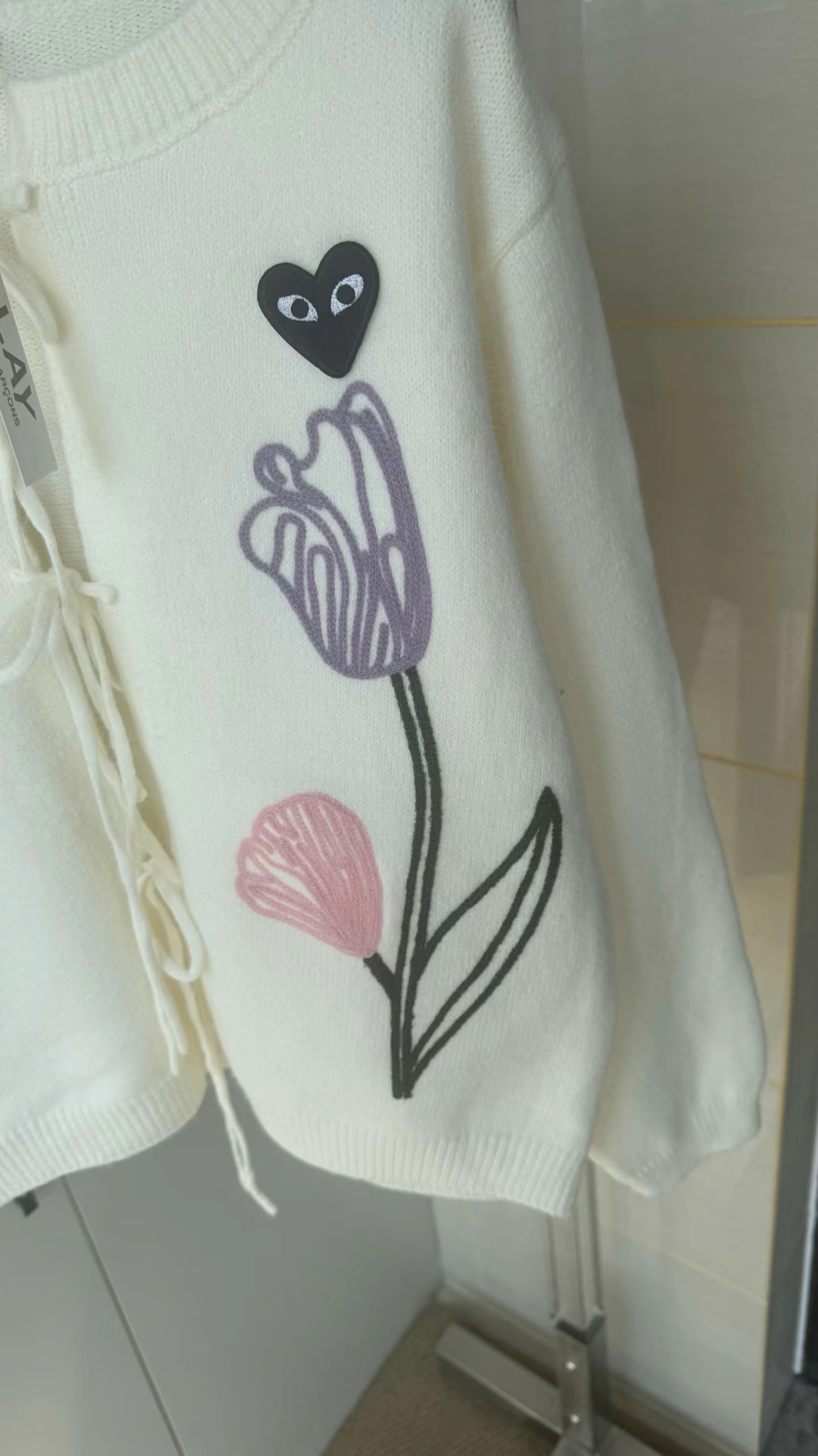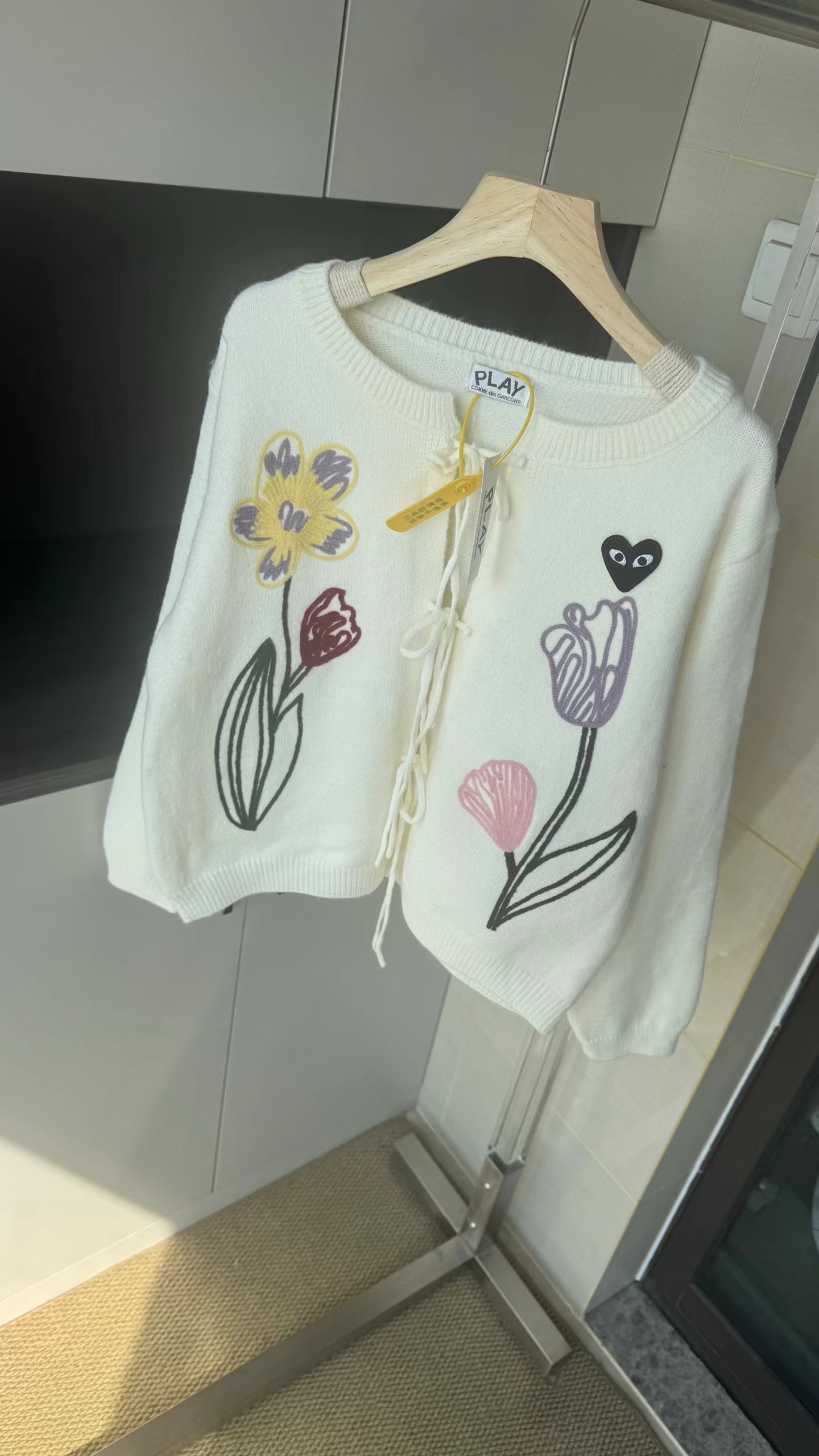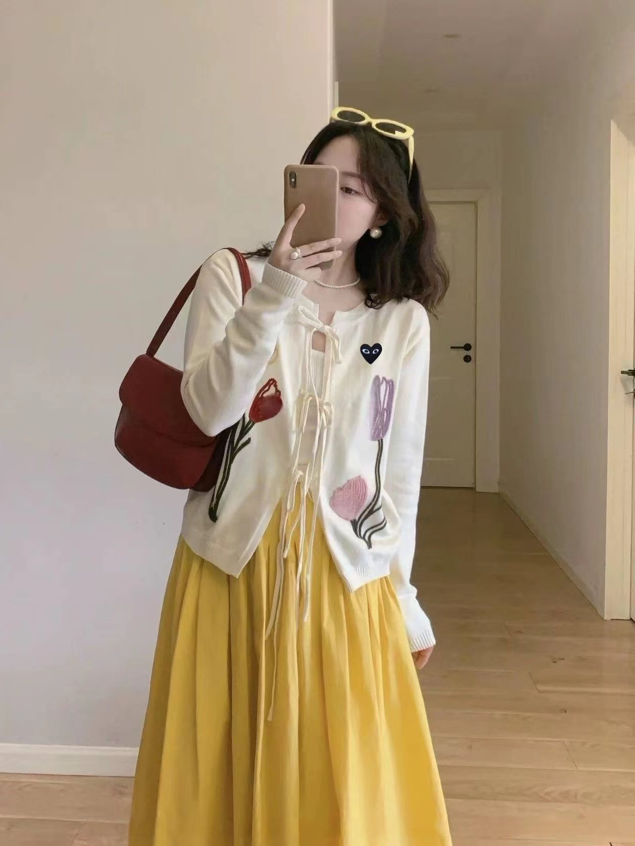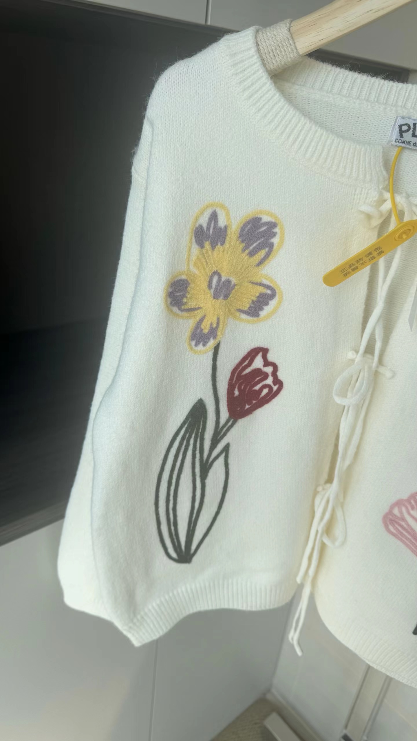 春日氛围感刺绣针织开衫这款开衫是温柔奶油风的代表,非常适合早春穿搭,自带清新治愈感宽松落肩的针织开衫版型,软糯亲肤的针织面料,兼具保暖性与慵懒感,对各种身材都很友好。领口做了小V型+系带设计,增添了一丝甜美与灵动,还能修饰颈部线条。衣身正面有大面积手绘风花卉刺绣,明黄色鸢尾、淡紫色郁金香与浅粉小花错落分布,用深绿色茎秆连接,色彩明快又柔和,充满春日生机感。左胸还有一个小巧的黑底爱心刺绣点缀,增加了俏皮感与辨识度。两侧设有实用口袋,方便放置小物件;袖口与下摆做了罗纹收边,既保证了版型挺括,又能防风保暖。图中搭配同色系黄色百褶裙,整体色调和谐统一,营造出元气少女感;也可搭配牛仔裤、半身裙,适配通勤、约会、出游等多种场景。奶油白底色+清新花卉刺绣,让它成为减龄神器,温柔又不失活泼,非常适合打造“韩系小姐姐”或“日系清新”的穿搭风格。