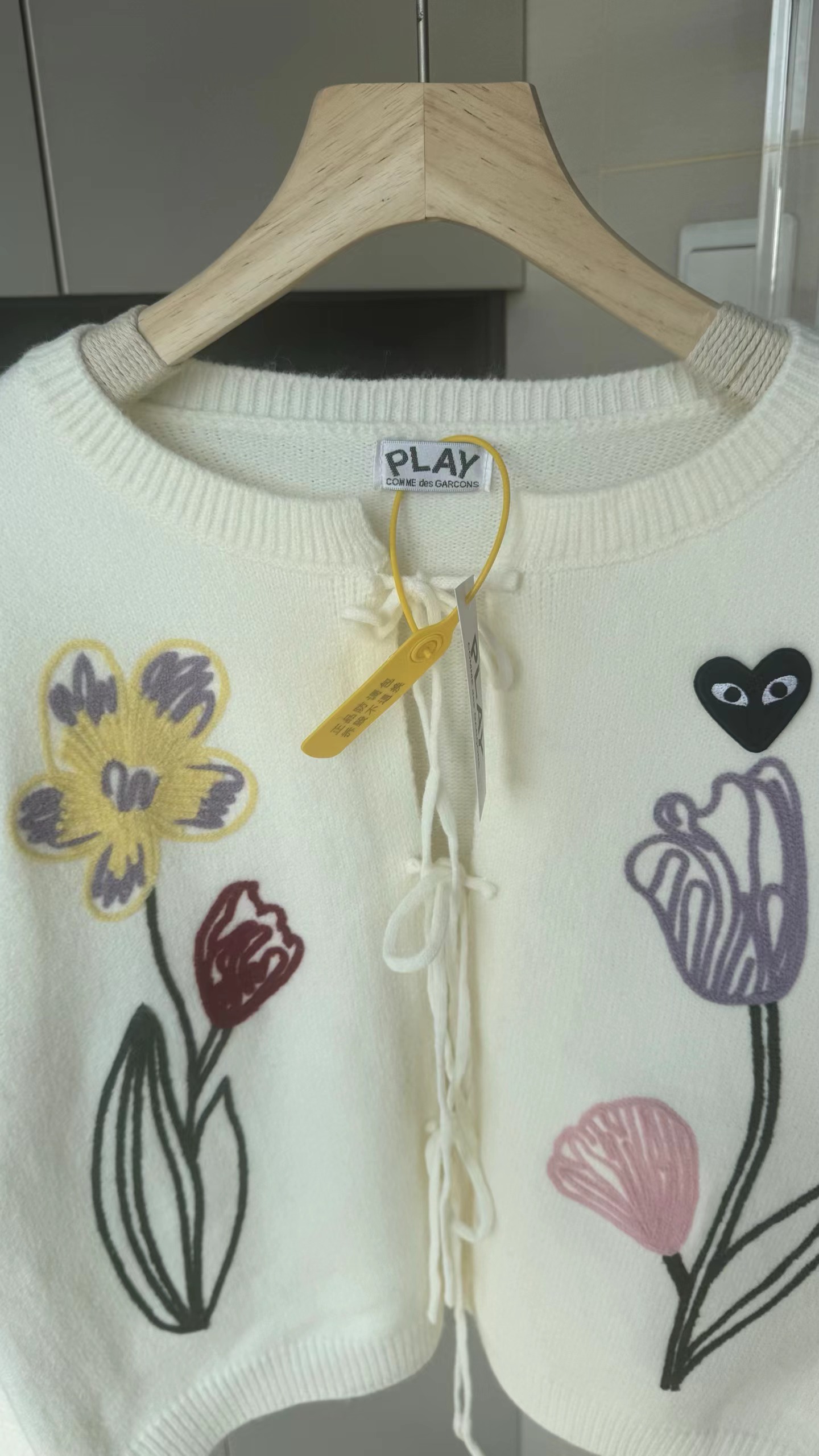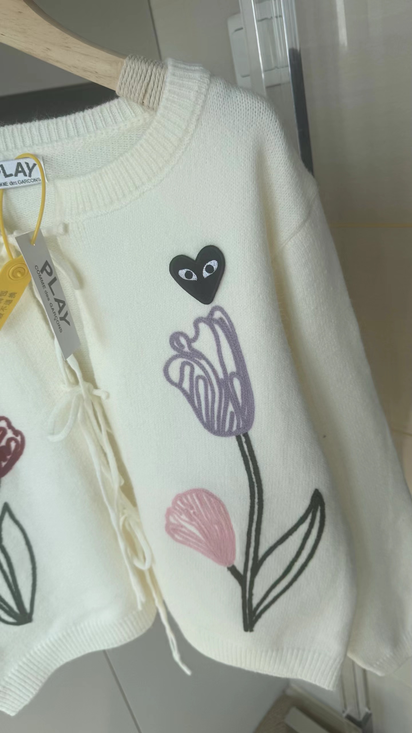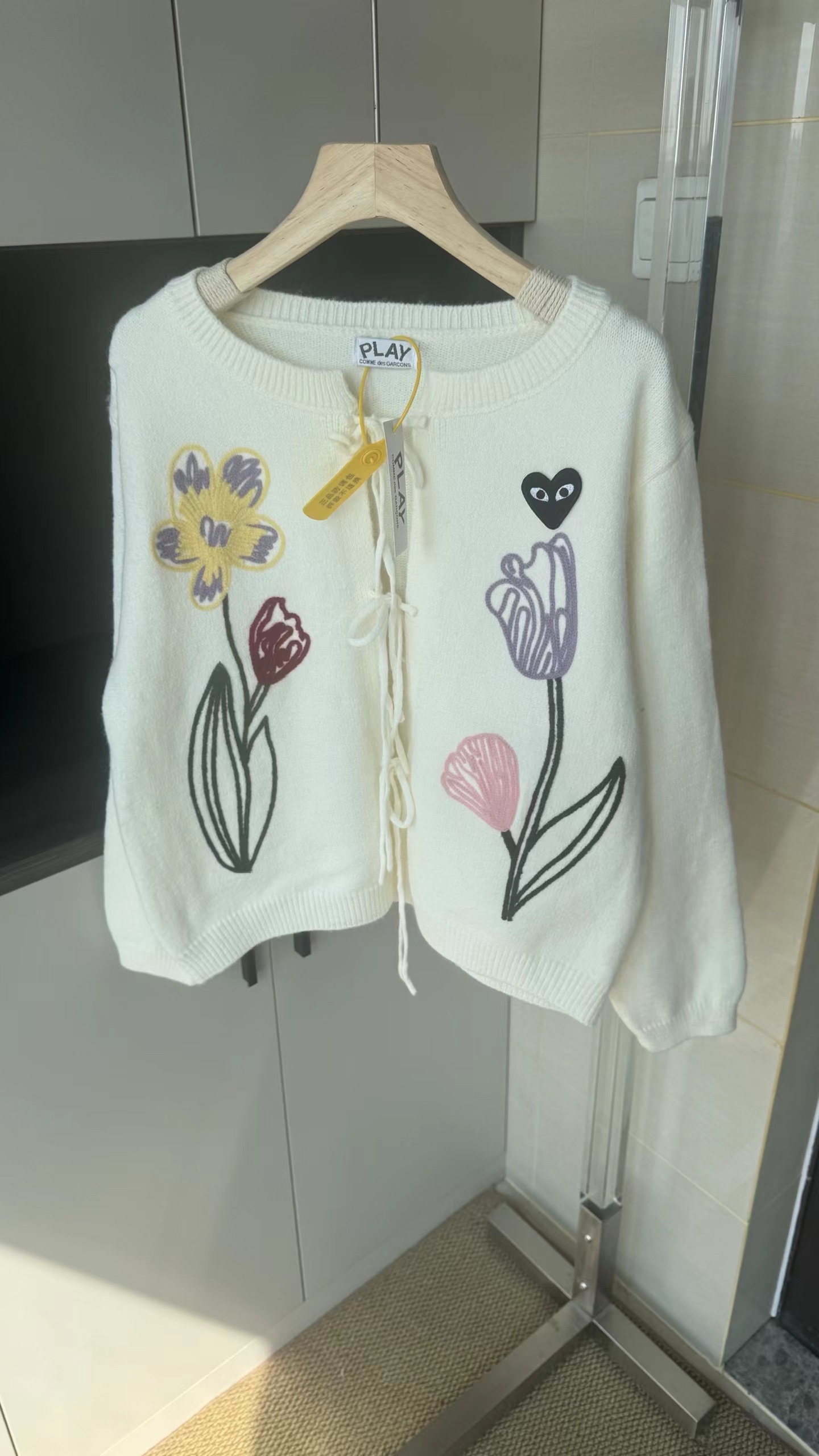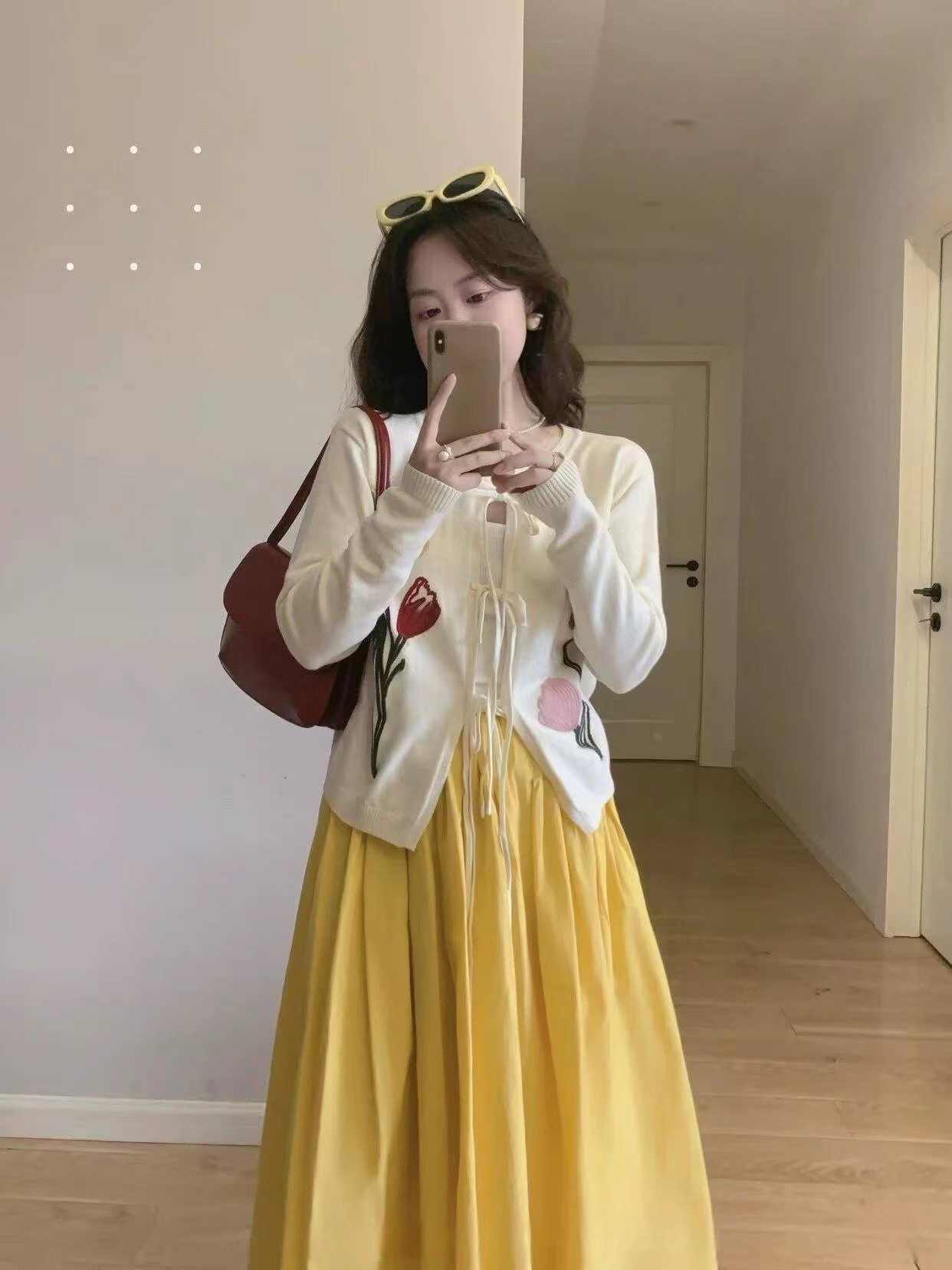 春日氛围感刺绣针织开衫这款开衫是温柔奶油风的代表,非常适合早春穿搭,自带清新治愈感宽松落肩的针织开衫版型,软糯亲肤的针织面料,兼具保暖性与慵懒感,对各种身材都很友好。领口做了小V型+系带设计,增添了一丝甜美与灵动,还能修饰颈部线条。衣身正面有大面积手绘风花卉刺绣,明黄色鸢尾、淡紫色郁金香与浅粉小花错落分布,用深绿色茎秆连接,色彩明快又柔和,充满春日生机感。左胸还有一个小巧的黑底爱心刺绣点缀,增加了俏皮感与辨识度。两侧设有实用口袋,方便放置小物件;袖口与下摆做了罗纹收边,既保证了版型挺括,又能防风保暖。图中搭配同色系黄色百褶裙,整体色调和谐统一,营造出元气少女感;也可搭配牛仔裤、半身裙,适配通勤、约会、出游等多种场景。奶油白底色+清新花卉刺绣,让它成为减龄神器,温柔又不失活泼,非常适合打造“韩系小姐姐”或“日系清新”的穿搭风格。