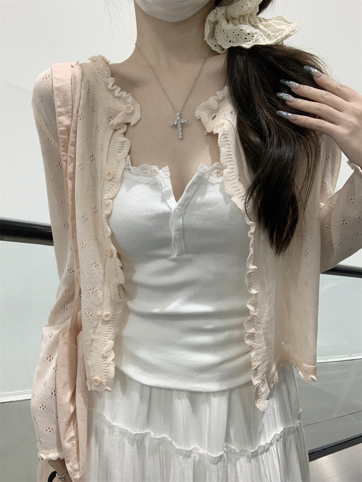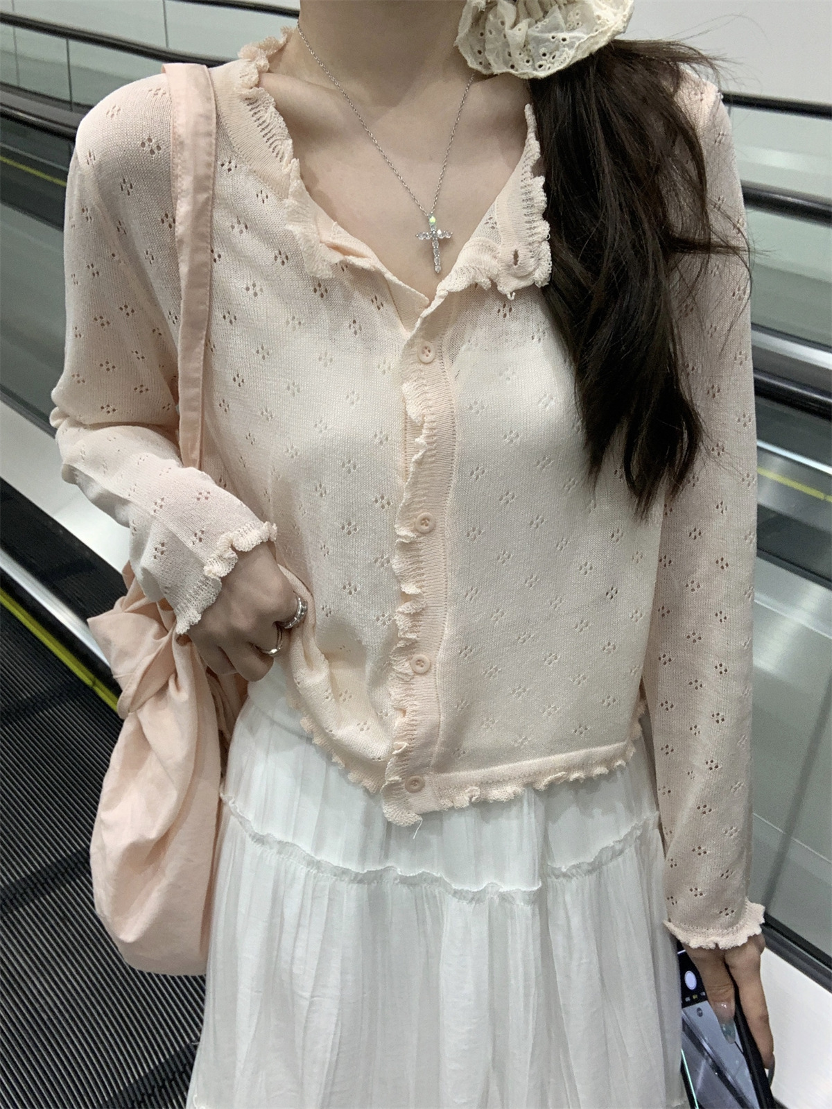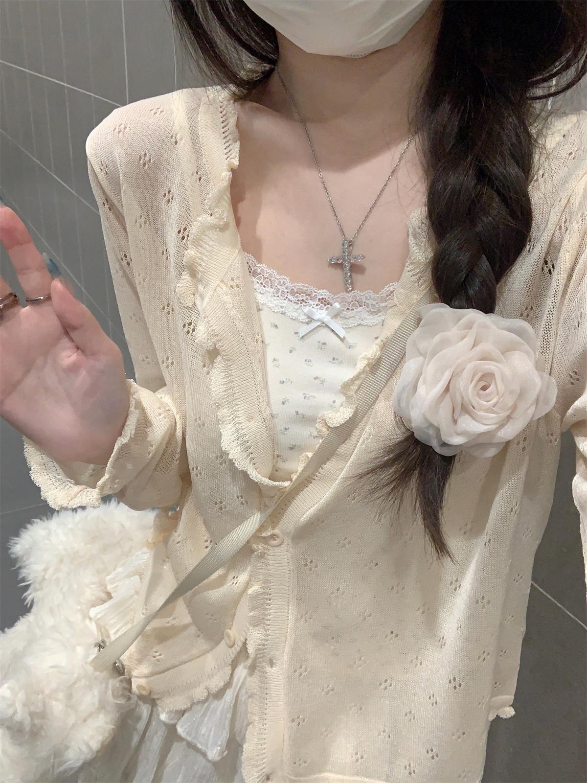 【温柔纯欲风❗️薄款镂空针织开衫】法式氛围感针织衫「软 fufu 的奶油开衫!温柔到骨子里」秒变纯欲氛围感美女,甜妹约会穿搭天花板,别致宽松短款长袖开衫上衣L